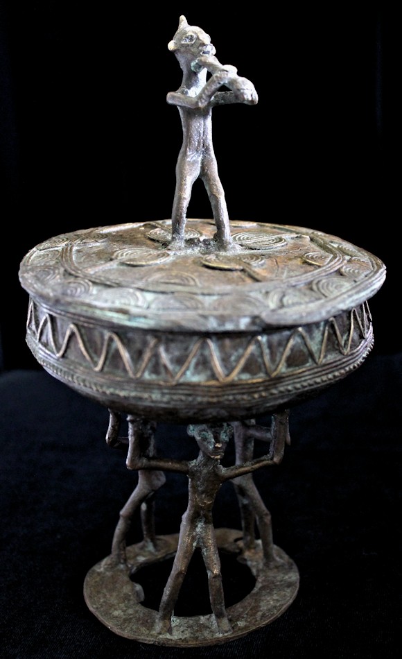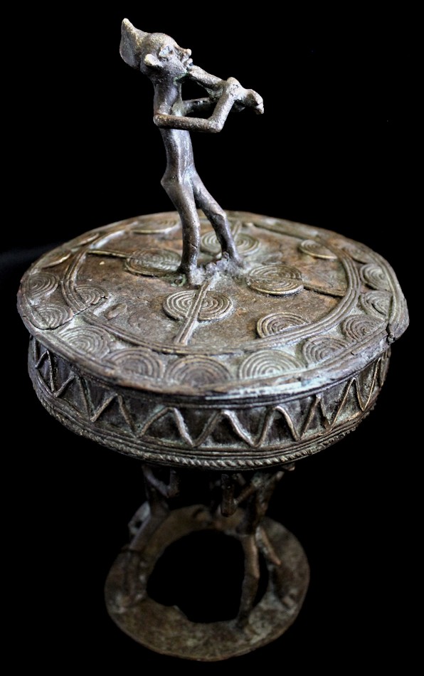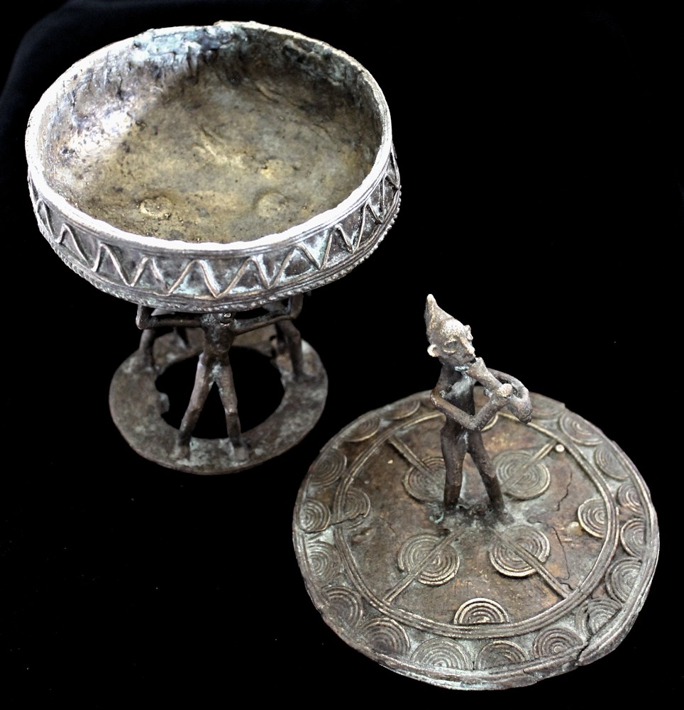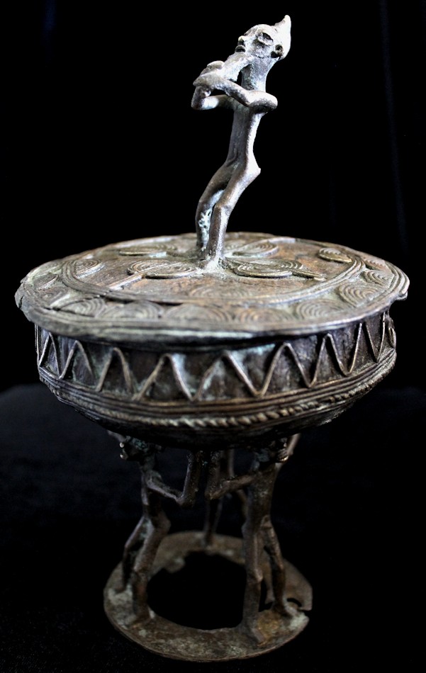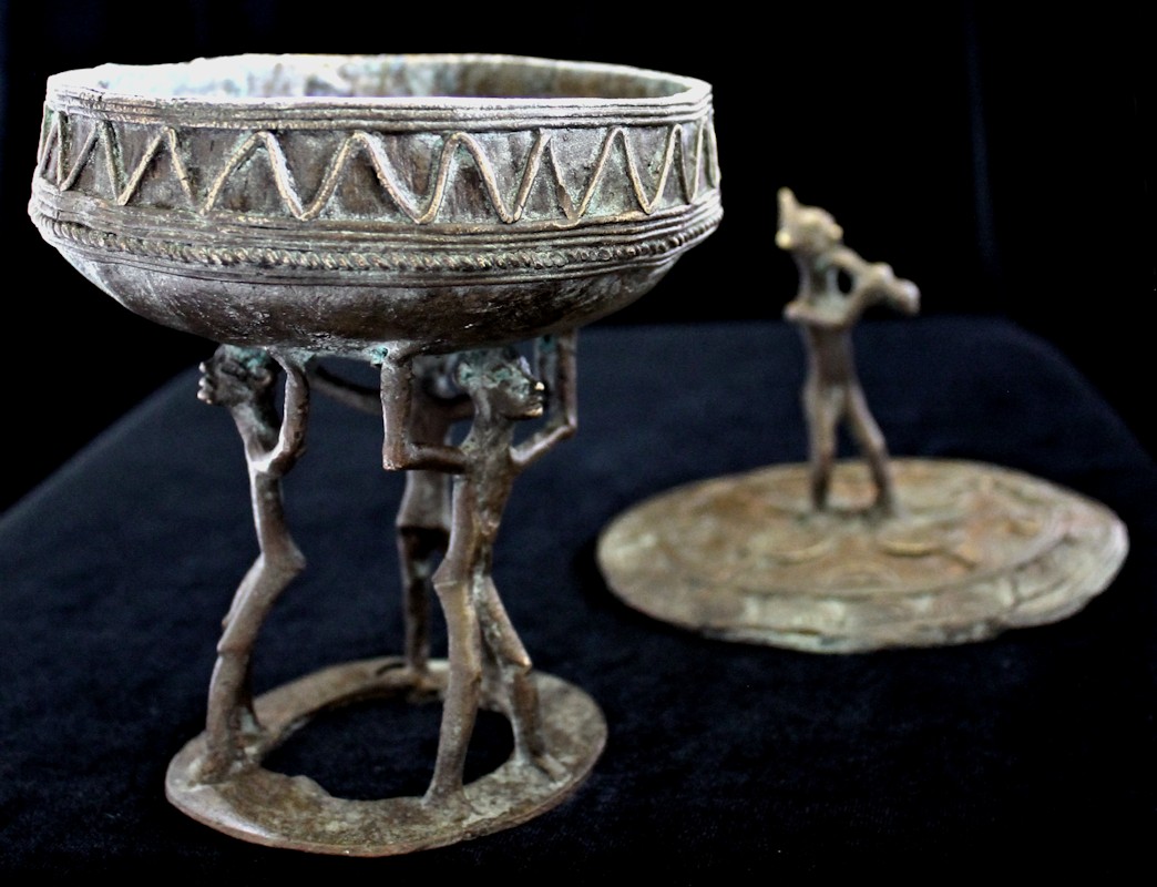 Cast using the lost wax methold, the container presents a musical figure atop its lid, playing a flute-like instrument. The caryatid base of the piece features 3 figures, their arms upraised supporting the bowl-shaped vessel above their heads. The lid is liberally decorated, primarily with patterns of raised concentric circles & half-circles. The outer sidewall of the bowl bears a raised zig-zag motif, with a strand of "rope" encircling the bowl's circumference.