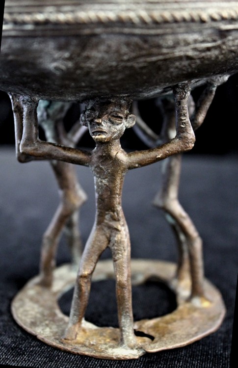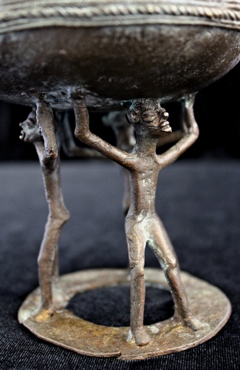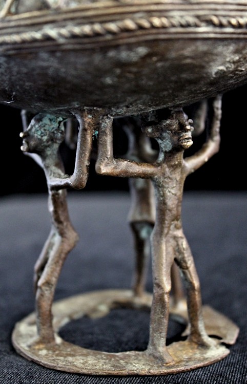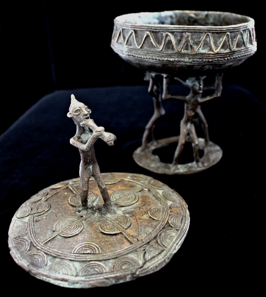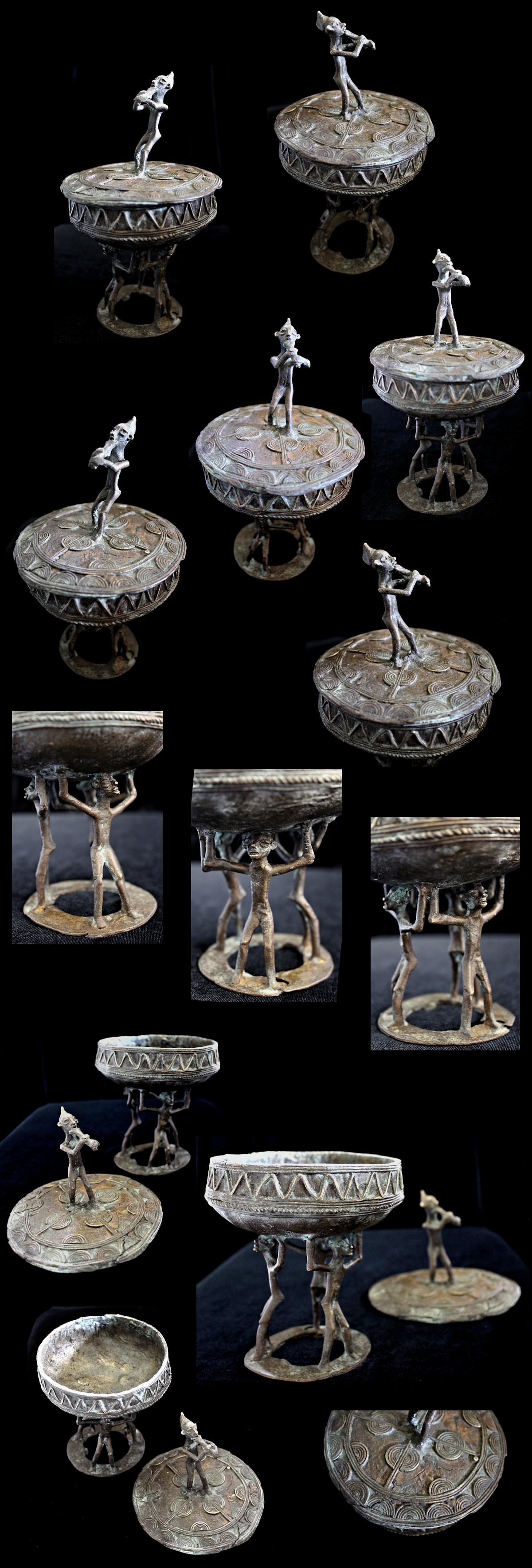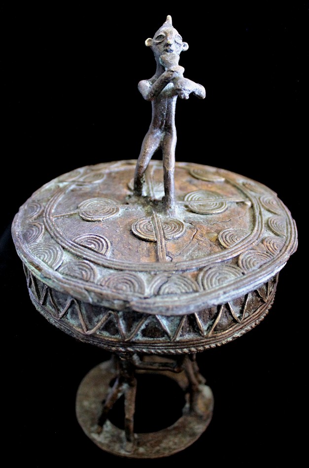 Cast using the lost wax methold, the container presents a musical figure atop its lid, playing a flute-like instrument. The caryatid base of the piece features 3 figures, their arms upraised supporting the bowl-shaped vessel above their heads. The lid is liberally decorated, primarily with patterns of raised concentric circles & half-circles. The outer sidewall of the bowl bears a raised zig-zag motif, with a strand of "rope" encircling the bowl's circumference.