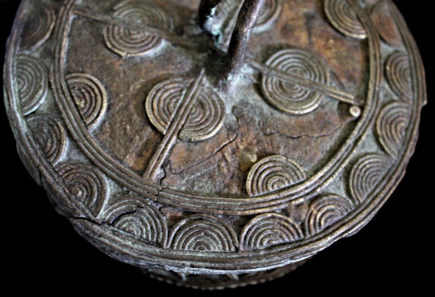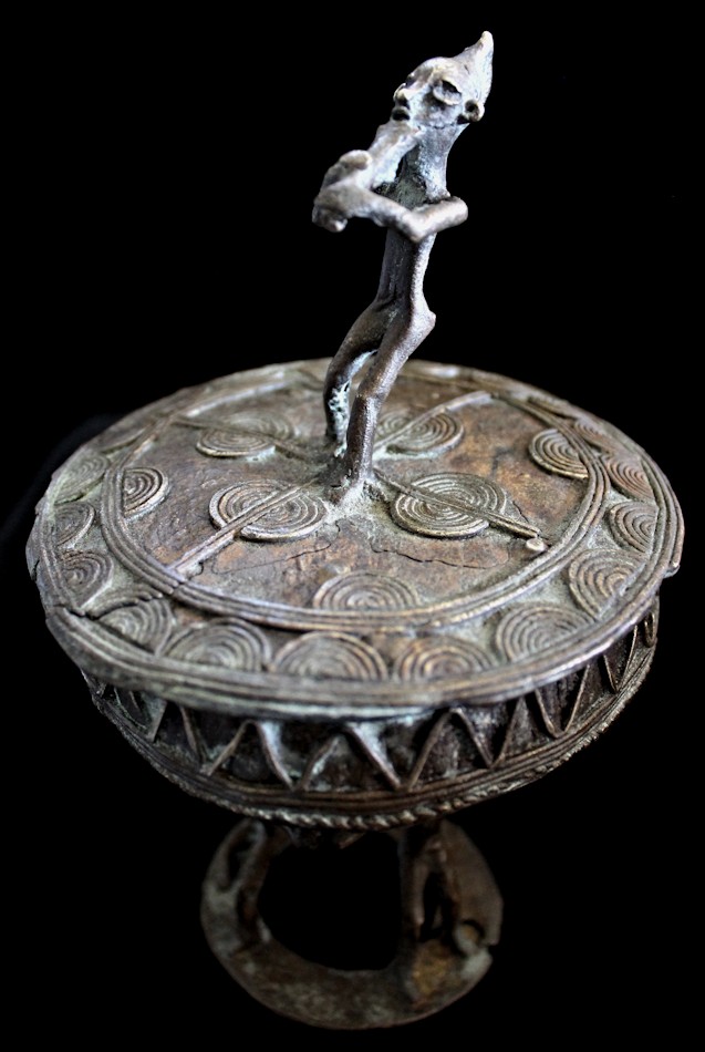 On offer from our personal collection is this charming bronze/brass figural lidded container from the Ashanti peoples of Ghana. The Ashanti are known for their skilled & imaginative metalwork, & are prolific in their production of objects known as "gold weights" & various metal boxes, including a variety of lidded container known as a kuduo.