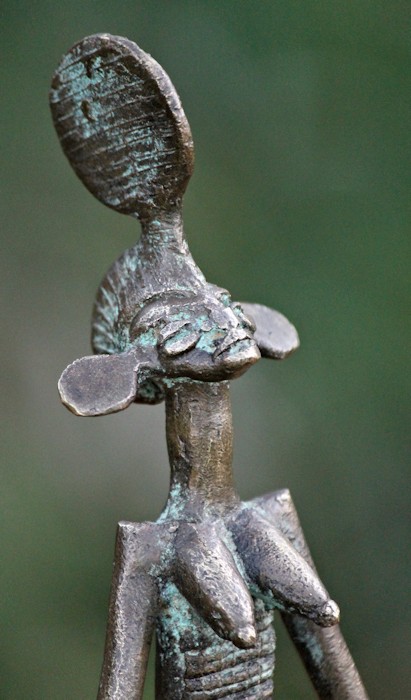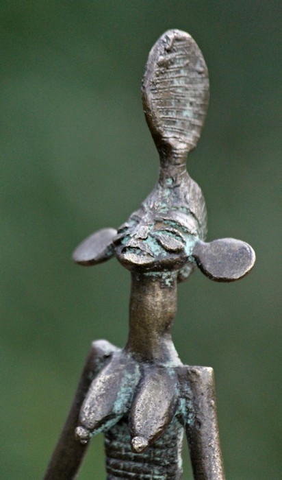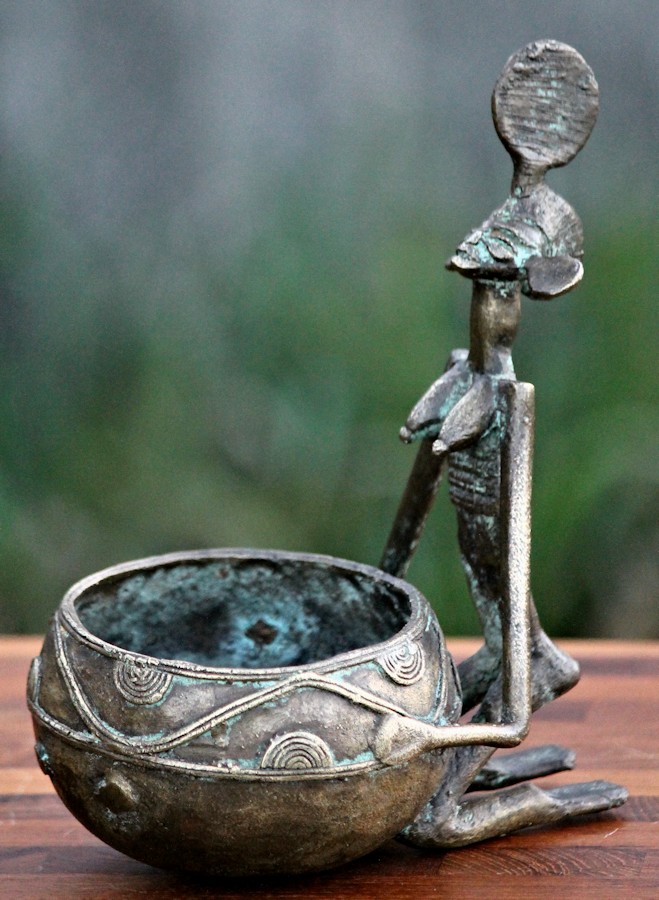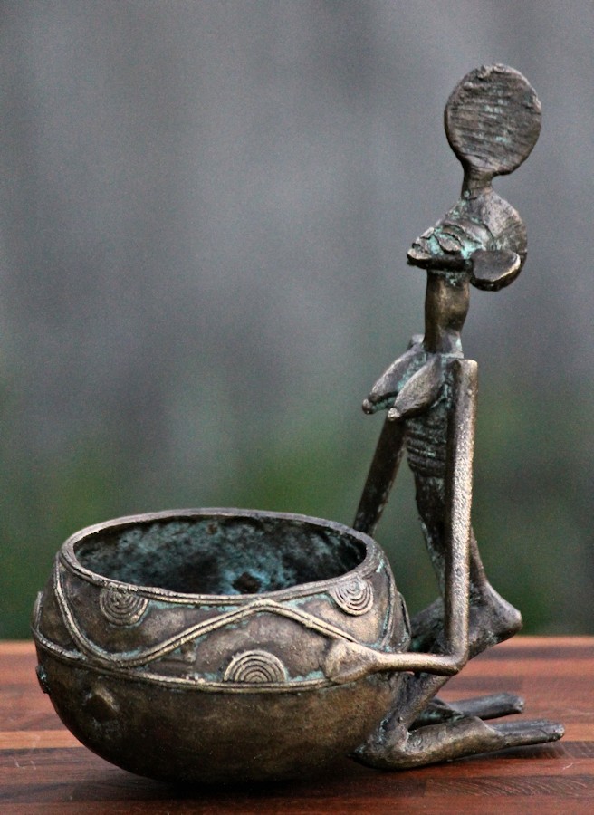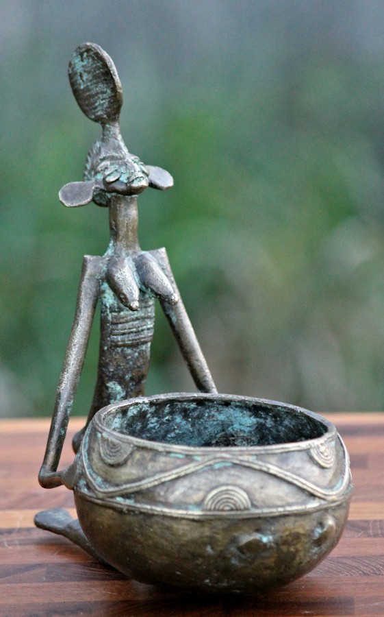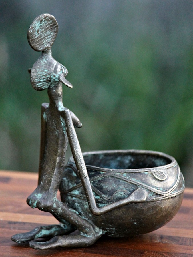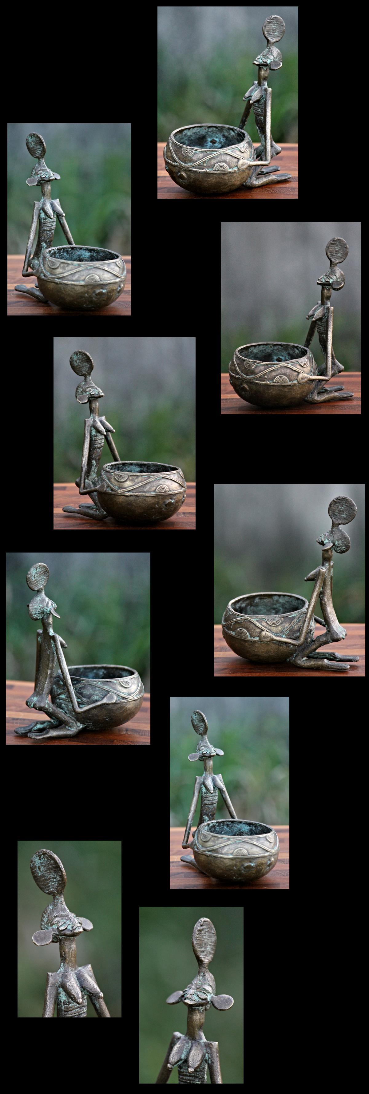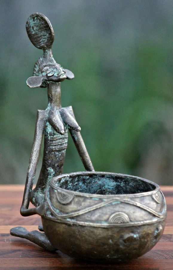 Cast using the lost wax methold, the kneeling female figure presents a large offering bowl. A raised straight-plus-zig-zag double-line motif appears around the circumference of the bowl, punctuated by a pattern of raised concentric semi-circles. A graceful figure with slender, elongated features, the woman's head is adorned with a distinctive & strikingly beautiful coiffure/headdress. Her stylized ears add to the conceptualism & uniqueness of the piece.