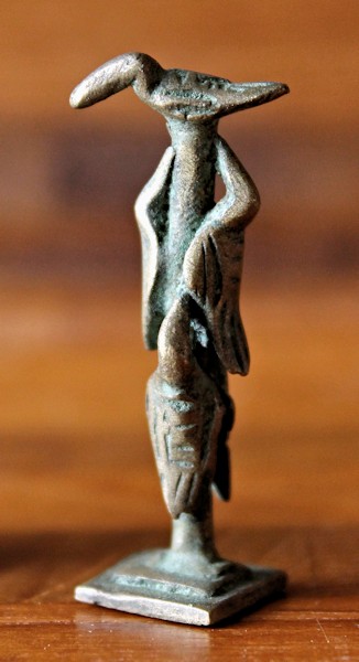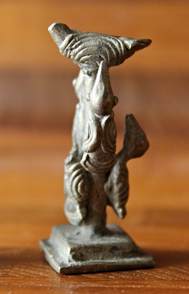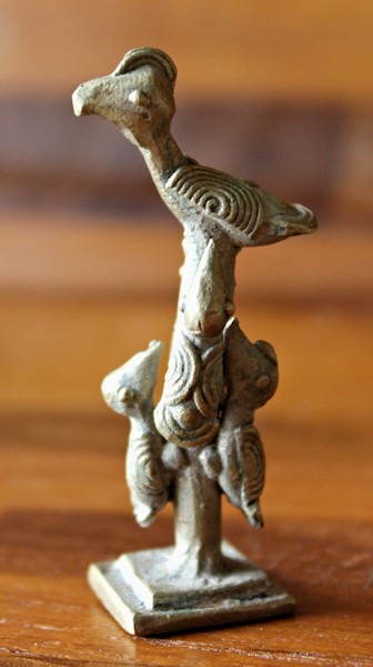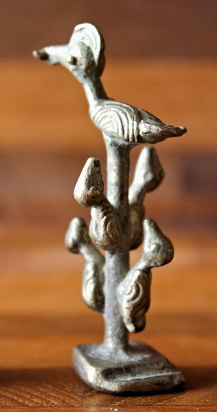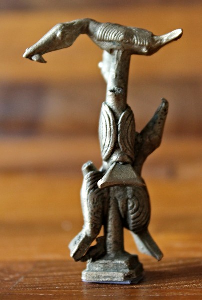 Cast using the lost wax method, these small, rather delicate sculptures feature a bird motif. The birds atop 2 of them carry a fish in their beaks. Fine detail including semicircular concentric designs. Ranging in height from 1.75 to 2.5 inches, the figures all measure approximately a half-inch in width & an inch in depth.