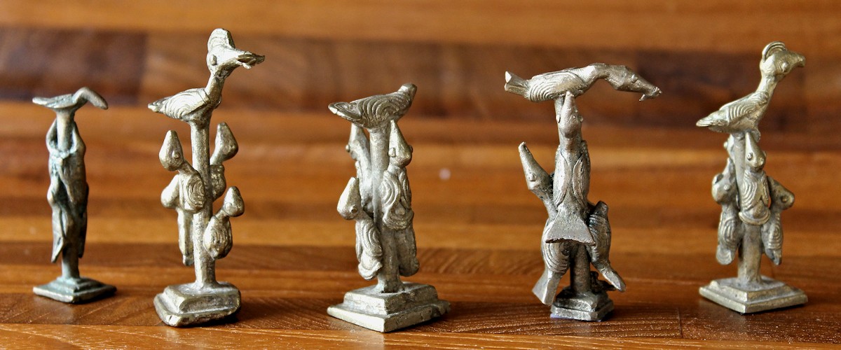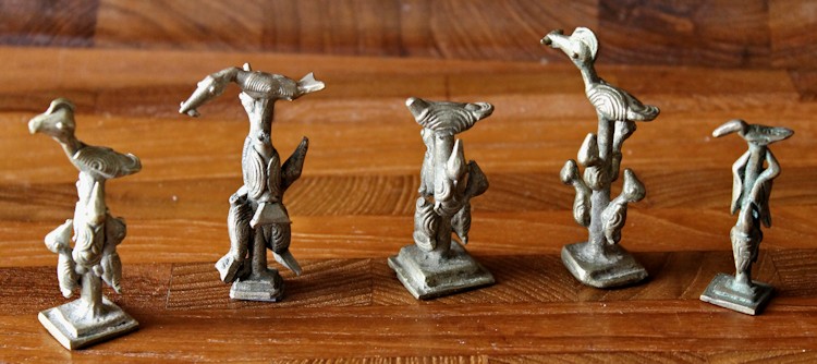 On offer from our personal collection is this charming set of 5 brass/bronze goldweights from the Ashanti peoples of Ghana. The Ashanti are known for their skilled & imaginative metalwork, & are prolific in their production of metal objects such as goldweights & various storage boxes, including a variety of lidded container known as a kuduo.