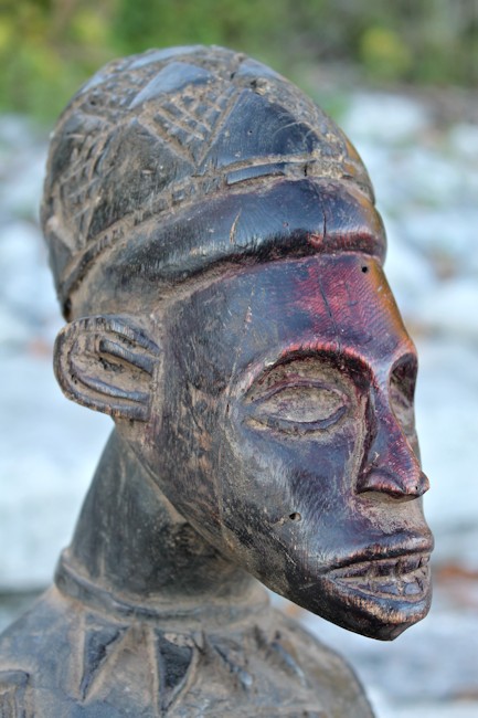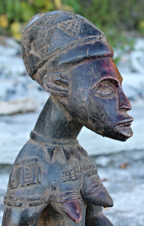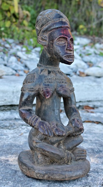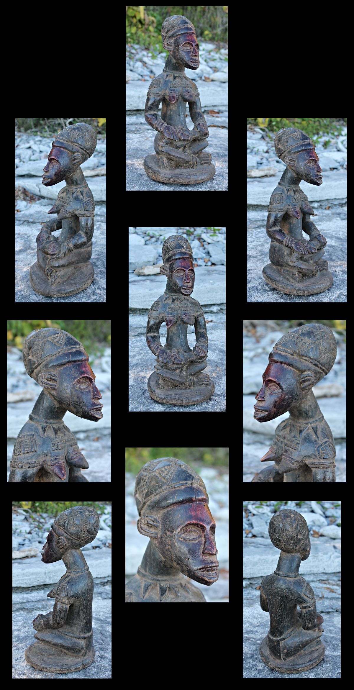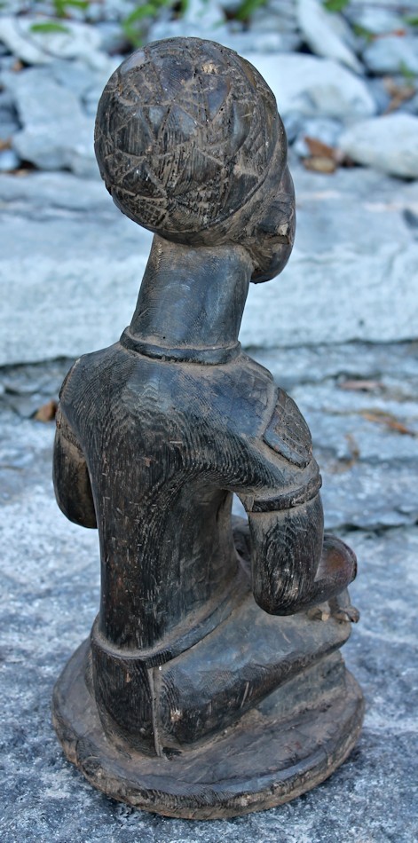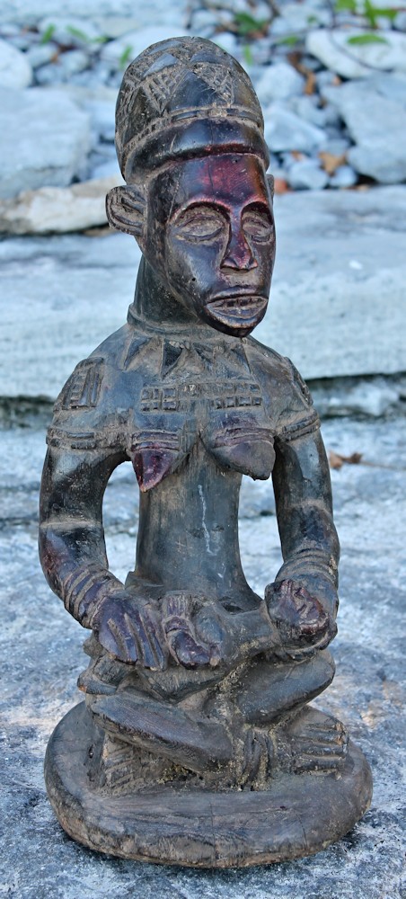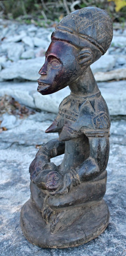 Classic features enhance the inherent dignity of this sculpture, such as the figure's outlined & inset eyes, & open mouth bearing prominent teeth. Her necklace, plus breast, arm, & wrist bands indicate that she is from a royal or other important tribal family. Scarifications accent her chest & shoulders, & an incised, patterned headdress adorns the top of head. Her face bears a rich, mahogany-hued finish. Profound symbolism is found in the infant she holds in her lap...as the child is depicted not suckling either of its mother's well-formed breasts, this indicates that the baby has died or may have been still-born. Cradling her lifeless child, the proud mother, seated with legs crossed, cries out prayerfully, hoping for fertility & for the chance of giving birth to a healthy baby.