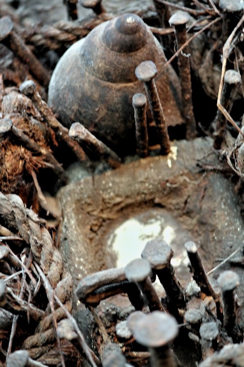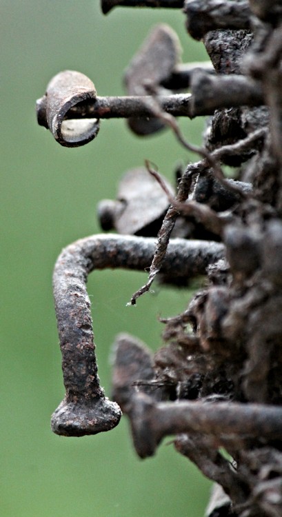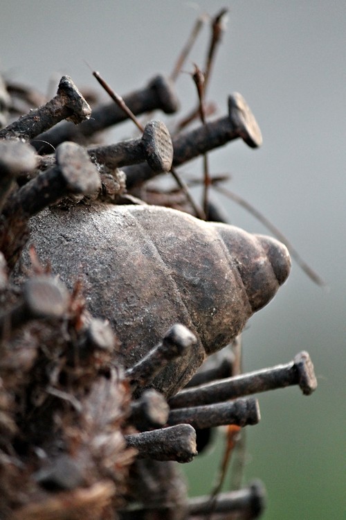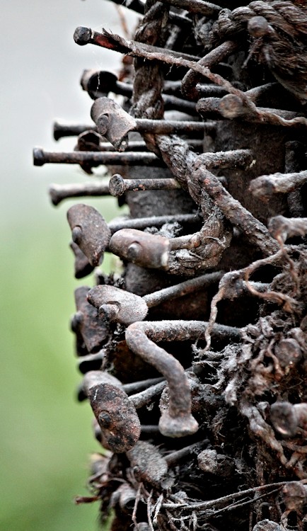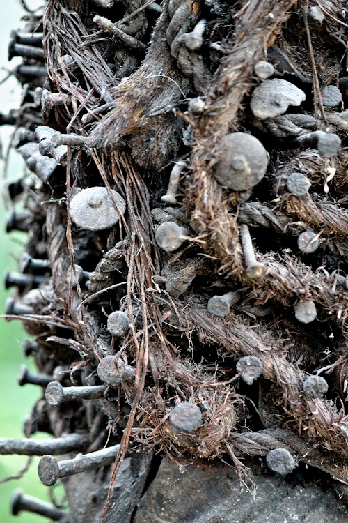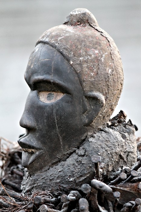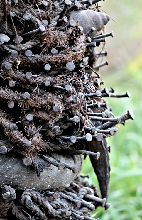 Lavishly laden with hardware & other embellishments, this is a very heavy piece, weighing nearly 14-lbs. Magical objects & substances cover nearly the entire surface of the piece. The torso is imbedded with a maze of hundreds of nails of various shapes & sizes. Ribbon-like strips of animal hide still with hair attached, rope, & twisted fibers are threaded throughout the complex labyrinth of nails. A collar of mud- or clay-encrusted rolled fabric is wrapped around the figure's neck, while another large swath of rolled fabric is worn around the lower torso. Inset in the abdomen is a piece of mirror-like glass, intended to obscure a filled cavity while repelling evil spirits.