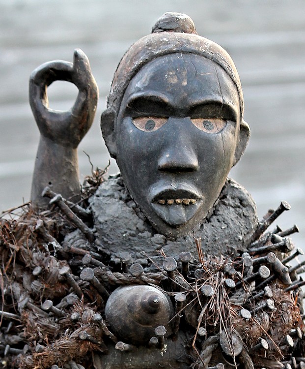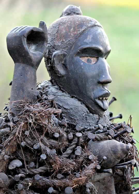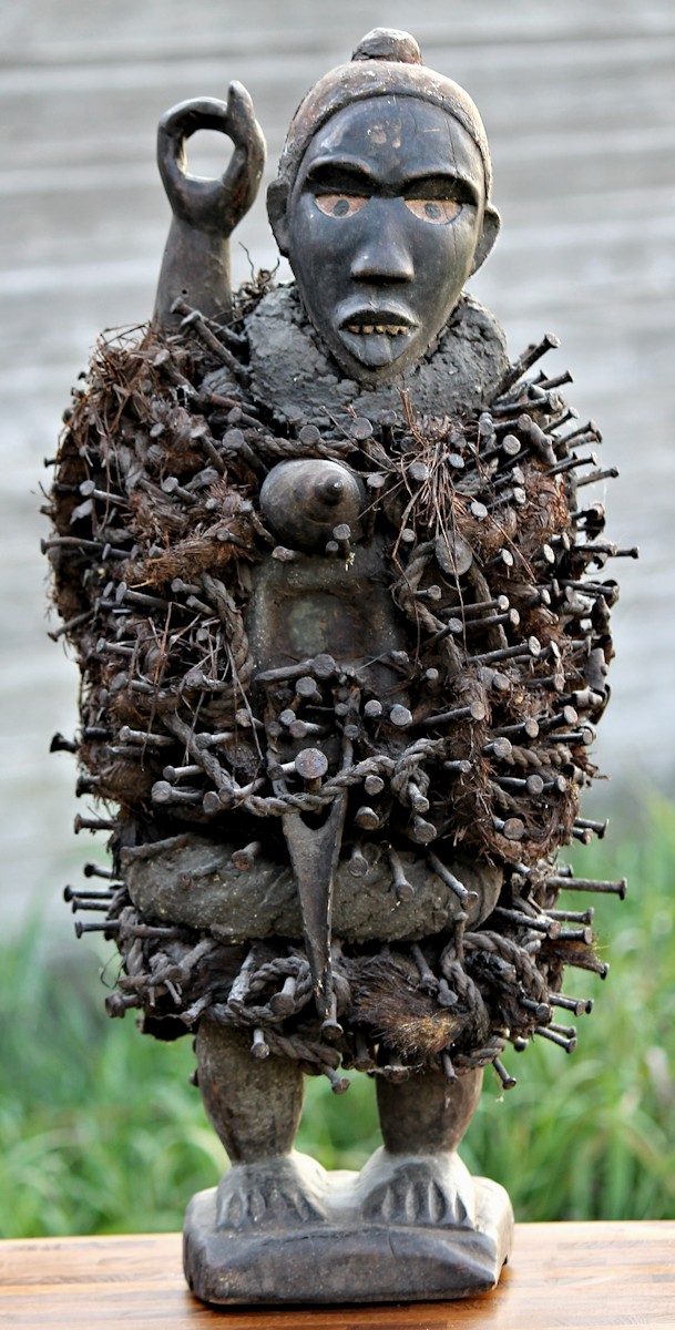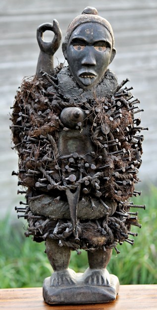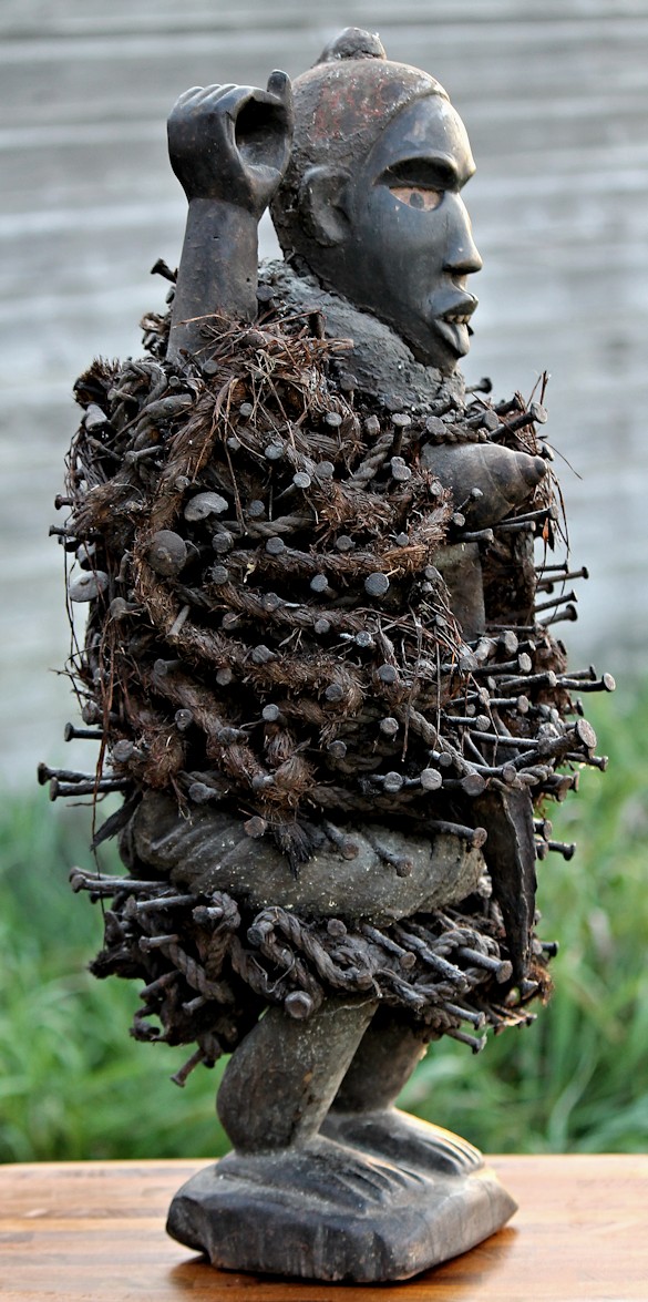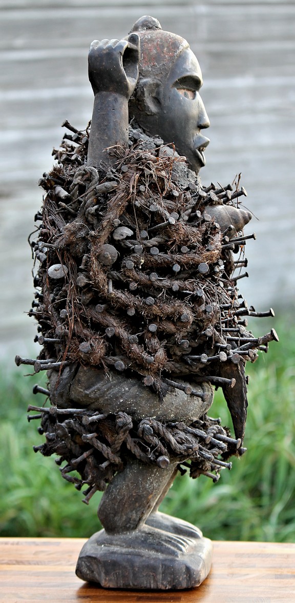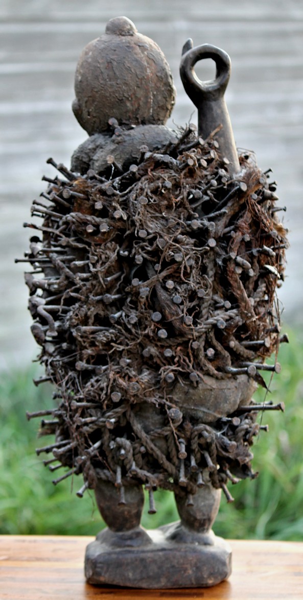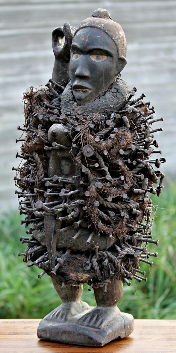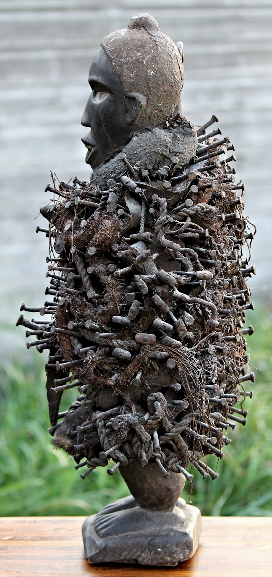 Such sculptures are used within the tribal community as forces of protection, & for coping with various problems. The local diviners add special objects to the figures, such as nails, mirrors, beads, feathers, & horns. Imbued with magical properties, these adornments enhance the available power of the statues. Those bearing protruding nails &/or blades are regarded as the most powerful of these figures. And as each successive object is driven into its body, the figure gains additional strength.