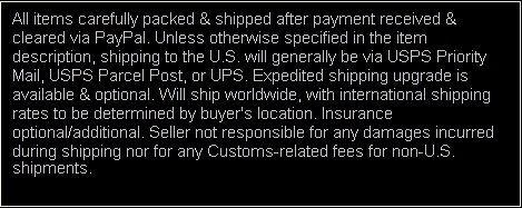 All items carefully packed & shipped after payment received & cleared via PayPal. Unless otherwise specified in the item description, shipping to the U.S. will generally be via USPS Priority Mail, USPS Parcel Post, or UPS. Expedited shipping upgrade is available & optional. Will ship worldwide, with international shipping rates to be determined by buyer's location. Insurance optional/additional. Seller not responsible for any damages incurred during shipping nor for any Customs-related fees for non-U.S. shipments.