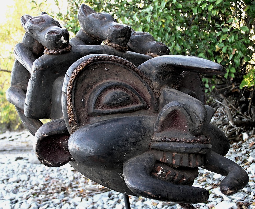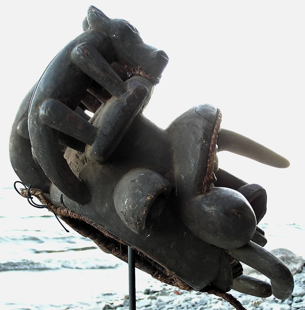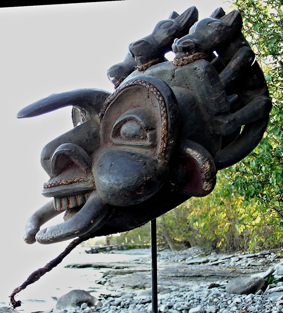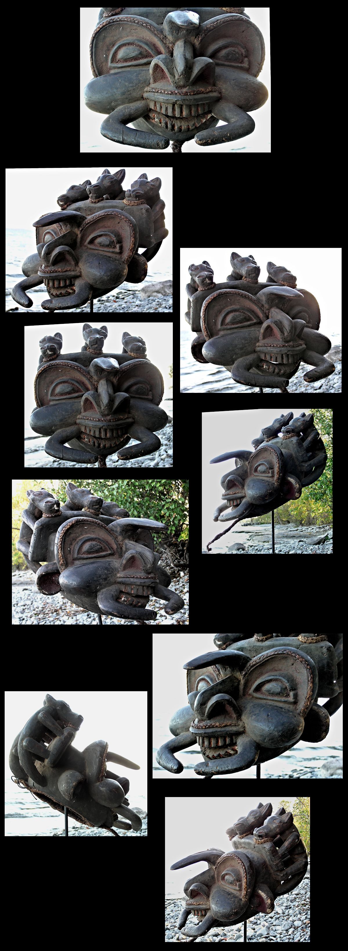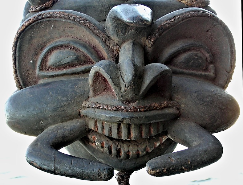 A HUGE mask, all of its features are wildly exaggerated... eyes set in large hollows accented by braided grasses; wide, flared nostrils; bulbous cheeks; broad, toothy smile bedecked by horns on either side, accented by a thin moustache of braided grasses across the upper lip; large zoomorphic ears; a horn-like protuberance jutting forth from the brow; a superstructural crown bearing three animals; & a slender beard of braided grasses extends from the chin. Rolled & braided grasses are wrapped around the inside of the bottom of the mask, & around the bottom chins of the animals atop the crown.