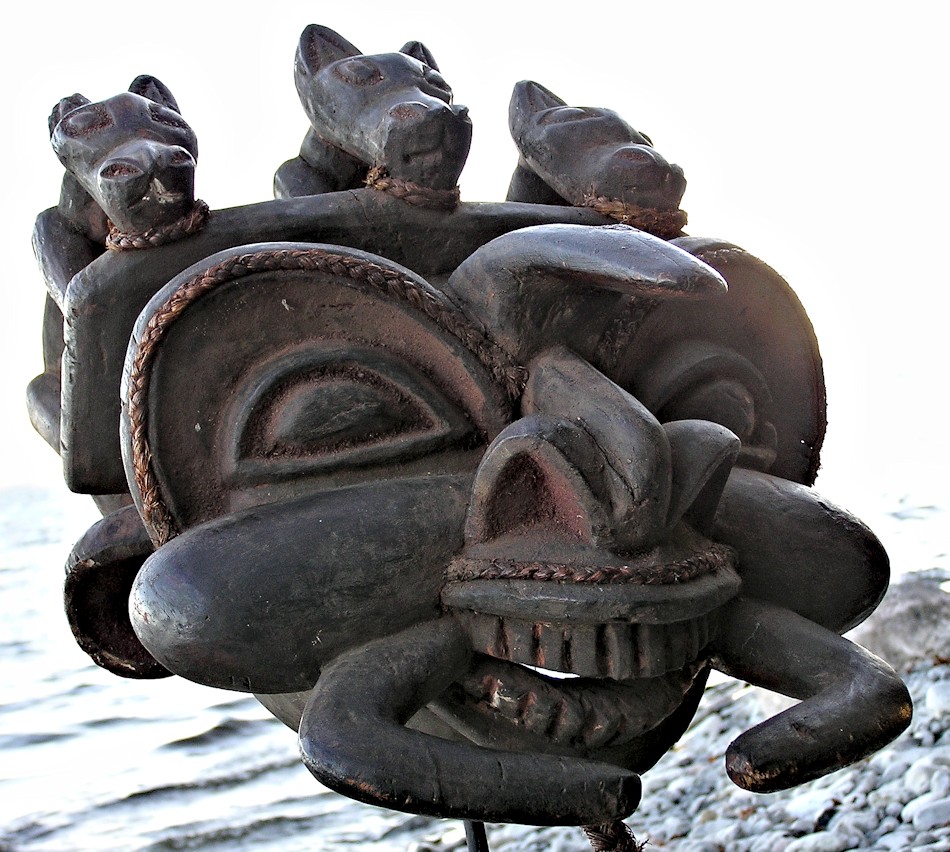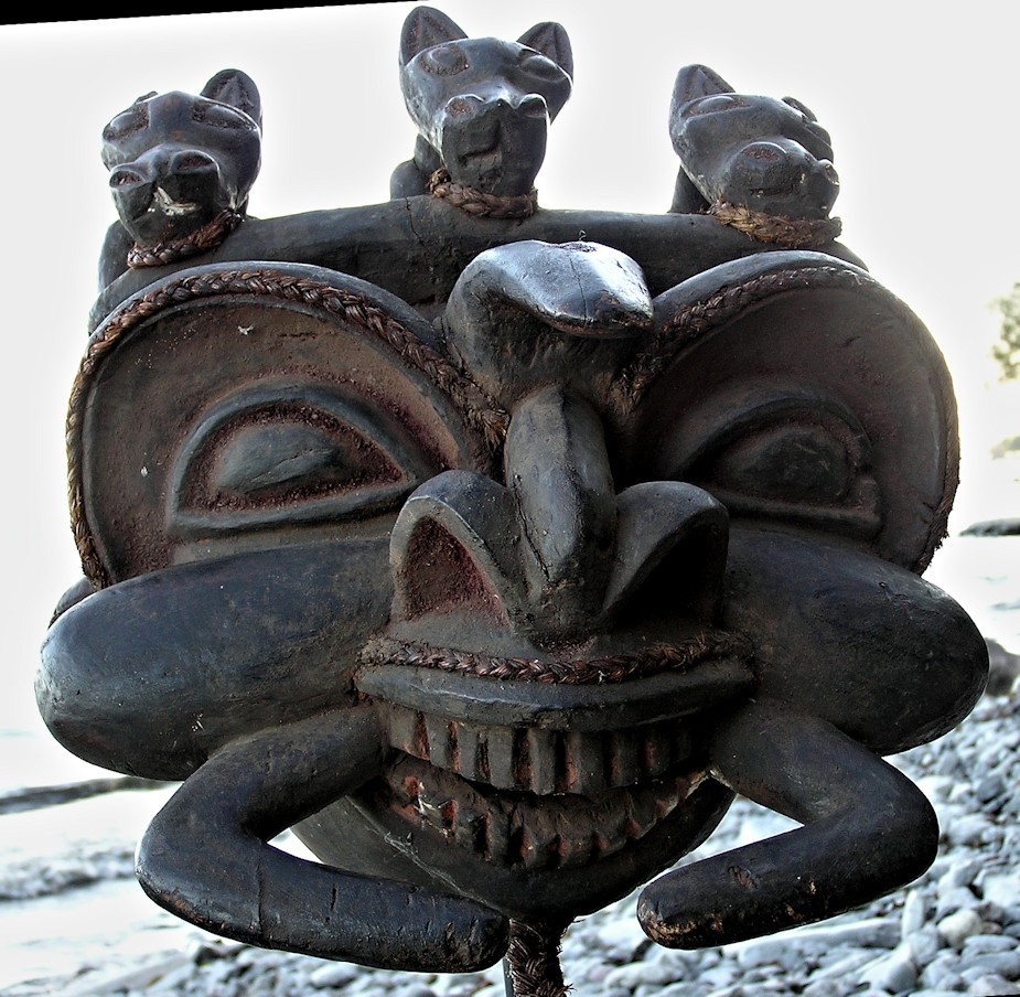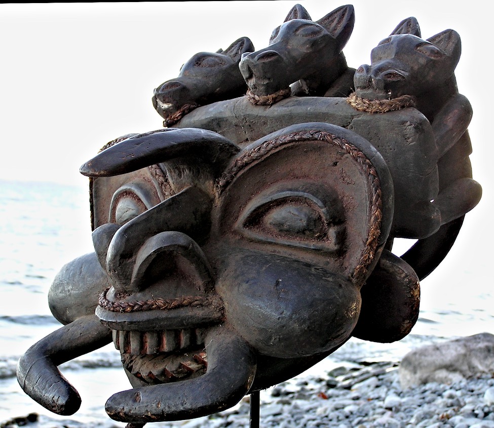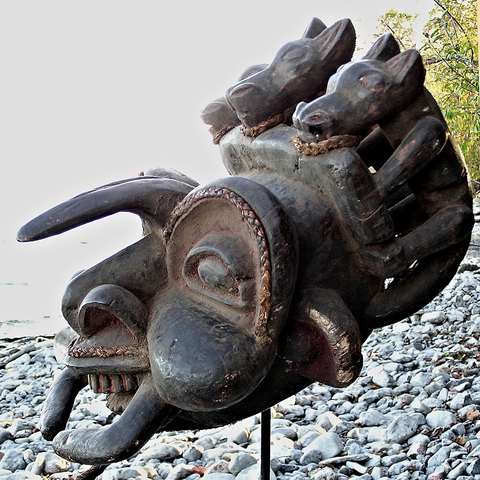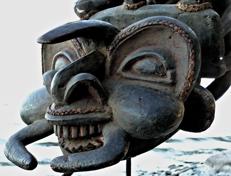 A HUGE mask, all of its features are wildly exaggerated... eyes set in large hollows accented by braided grasses; wide, flared nostrils; bulbous cheeks; broad, toothy smile bedecked by horns on either side, accented by a thin moustache of braided grasses across the upper lip; large zoomorphic ears; a horn-like protuberance jutting forth from the brow; a superstructural crown bearing three animals; & a slender beard of braided grasses extends from the chin. Rolled & braided grasses are wrapped around the inside of the bottom of the mask, & around the bottom chins of the animals atop the crown.
