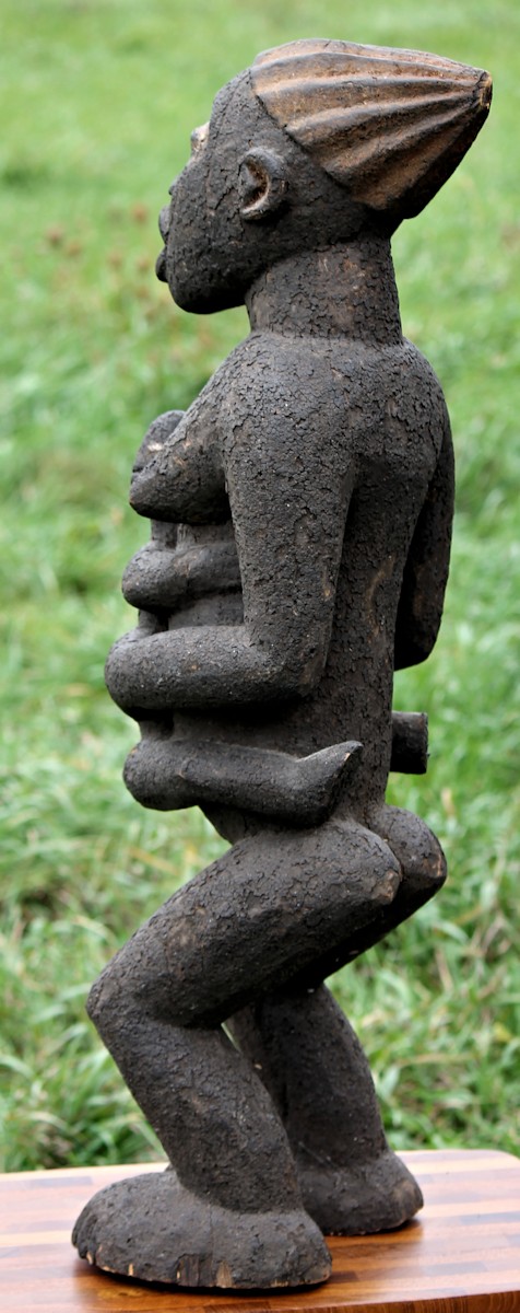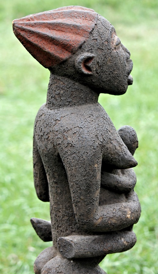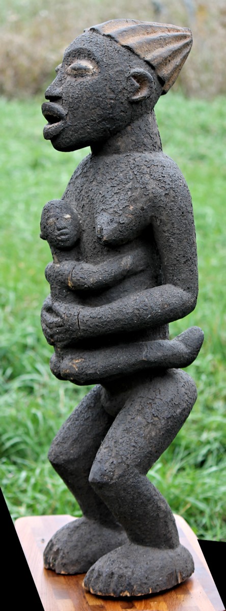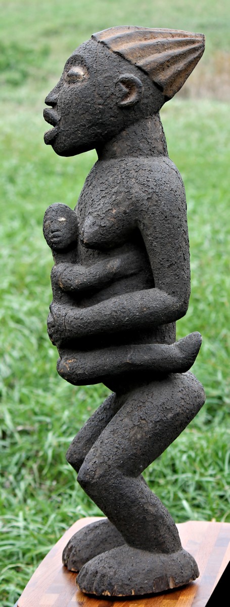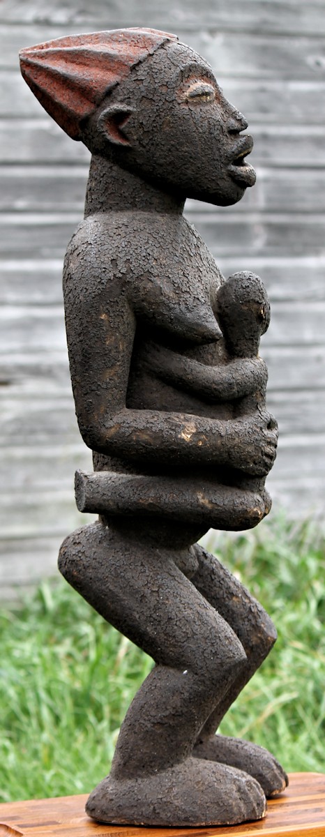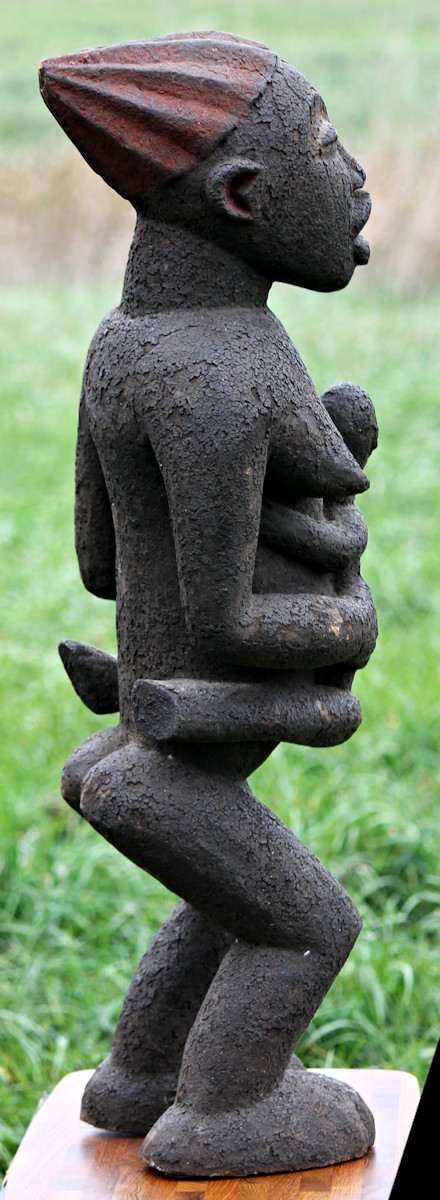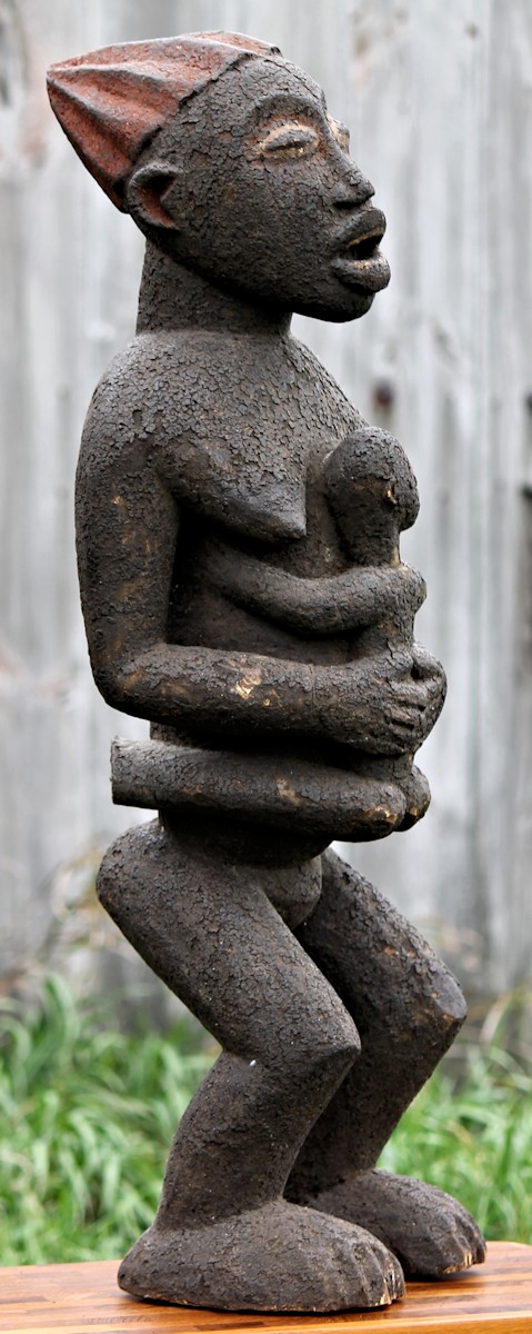 A large sculpture (32") & classic in form, this proud mother embraces her child, & with open mouth, she sings outwardly. Judging by its well-established, heavily encrusted patina, the statue must have been an important figure in the tribal community, receiving countless libations, probably consisting of egg & other substances, enabling it to build-up a thick, all-over coating.