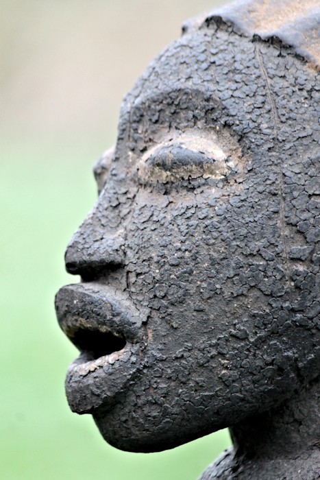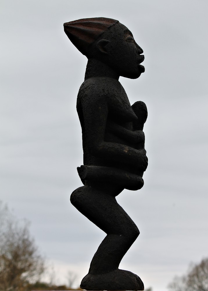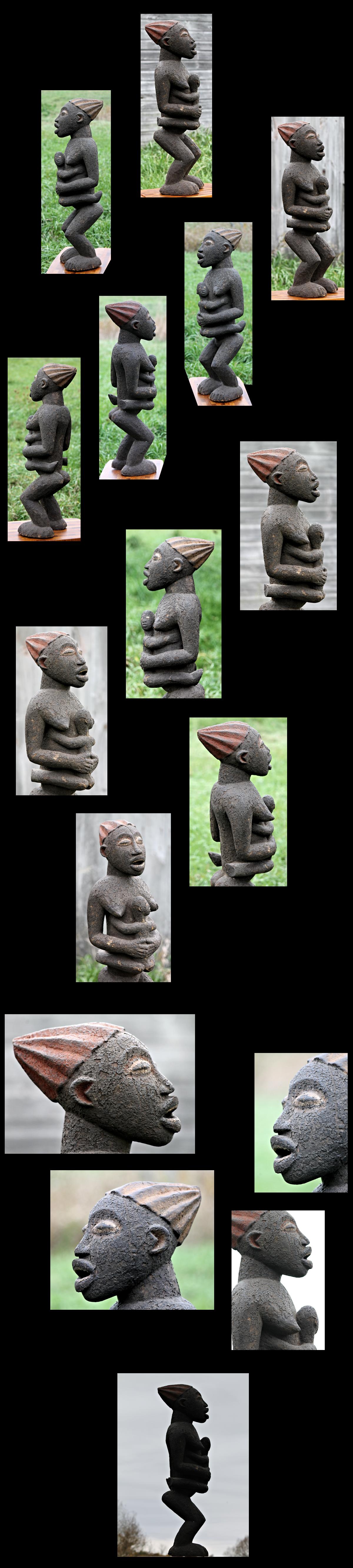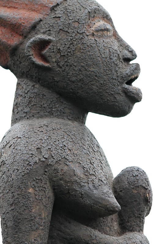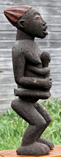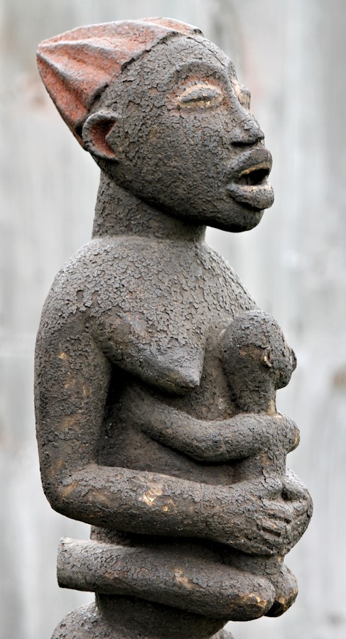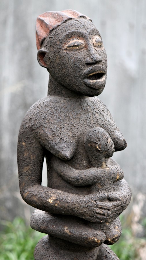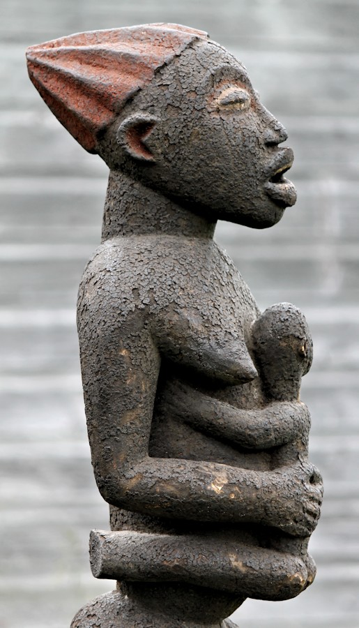 A large sculpture (32") & classic in form, this proud mother embraces her child, & with open mouth, she sings outwardly. Judging by its well-established, heavily encrusted patina, the statue must have been an important figure in the tribal community, receiving countless libations, probably consisting of egg & other substances, enabling it to build-up a thick, all-over coating.