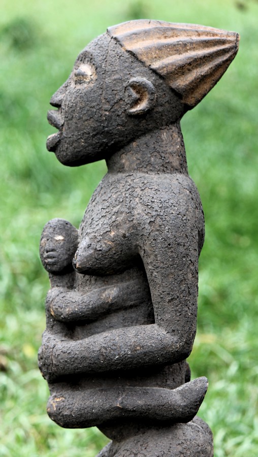 Despite some imperfections in the wood, this superb sculpture is in good overall condition. There are chips & scrapes, including minor chipping to the outer edges of the mother's feet; dry age cracks, including one on the torso that also involves the child's & mother's arms, & one between the mother's buttocks; there are patches where some of the encrustation has flaked off; & there is evidence of indigenous repair to the child's left leg. Extraordinary encrusted patina. Outstanding display.