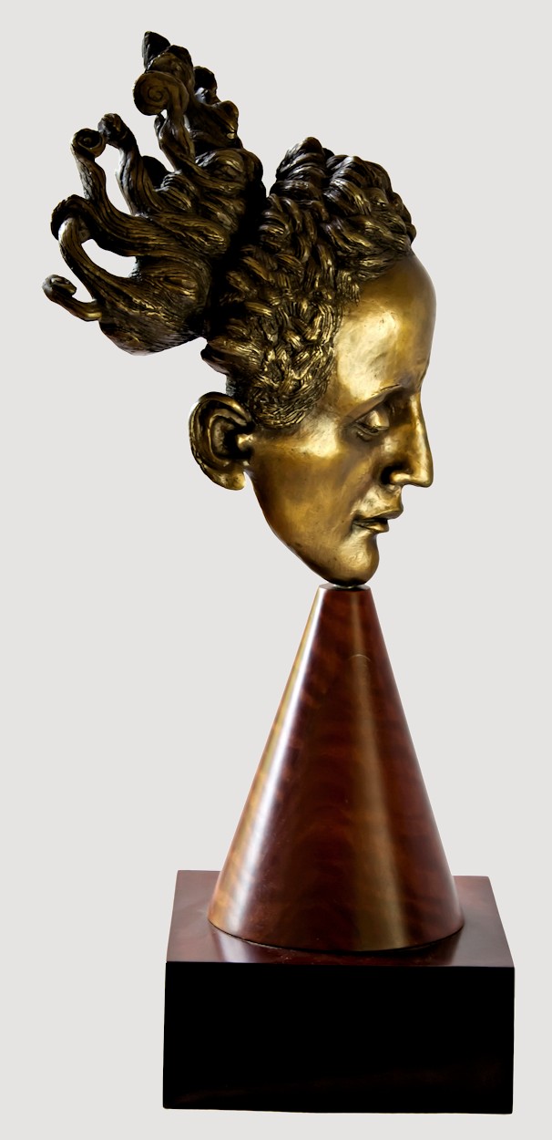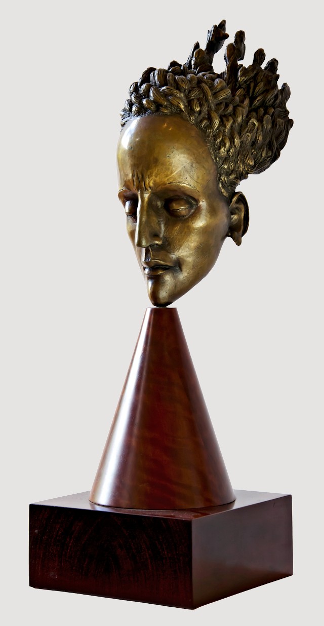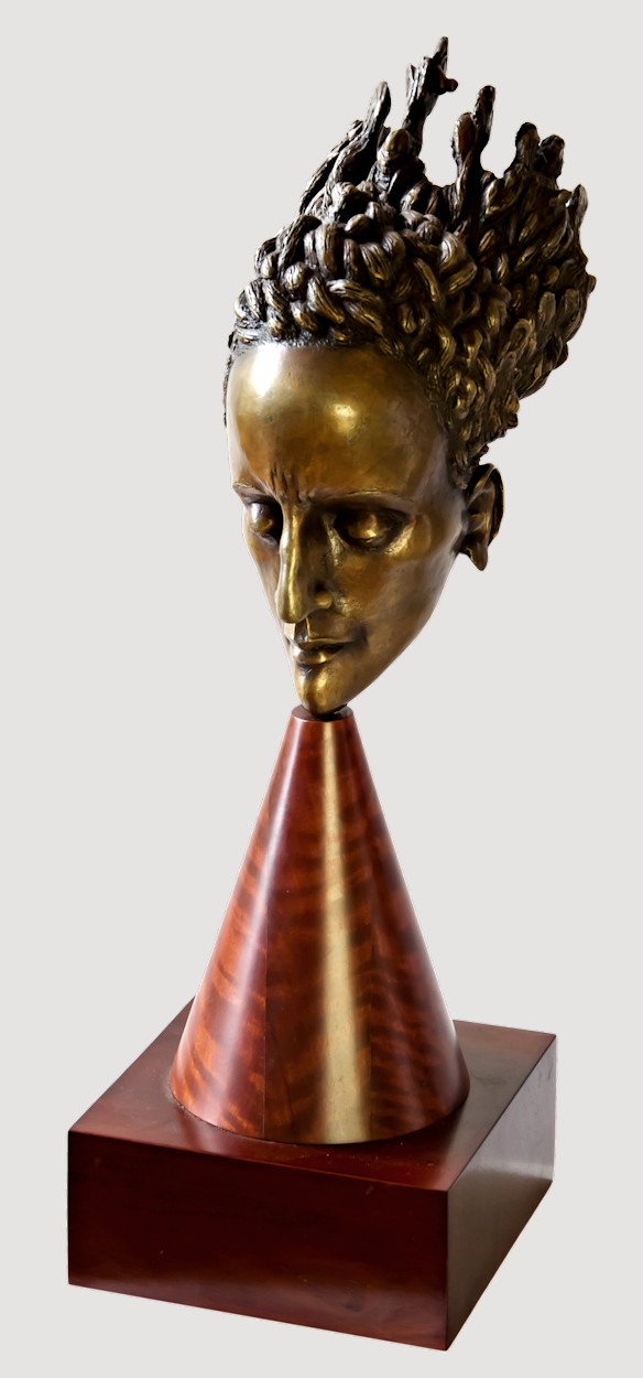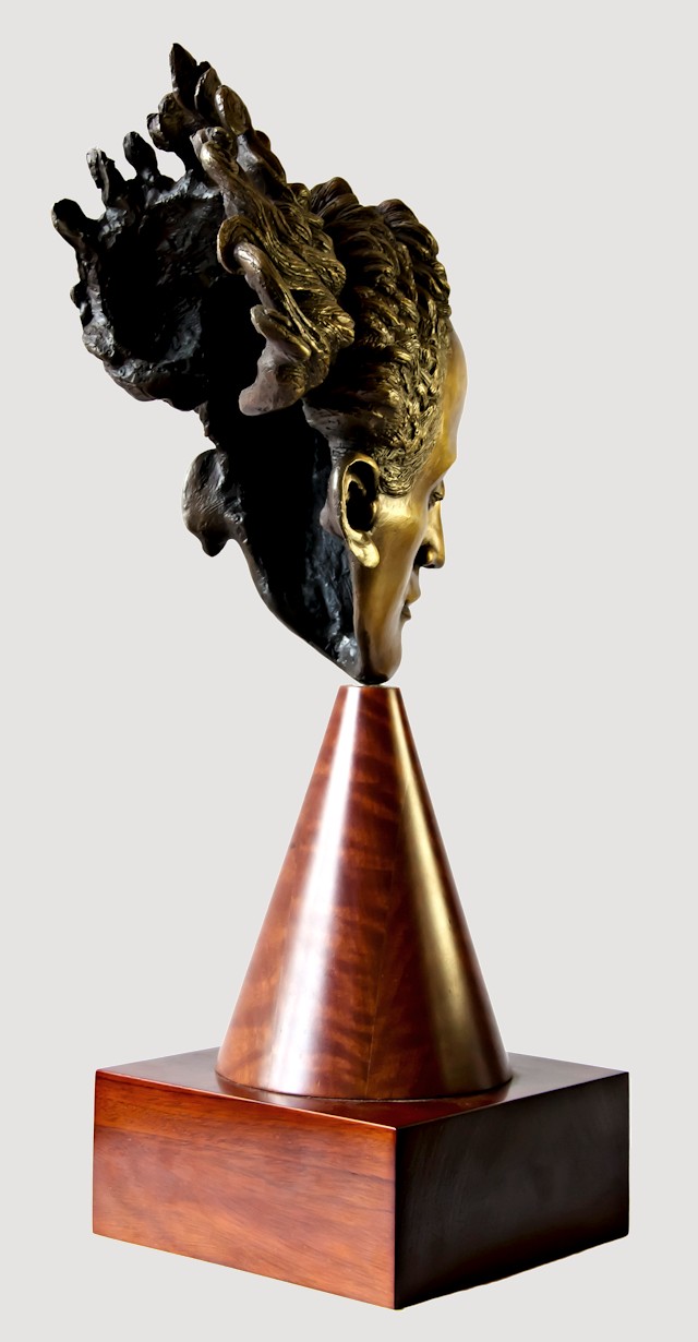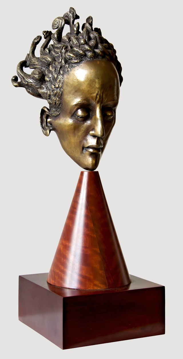 Sharply defined contours accentuate the strong, smooth facial features of the Muse Mask, contrasted by her lively hair, twisting & flowing. Remarkable detail... The bronze is mounted on a conical & then square base crafted of jarrah wood, a hardwood finished in its natural color. Rugged yet graceful & highly refined, this dynamic work, standing nearly 2-feet tall, makes a stunning display.