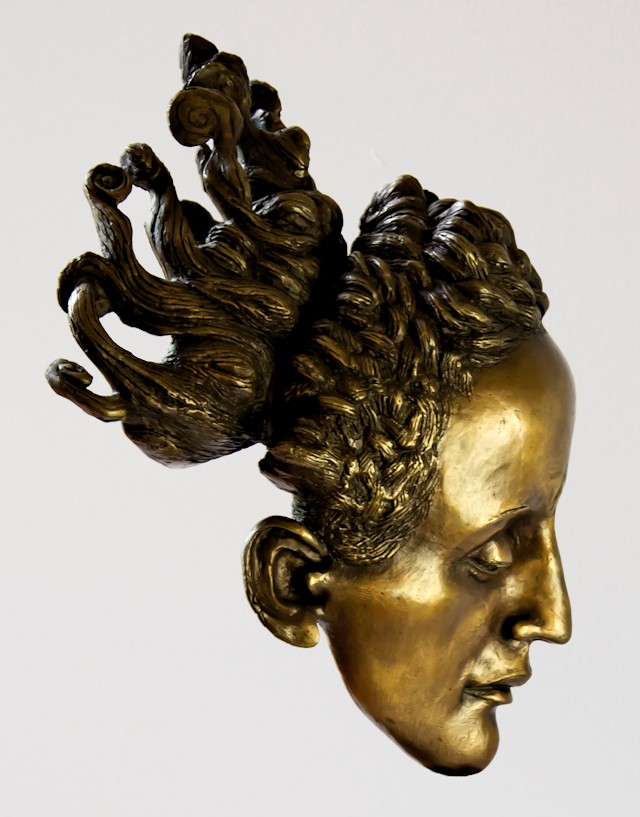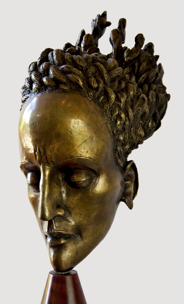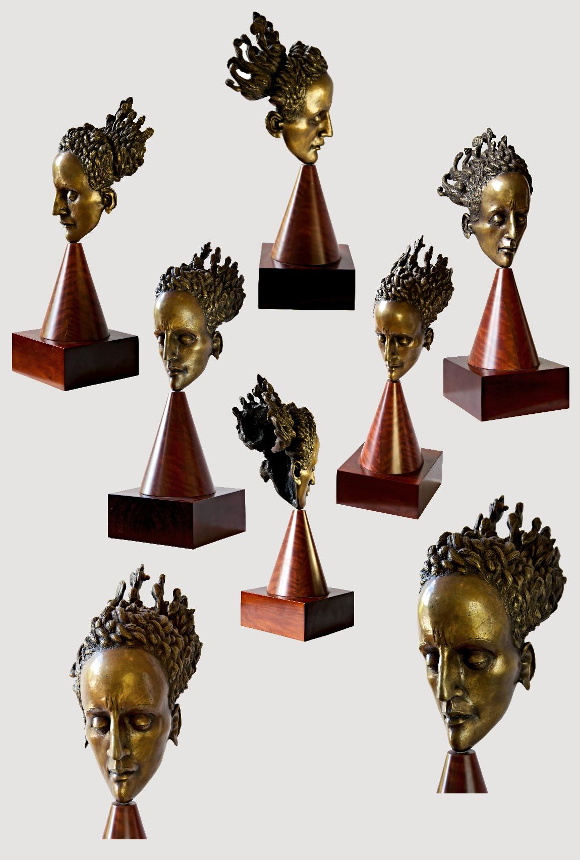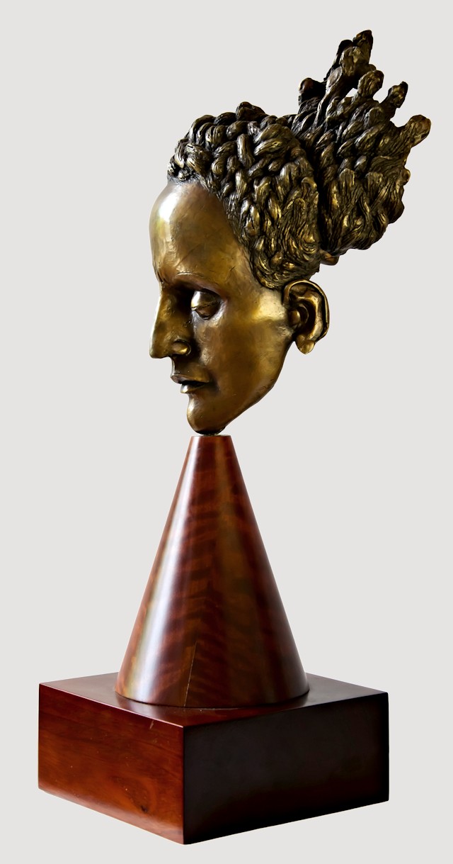 Sharply defined contours accentuate the strong, smooth facial features of the Muse Mask, contrasted by her lively hair, twisting & flowing. Remarkable detail... The bronze is mounted on a conical & then square base crafted of jarrah wood, a hardwood finished in its natural color. Rugged yet graceful & highly refined, this dynamic work, standing nearly 2-feet tall, makes a stunning display.