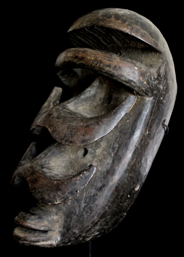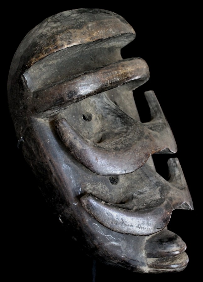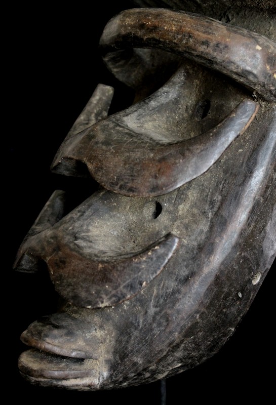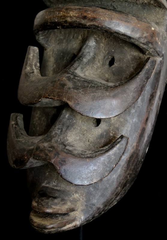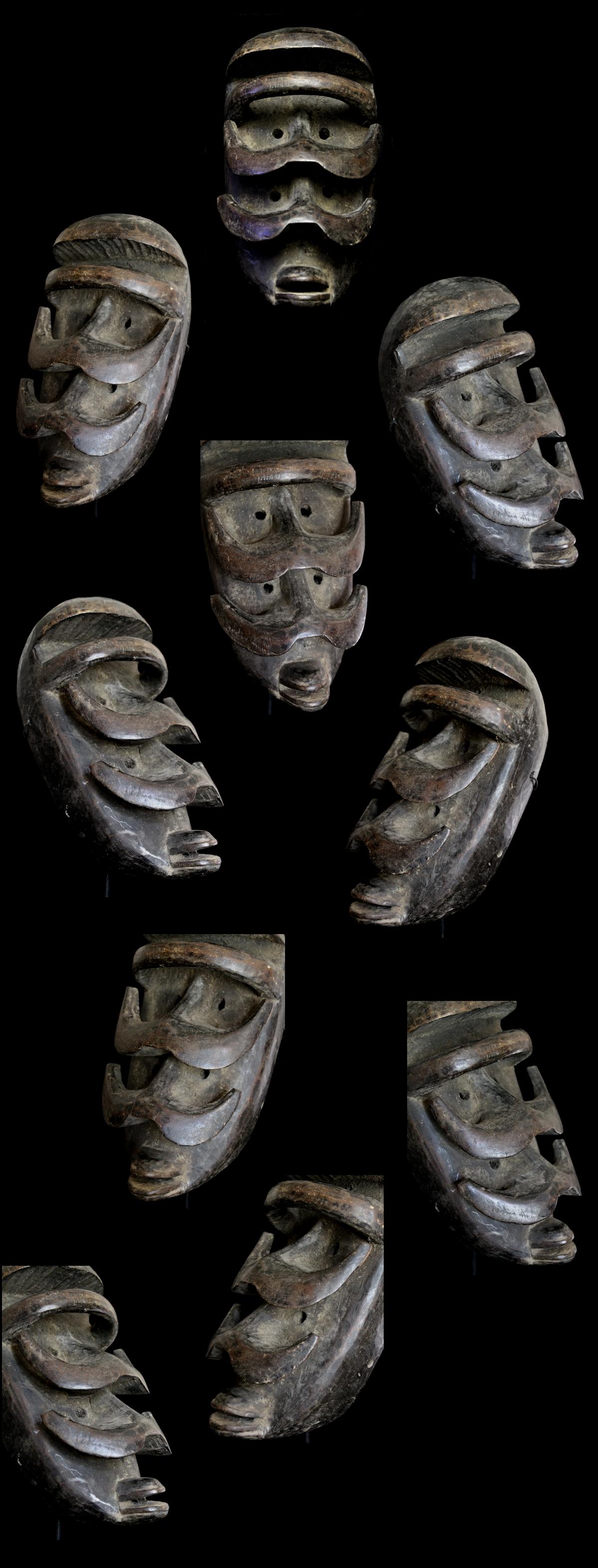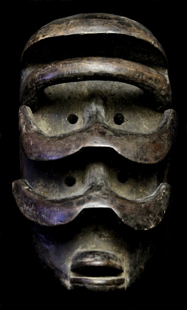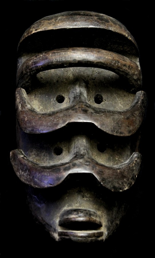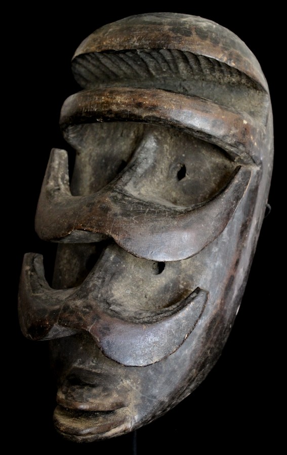 Quite haunting are this mask's double-sets of piercing eyes & prominent horn-like protuberances. A carved "bar" is positioned just underneath the characteristically high-domed brow, while the mouth features protruding lips.