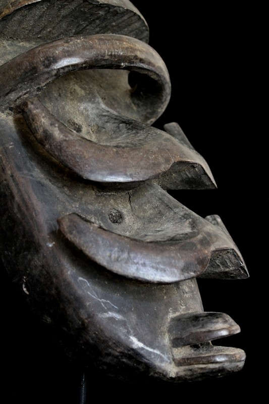 From our personal collection, on offer is this dynamic nyabwa face mask from the Bete peoples of Liberia. Used in various ceremonial rituals, such masks were also worn in preparation for war, as well as during judicial proceedings within the tribal community. Bete face masks share certain traits among those produced by neighboring peoples in the Ivory Coast region, such as the Dan/Grebo, We, & Gere.