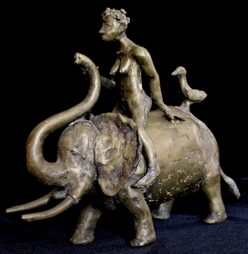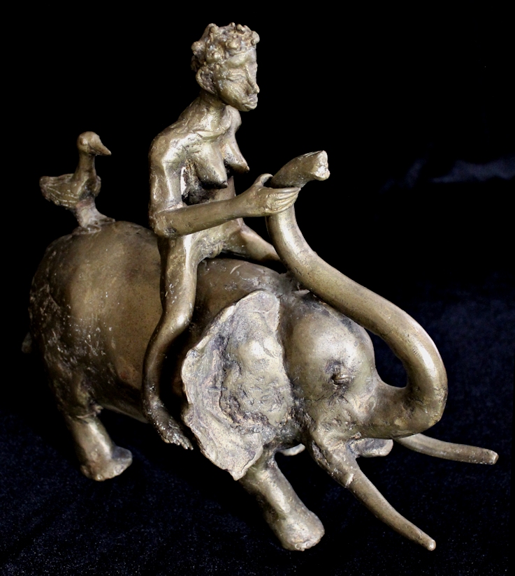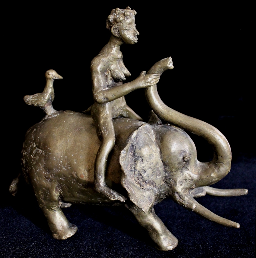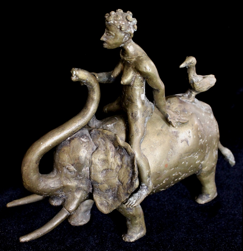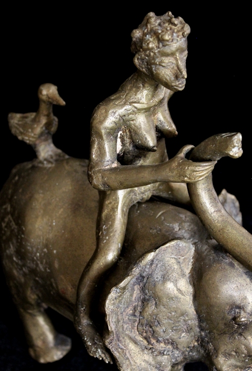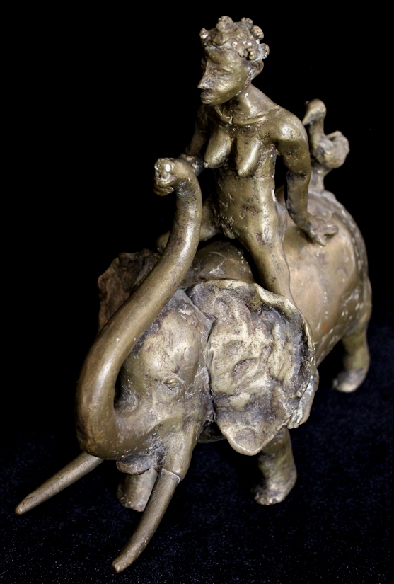 Cast using the lost wax method, this is a very heavy casting. Weighing ca. 14-lbs., we are convinced the elephant's body must be solid, not hollow. The woman's figure is shapely & well-sculpted. With erotic overtones, she grips the elephant's raised trunk like a phallus, while she reaches behind with her left arm, steadying herself by resting her left hand near the elephant's rump. A bird is along for the ride. And where the bird is attached to the hindquarters of the elephant, the female figure is not physically attached to it & is removable.