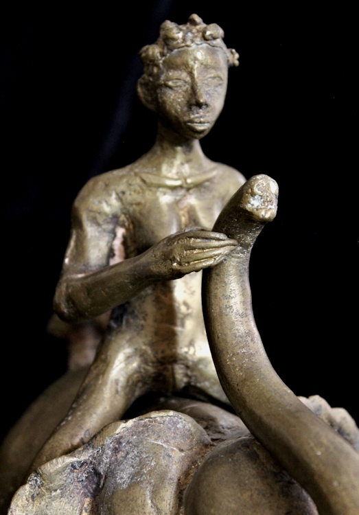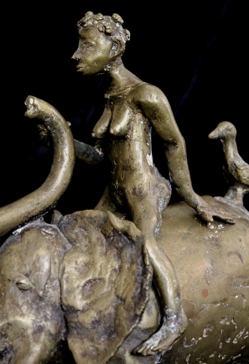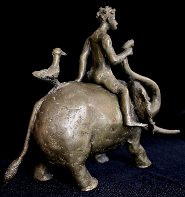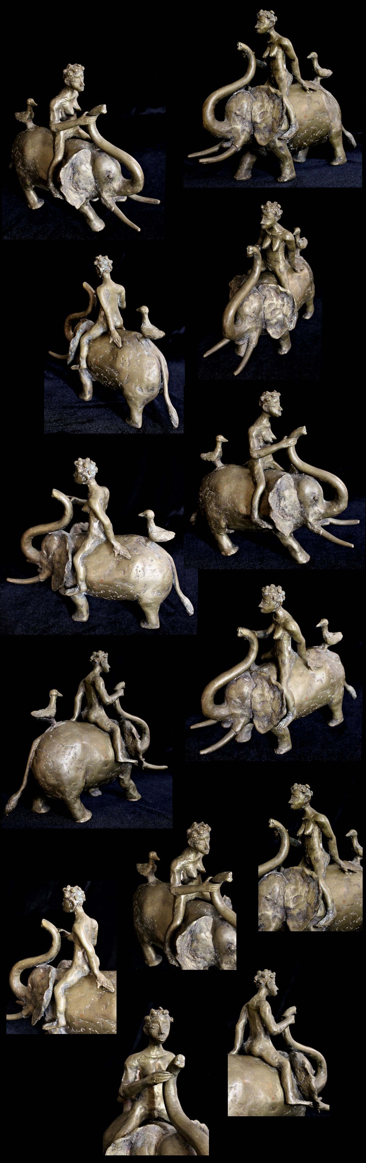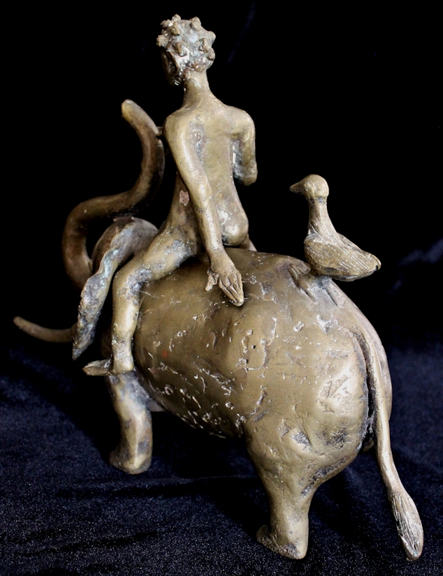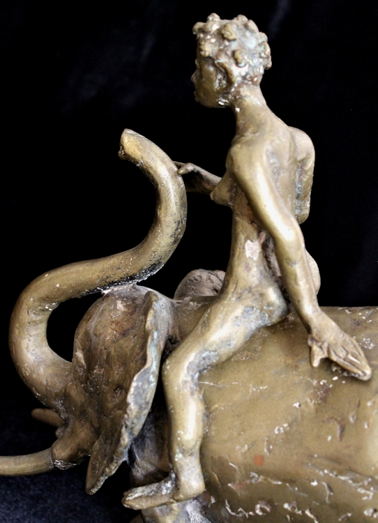 Cast using the lost wax method, this is a very heavy casting. Weighing ca. 14-lbs., we are convinced the elephant's body must be solid, not hollow. The woman's figure is shapely & well-sculpted. With erotic overtones, she grips the elephant's raised trunk like a phallus, while she reaches behind with her left arm, steadying herself by resting her left hand near the elephant's rump. A bird is along for the ride. And where the bird is attached to the hindquarters of the elephant, the female figure is not physically attached to it & is removable.