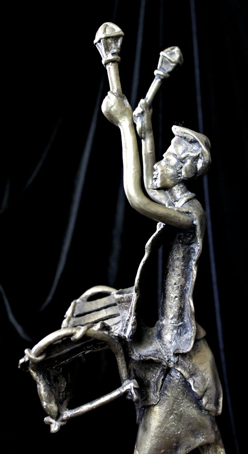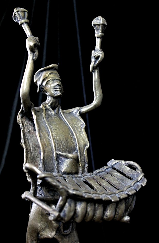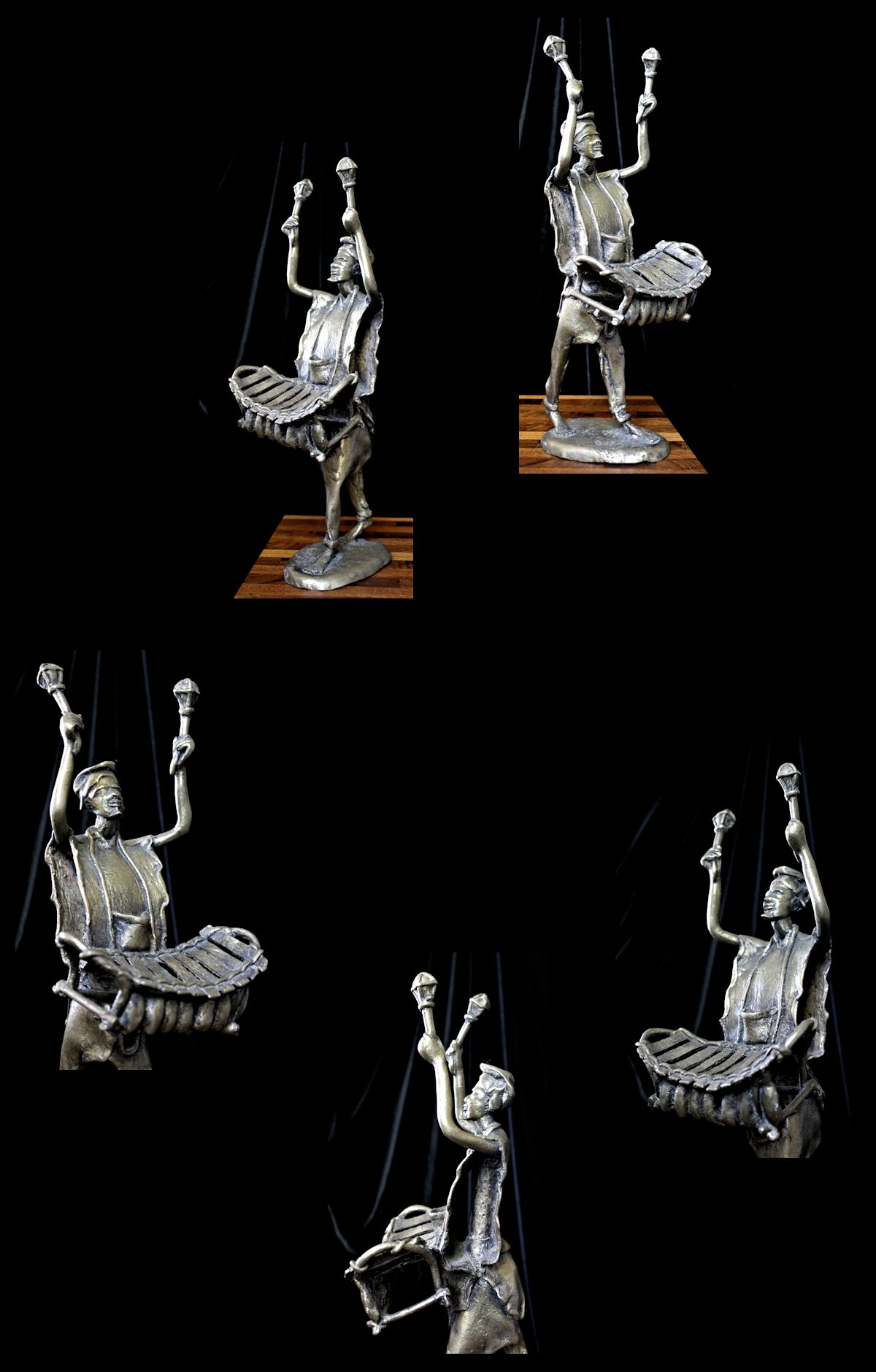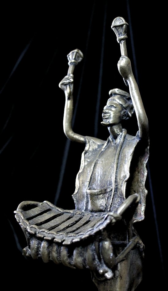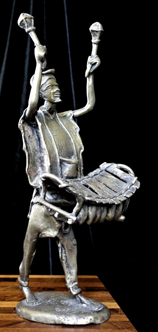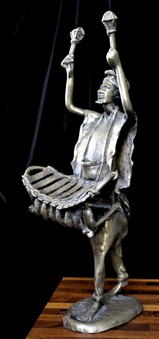 With great attention to detail, the sculptor has injected nuance into every element & facet of the bronze, not least of which is the natural drape & folds of the figure's garments. The figure's upstretched arms, poised to strike the balafon keys below, provide dramatic visual tension. One can easily imagine the percussive impact as the mallets make contact with the instrument's keys...