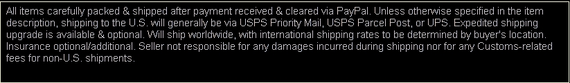 All items carefully packed & shipped after payment received & cleared via PayPal. Unless otherwise specified in the item description, shipping to the U.S. will generally be via USPS Priority Mail, USPS Parcel Post, or UPS. Expedited shipping upgrade is available & optional. Will ship worldwide, with international shipping rates to be determined by buyer's location. Insurance optional/additional. Seller not responsible for any damages incurred during shipping nor for any Customs-related fees for non-U.S. shipments.