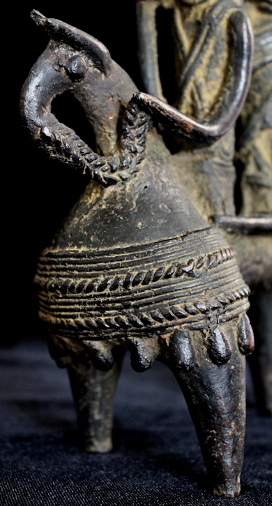 Mounted by two riders bearing weapons -- spears & shield -- the stylized horse is clad with rather ornate garb. A heavy casting for its size, this fine lost wax sculpture is richly patinated & shows a fair amount of oxidization. And whereas typical examples of this form are quite dimunitive (ranging from 2-3 inches in height), this unusually large & detailed iteration makes a more imposing statement with its height of 7-inches. Despite a couple of minor casting imperfections, the piece is in very good overall condition & makes a striking display.