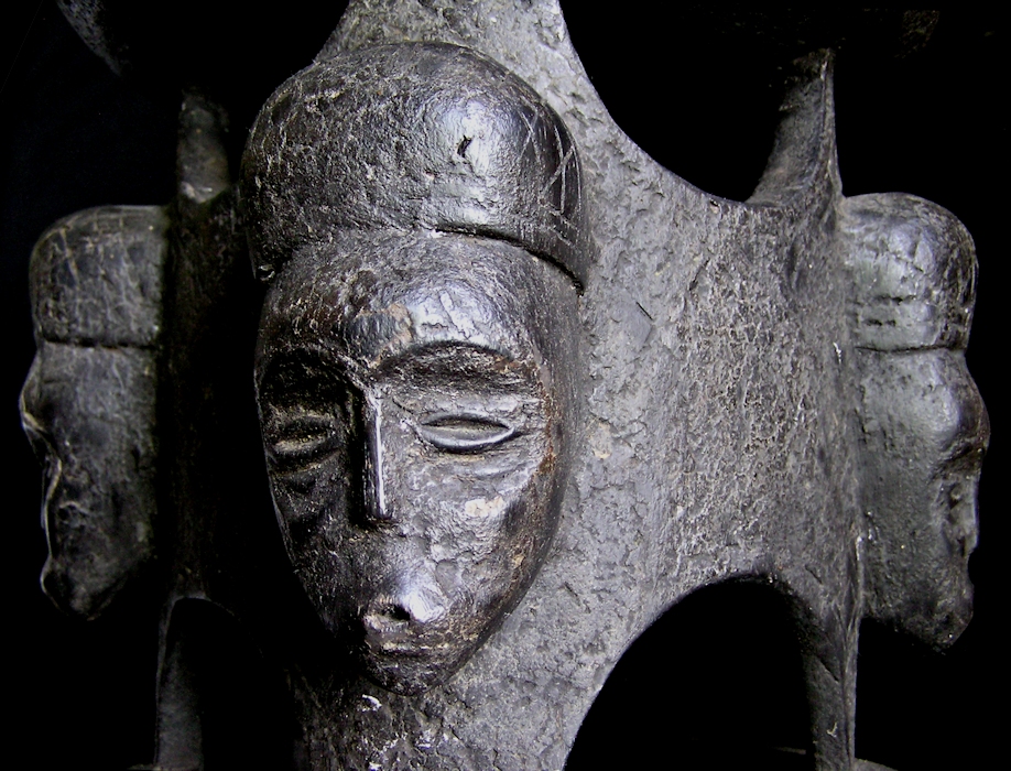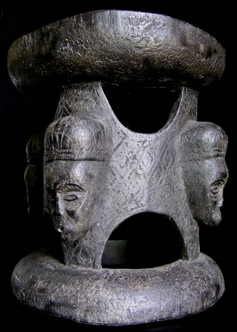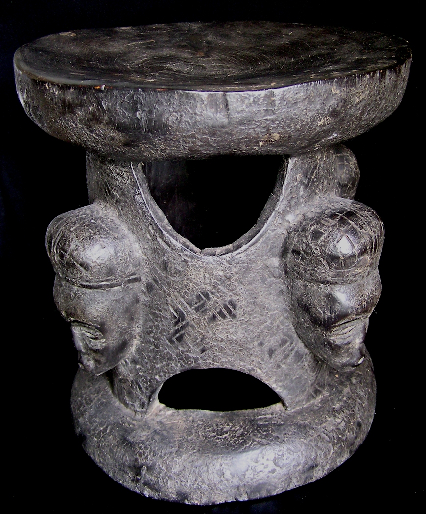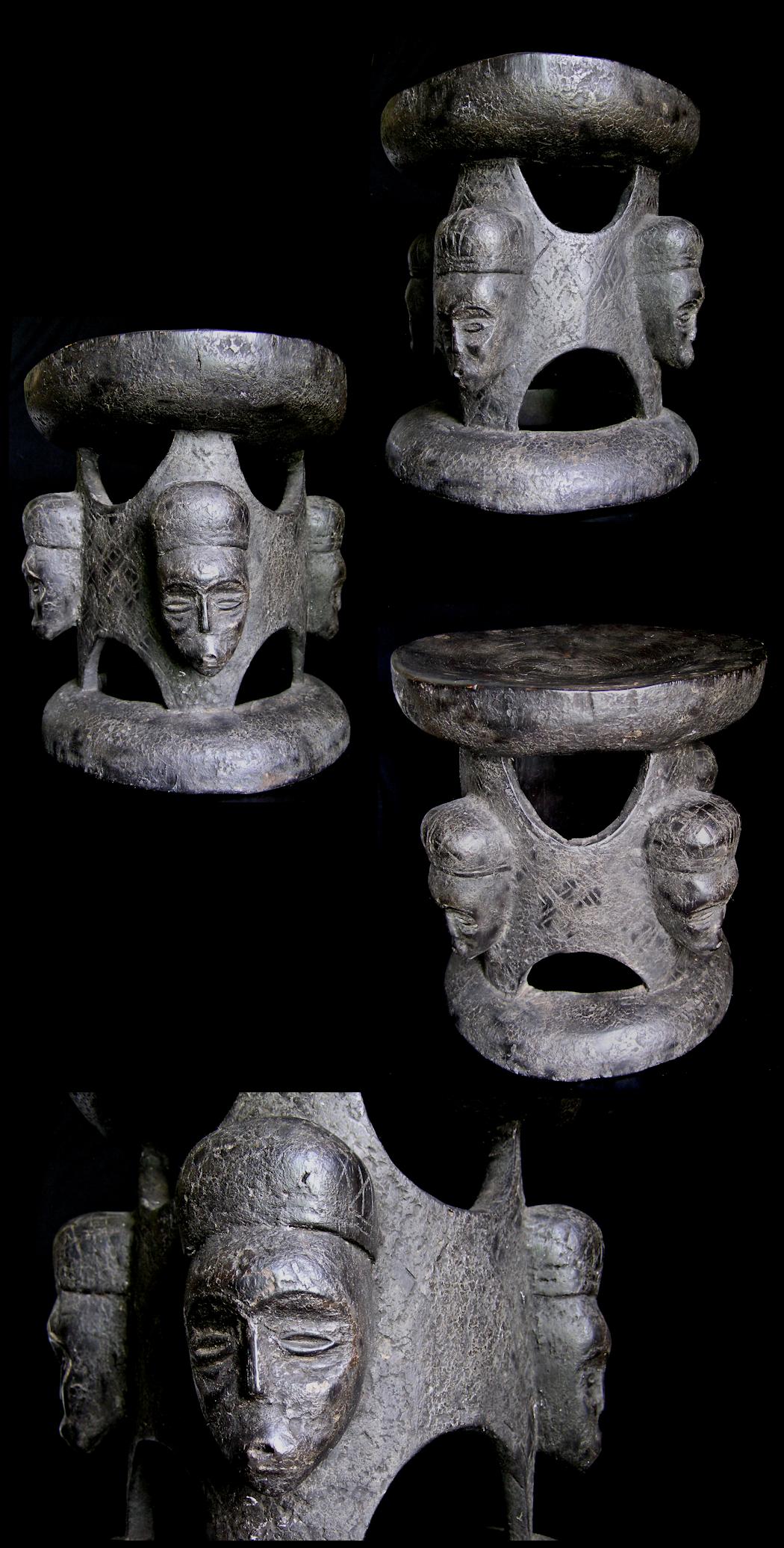 Beautifully carved from a single piece of fairly heavy, dense wood, the sitting surface has been expertly sculpted to provide a carefully scooped seat, making it as comfortable & functional as it is ornamental. Accompanied by a diamond-shaped incised motif, four faces adorn the sides of the stool, which may commemorate senior or ancestral tribal members.