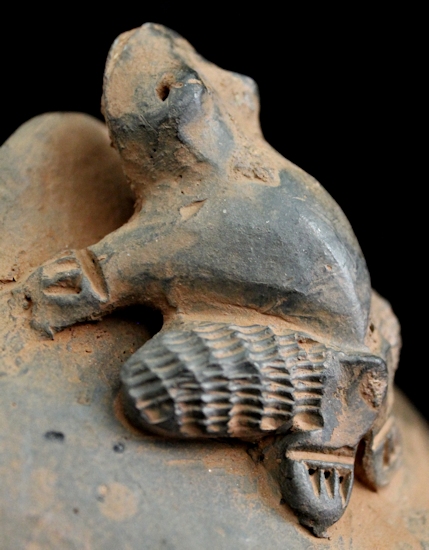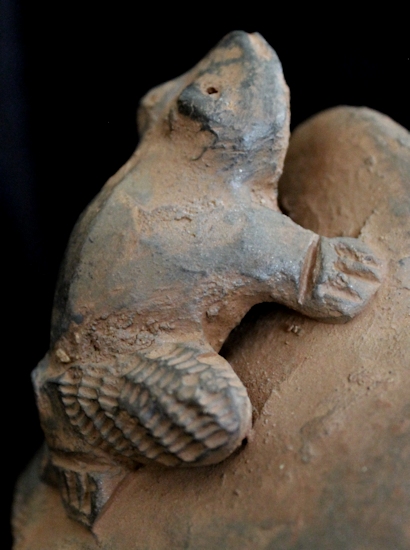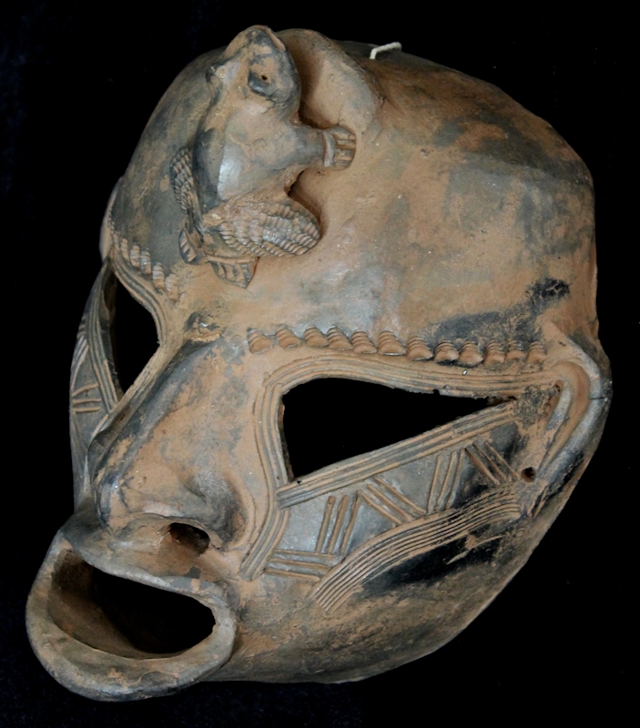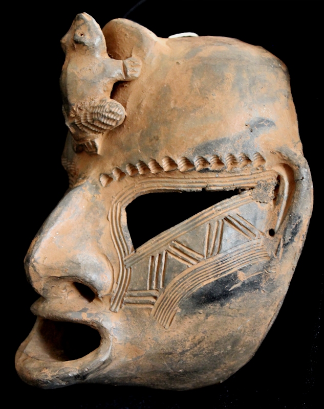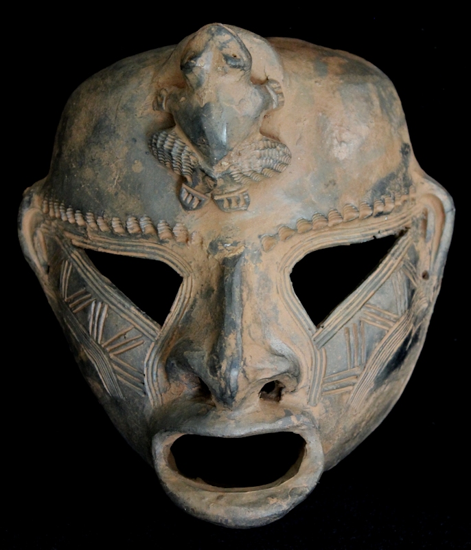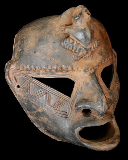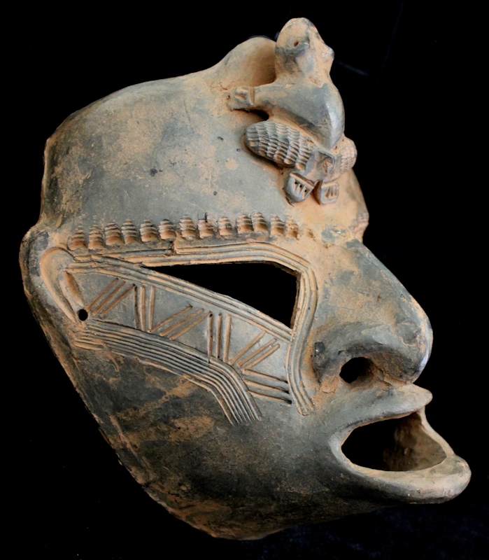 From our private collection, on offer is this compelling clay/terracotta mask from Latin or South America (possibly Columbia). To achieve its somewhat ruddy complexion, we believe ash would have been applied to the surface of the piece during the firing process. Incised scarifications accent the eyes & cheeks, & an impressed repetitive motif highlights the brow. A crest surmounted by a frog adorns the upper forehead. The mask's rather fearsome appearance is enhanced by its aggressively open mouth & protruding lower jaw. Strong nose with flared nostrils & hauntingly-shaped eyes. Relatively thin-walled construction. The piece appears to have artistic influences of Mayan culture.