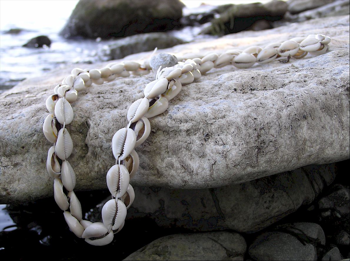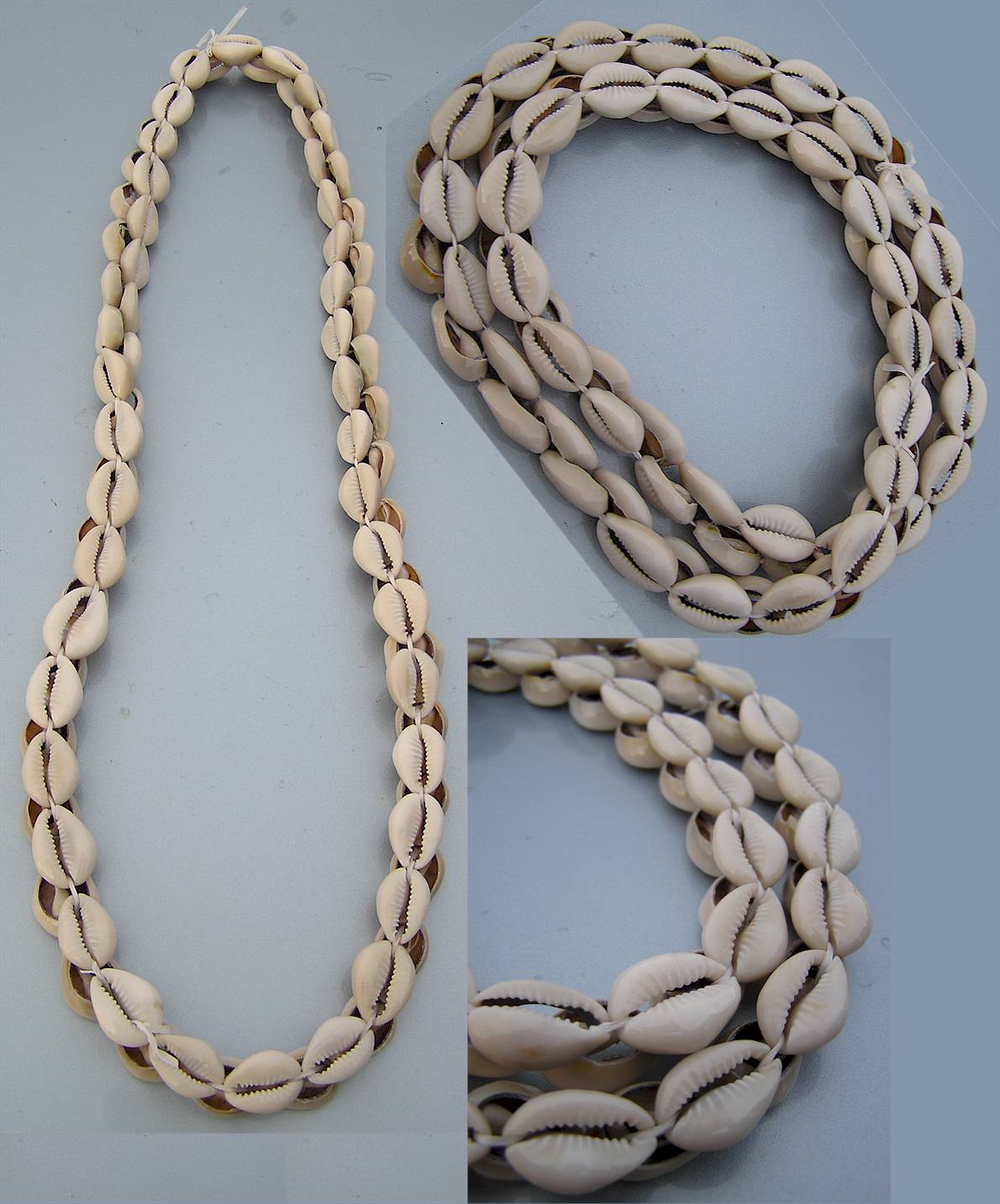 On offer is a handsome double strand necklace of cowrie shells/ beads, most likely from Western Africa. We believe this may have been produced by the Yoruba people of Nigeria. This beautifully weighted necklace could be worn as is, or disassembled for use in various artistic &/or crafts projects such as jewelry-making, etc. The shells have been carefully sliced lengthwise, with a slim portion of their enclosed side removed to facilitate setting the shells against each other "back to back" in an alternating double row pattern. This would also enable the individual shells to be more easily placed against a flat platform of some sort, such as metal, fabric, etc. Overall condition of the necklace/shells is very good to excellent.