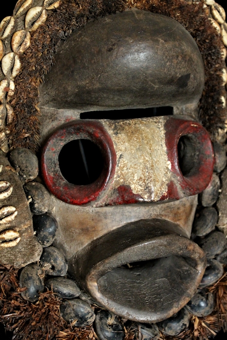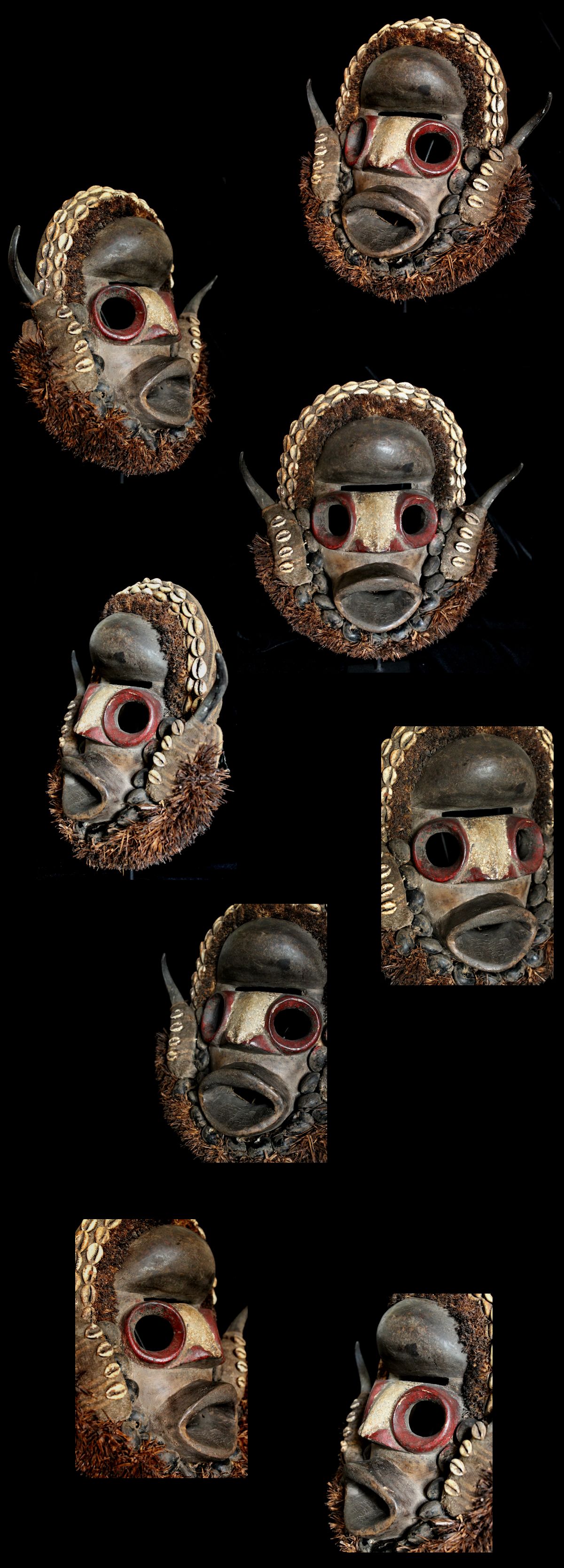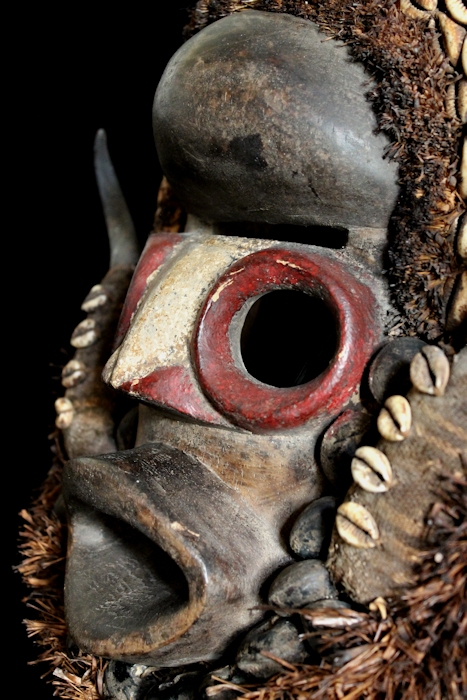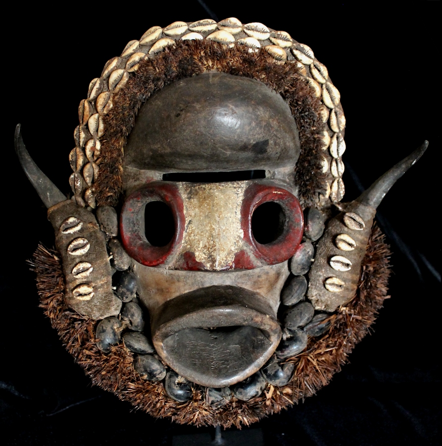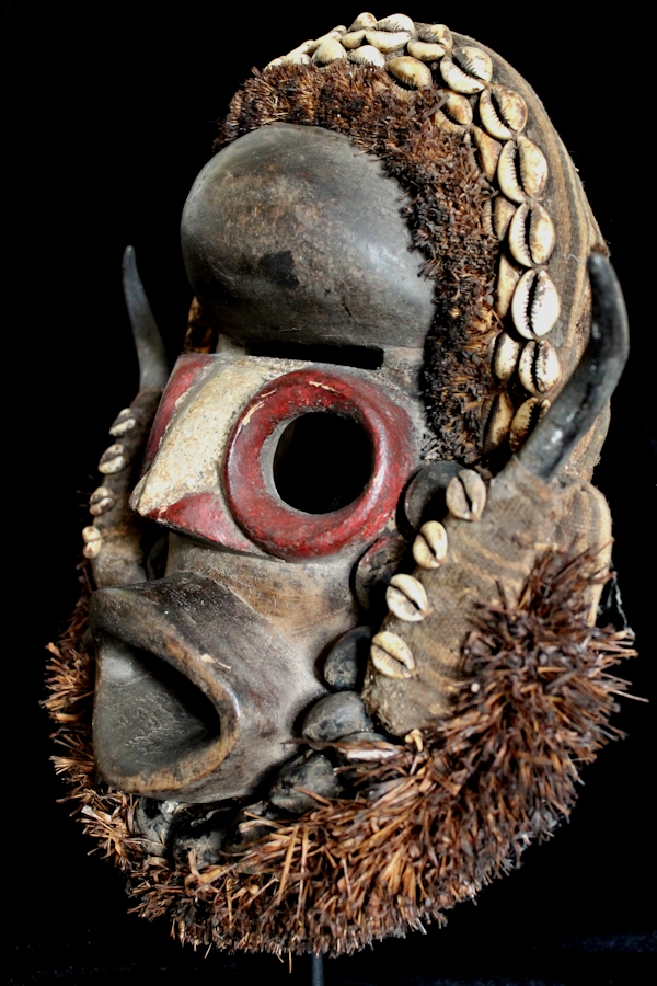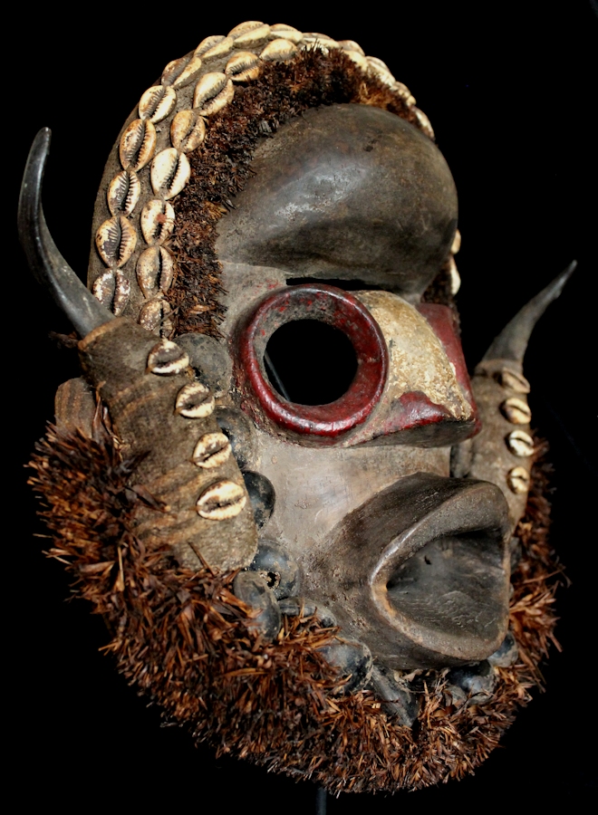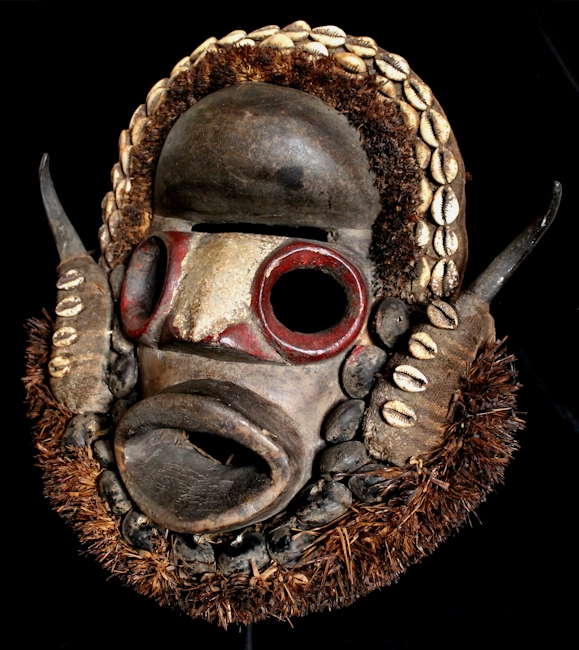 With its red-pigmented tubular eyes & large, open & protruding mouth, the mask takes on an aggressive appearance. Kaolin has been applied to the broad nose. Rolled fabric surrounds the perimeter of the mask, with a double row of cowrie shells & raffia crowning the high-domed brow. Horns studded with additional cowrie shells frame the face, while betelnuts & a raffia beard edge the jawline. We believe the mask's function may be for use by tribal warriors for fending off opposing forces.