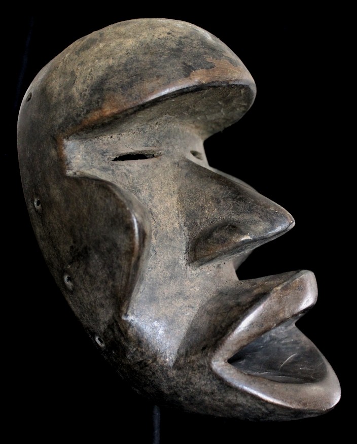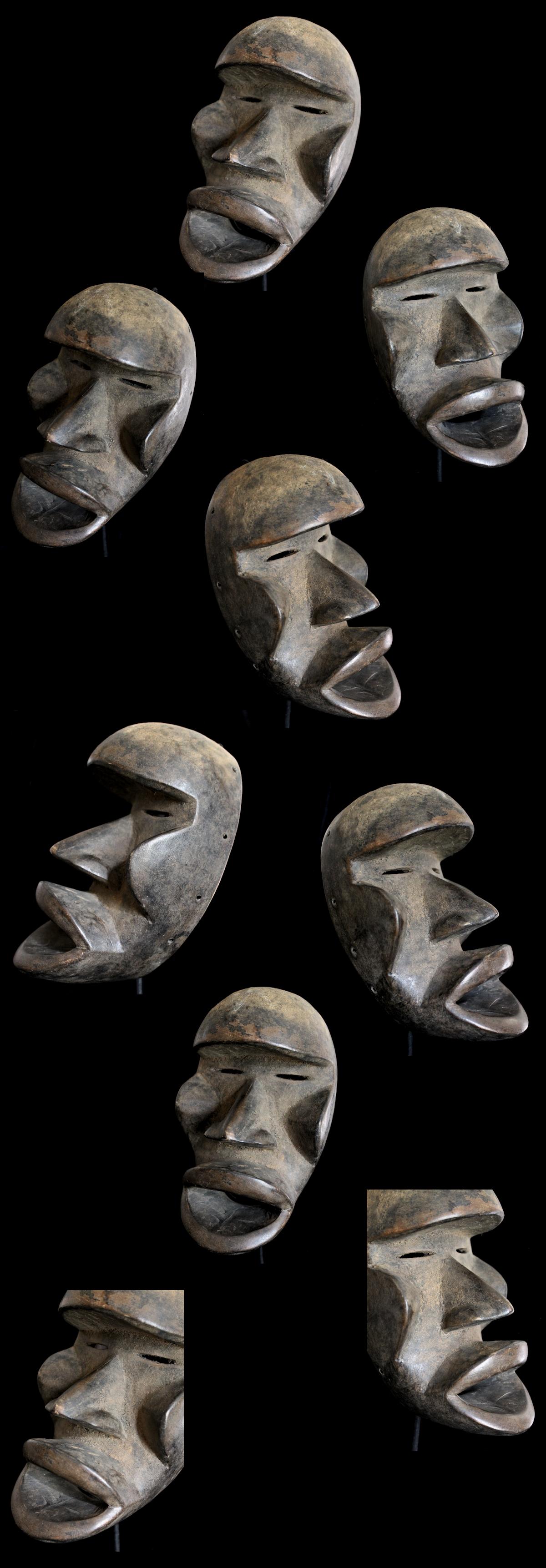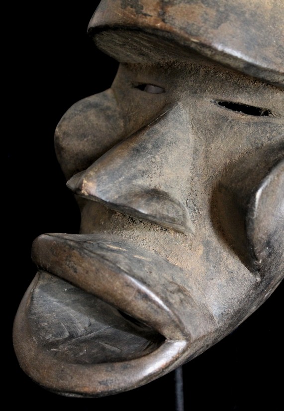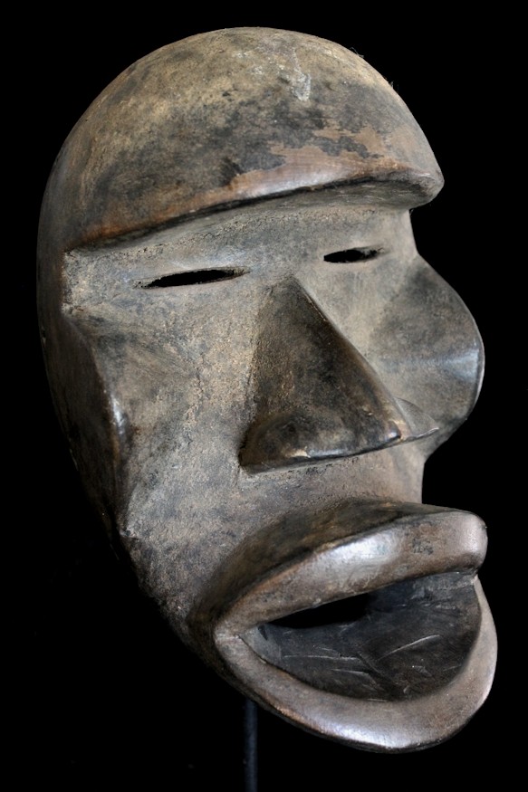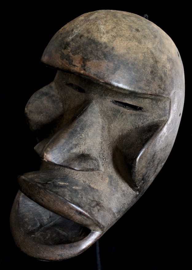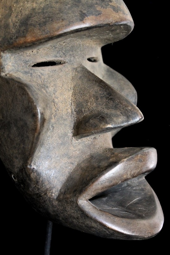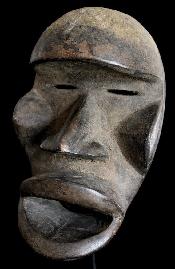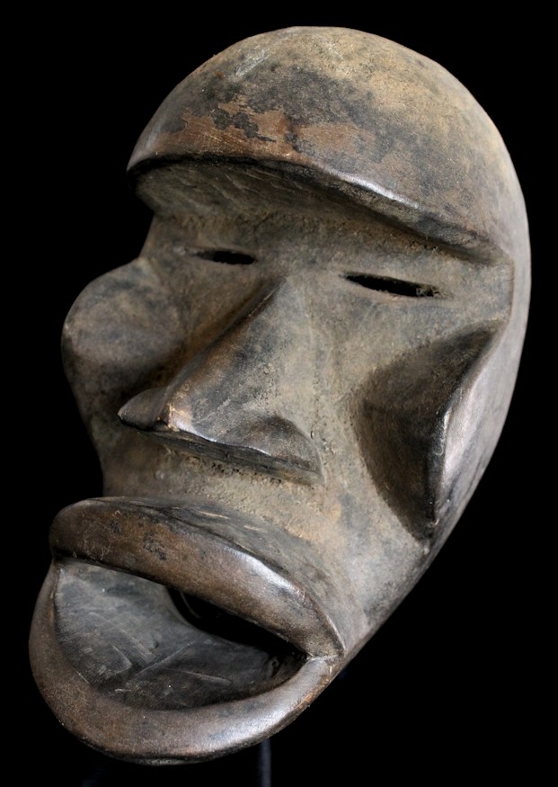 On offer from our personal collection is this powerful face mask from the Dan/Grebo peoples of Liberia. The exaggerated, protruding lips & open mouth give the mask a somewhat aggressive presence. A large, broad nose is set between dramatically raised cheekbones. Nearly obscured by the massive high-domed brow, the narrowly slit eyes lend a covert spirit to the piece.
