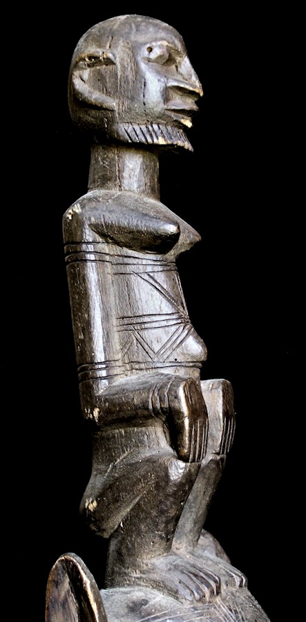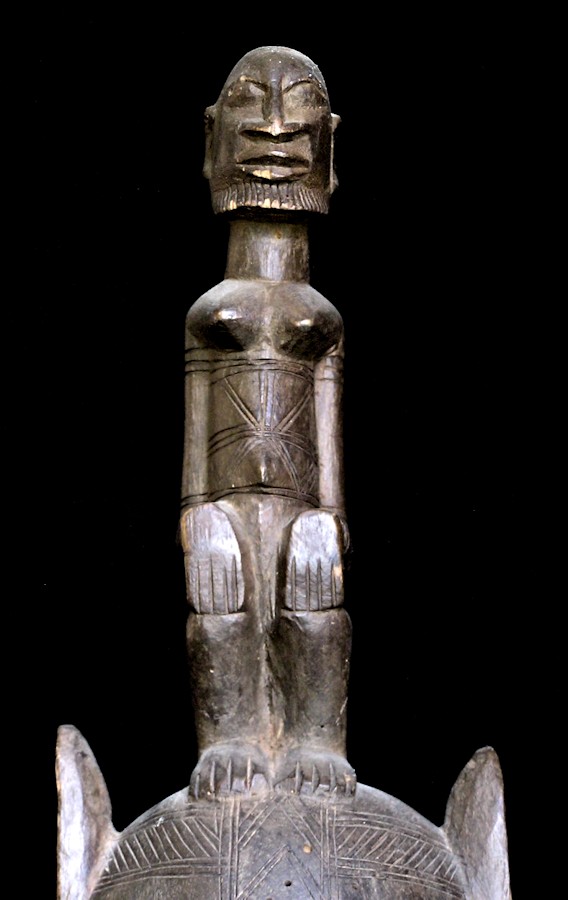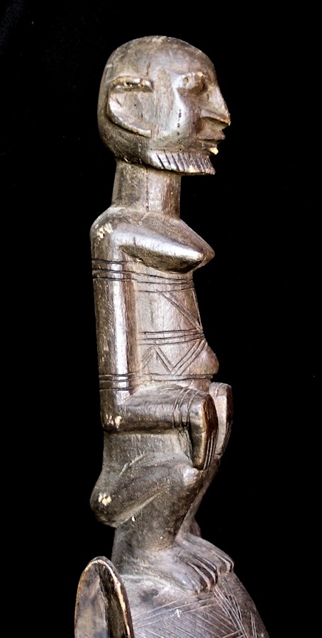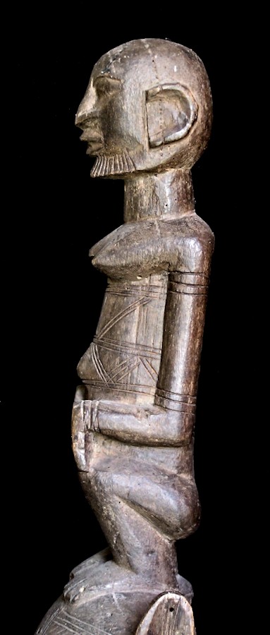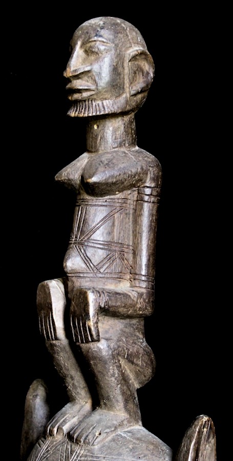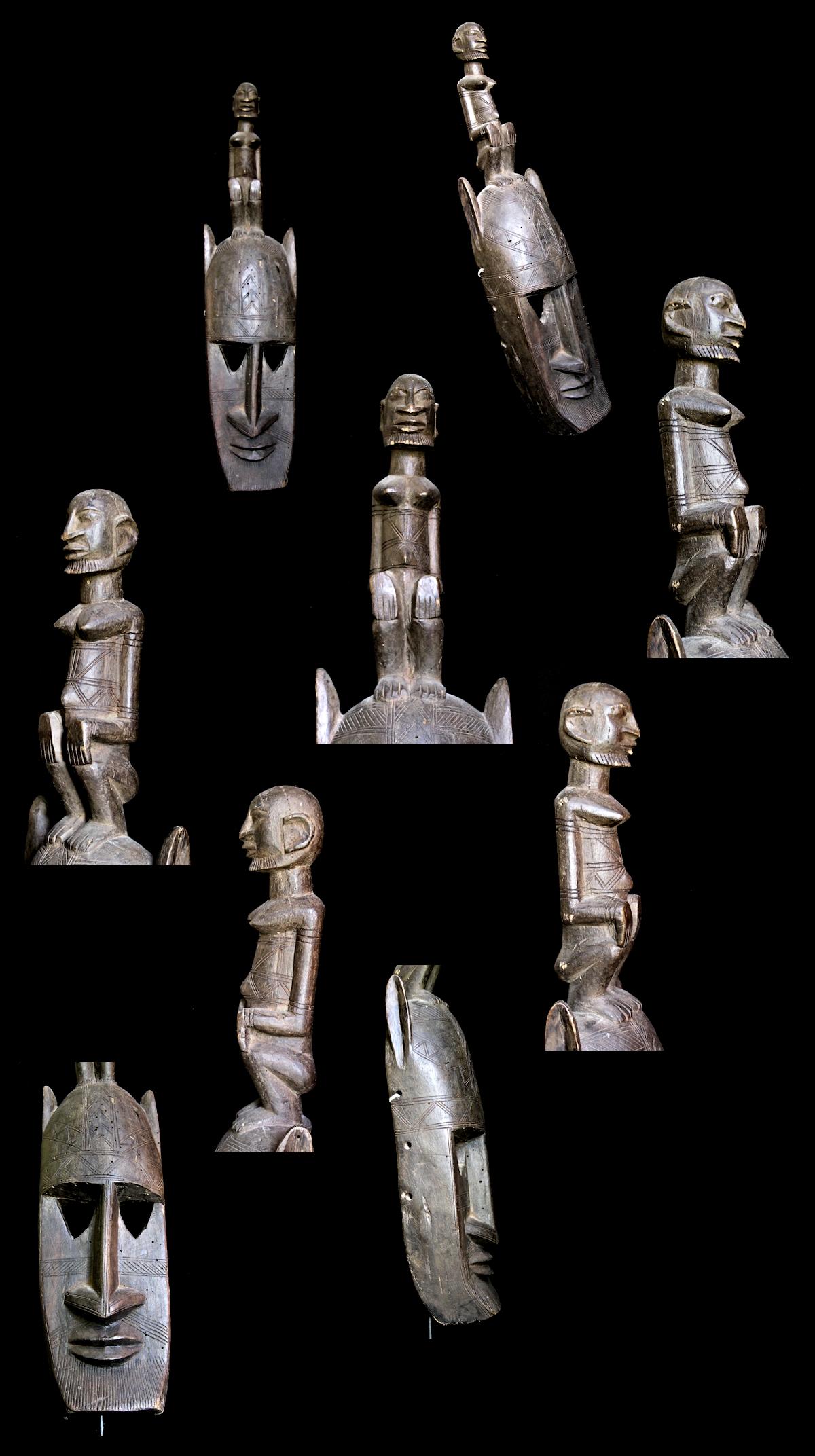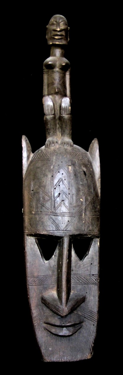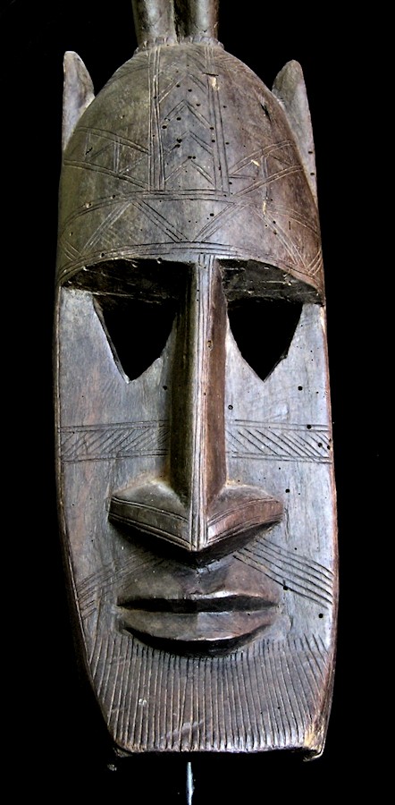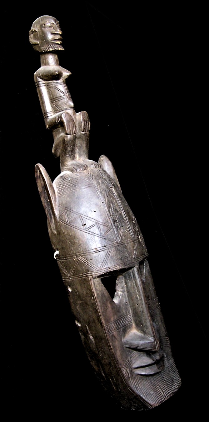With its thin-walled construction, this well-carved mask is tall, rather slender, & exhibits classic features. Incised scarifications create multiple patterns across the face, as well as on the torso & arms of the nommo superstructure perched atop the mask. Set in under the brow, open triangles form the eyes of the mask, while the nose takes on the traditional 'arrow' shape used by the Dogon in much of their carvings, not least of which is the nommo figure that adorns this piece. Zoomorphic ears frame the upper brow of the mask's face. The powerful, crouching nommo superstructure bears hermaphroditic characteristics with its breasts & bearded face. Attachment holes perforate the side-rims of the piece.