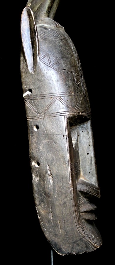 With a fine, well-developed patina, the mask shows age- & use-related wear. Despite some imperfections in the wood, including old insect damage (arrested), scrapes & abrasions, dry age-cracks, & a few old chips (including those along the bottom & back rims), the mask is in good overall condition. A small area to the left on the mask's upper brow has worn through, forming a small, irregular hole. At just over 24-inches in height, this imposing piece makes a powerful, compelling display, & would be an excellent addition to any serious collection.