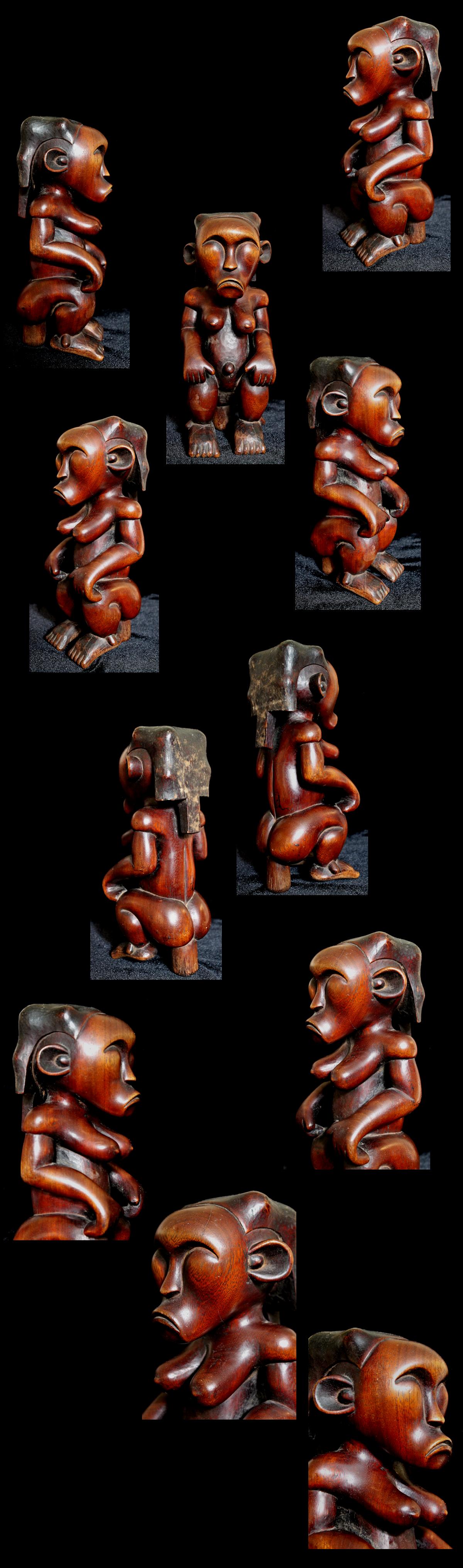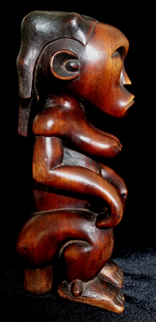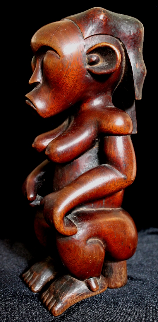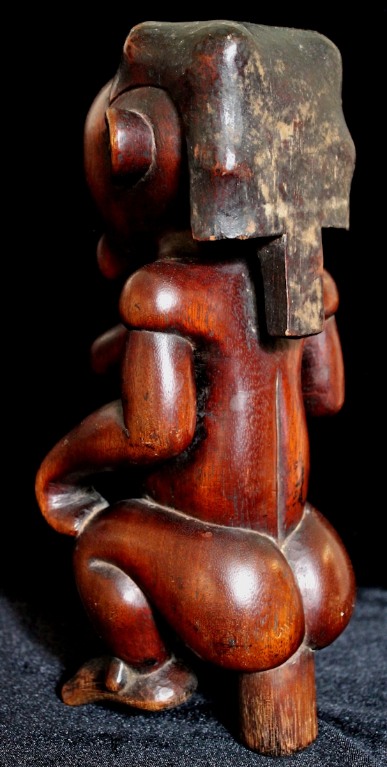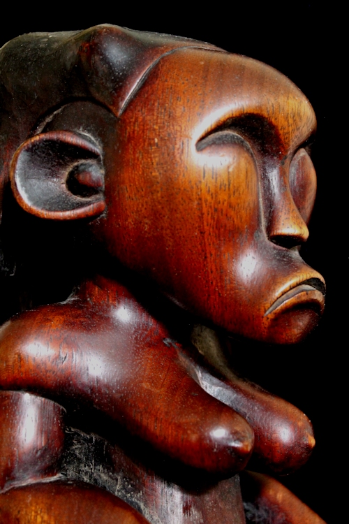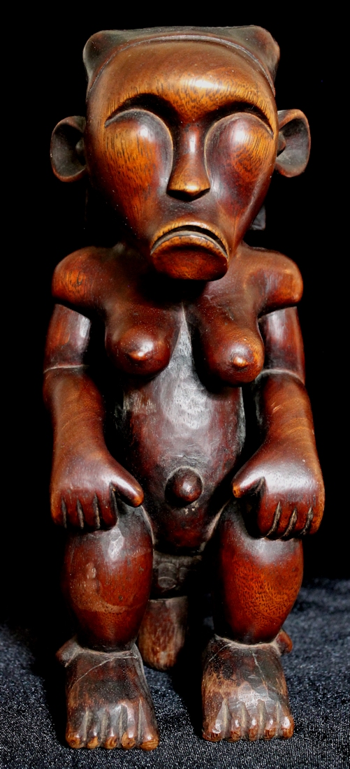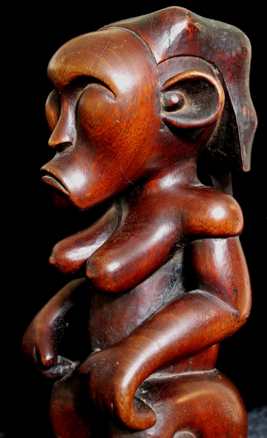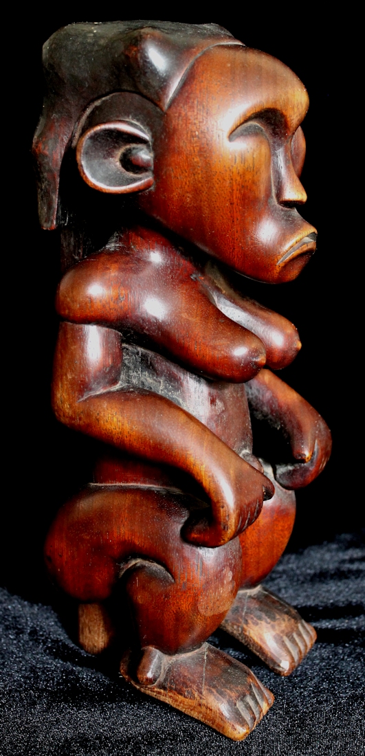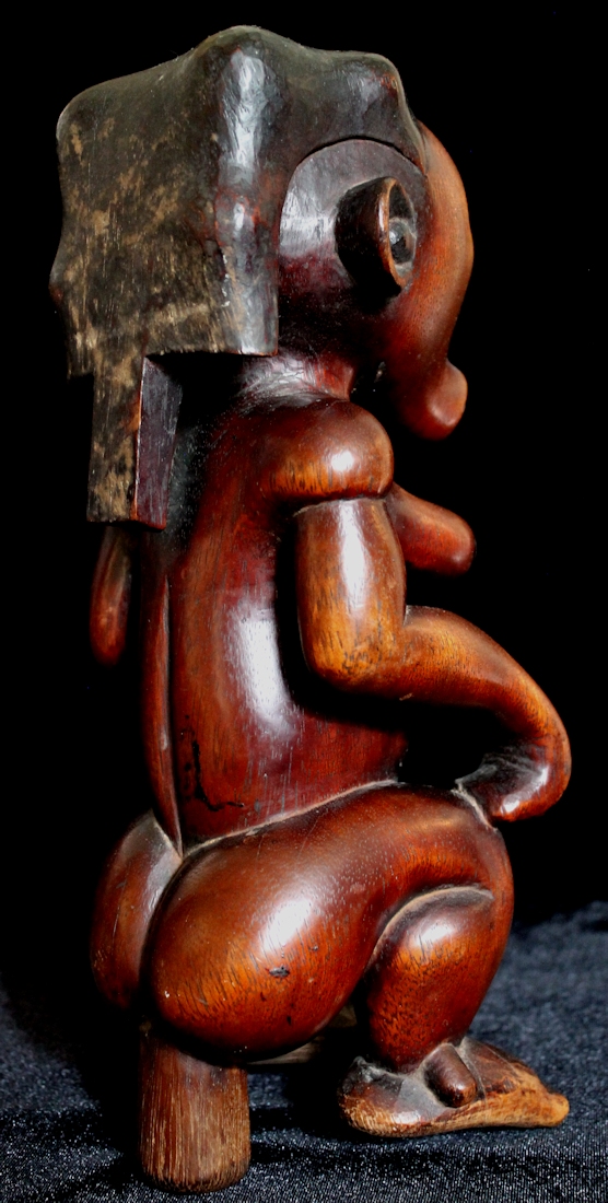 From our personal collection, on offer is a beautifully sculpted Byeri figure from the Fang peoples of Gabon. Such figures are intended to guard the relics of tribal ancestors, & are placed atop the containers housing the ancestral relics. The "stem" supporting the figure's buttocks would be used to help secure the statue by inserting it into the lid of the Byeri box.