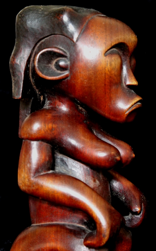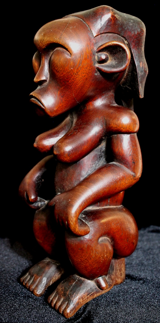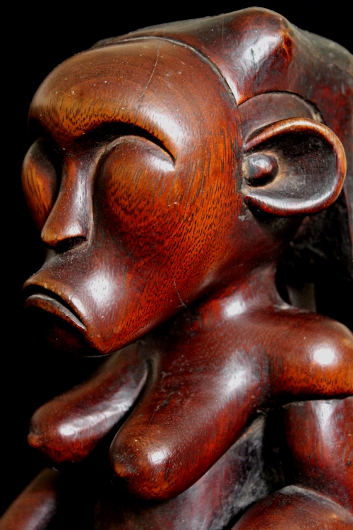 We believe this piece to be the result of a gifted carver's more contemporary interpretation of the traditional Byeri form. We were struck by its smooth, curvaceous contours. The richly grained, heavy wood has been expertly carved to reveal a highly stylized figure with prominent chin, shapely breasts, & rather bulbous buttocks.