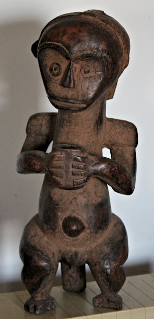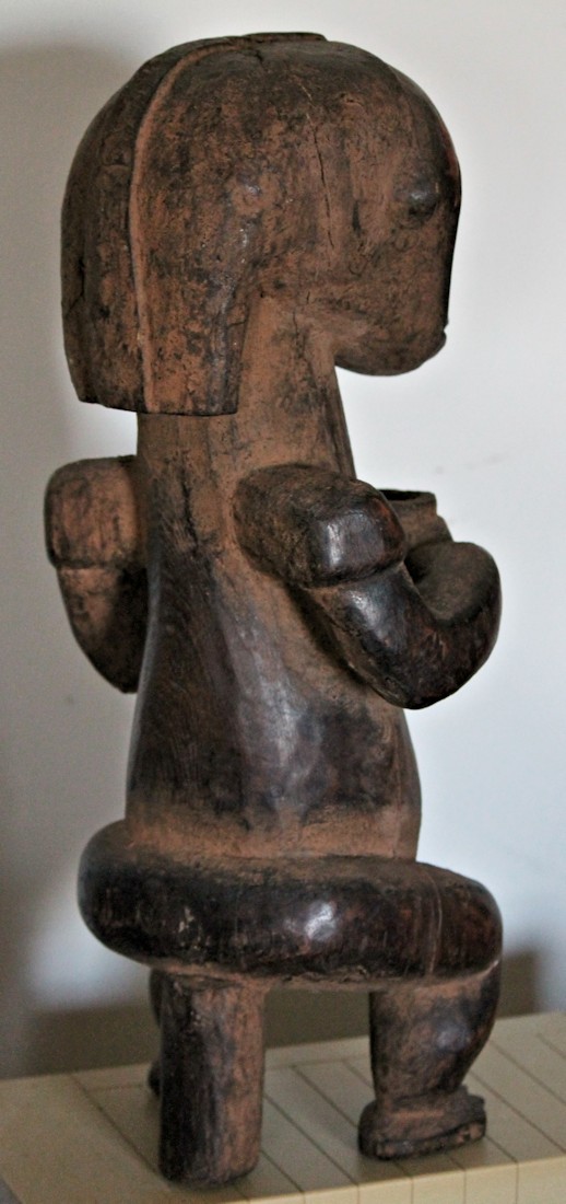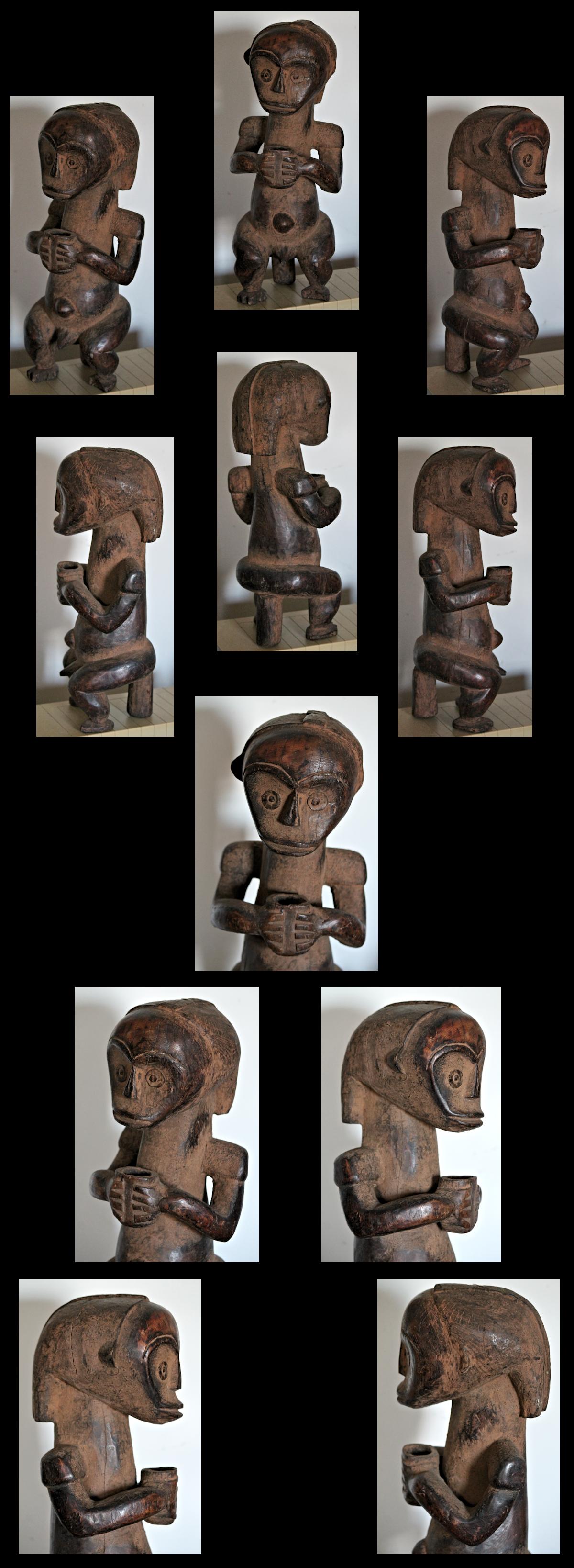 On offer from our personal collection is this superb old Byeri figure from the Fang peoples of Gabon. Such reliquary figures are intended to guard the relics of tribal ancestors, & are placed atop the containers housing the revered ancestral relics. The "stem" supporting & protruding from the figure's buttocks is used to help secure the statue by inserting it into the lid of the Byeri box.