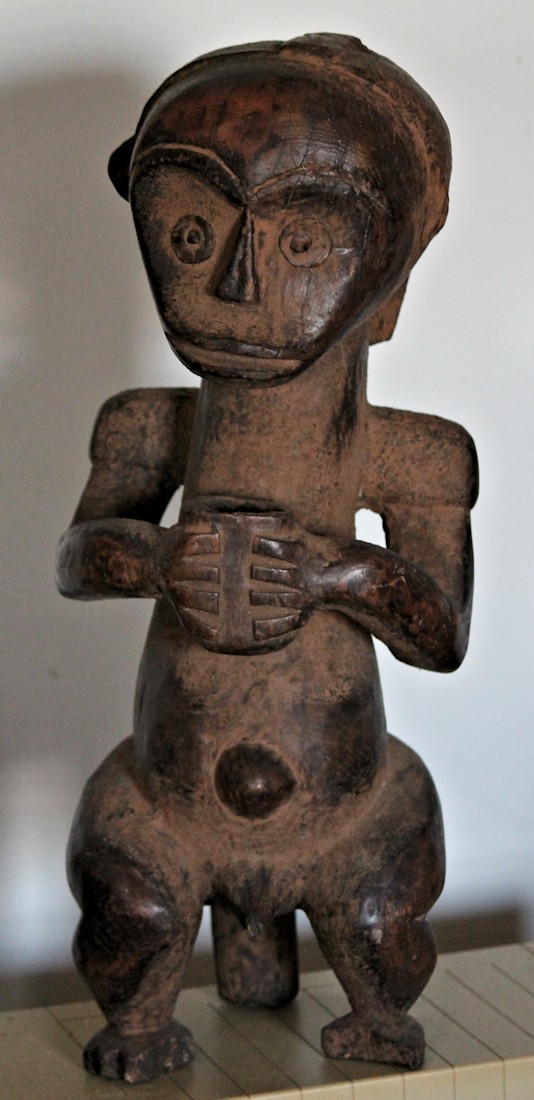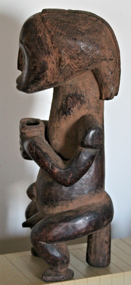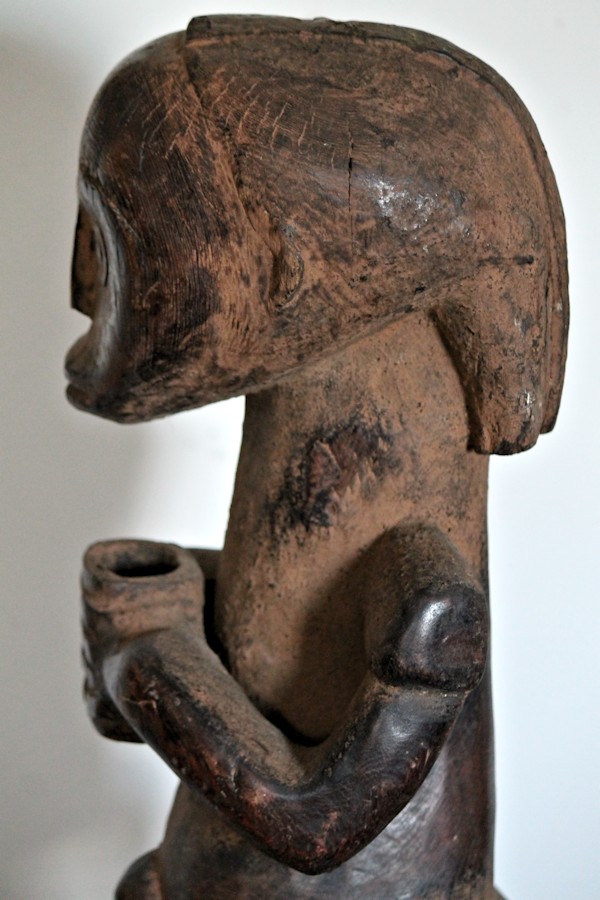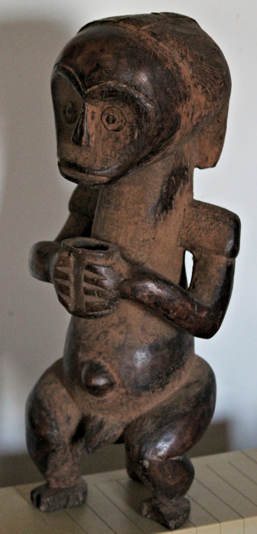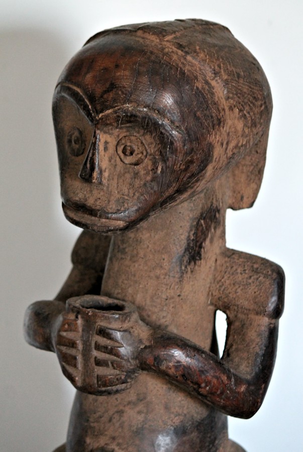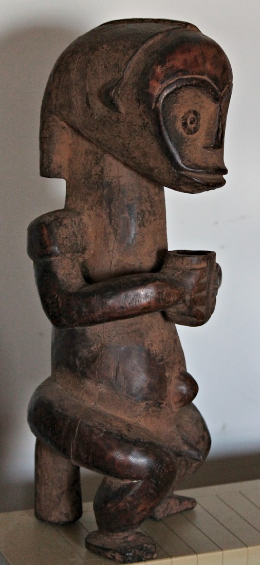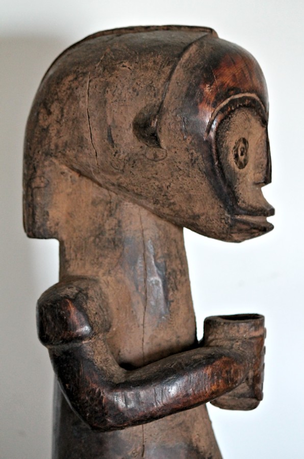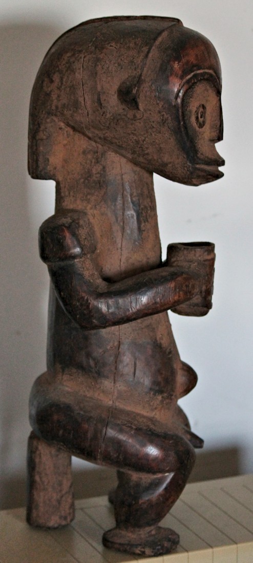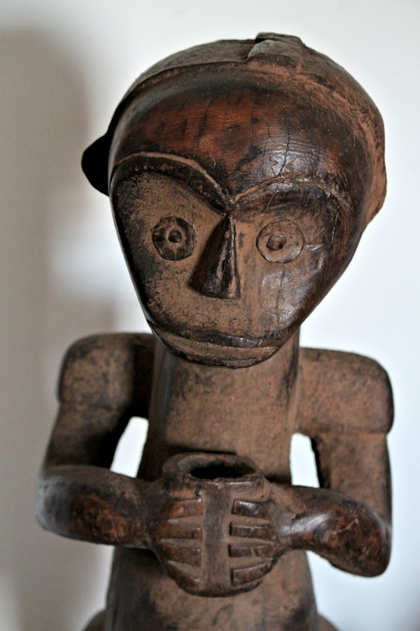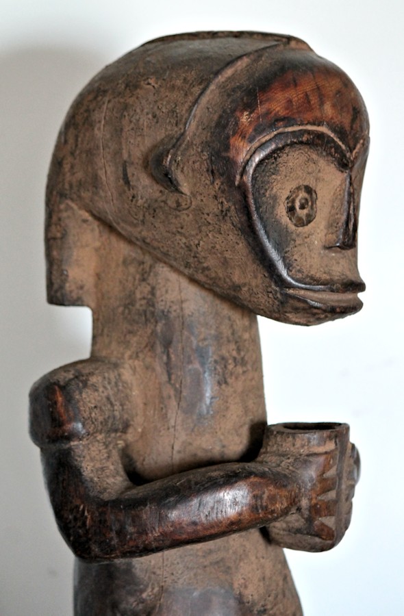 Beautifully carved classic features characterize this sensitive sculpture. The male figure is presenting an offertory cup, supported by both hands. Flat discs are set in place for his eyes, a technique often used by the Fang.