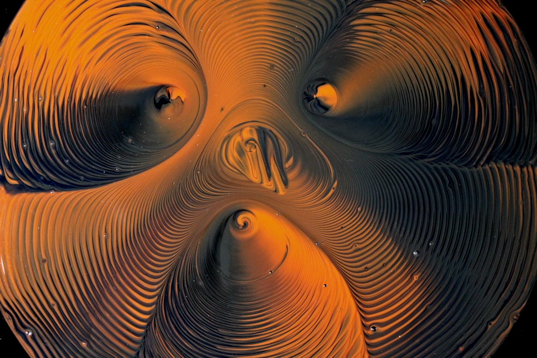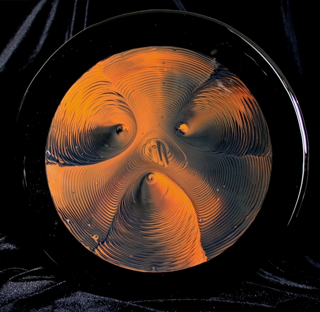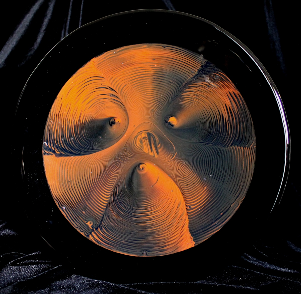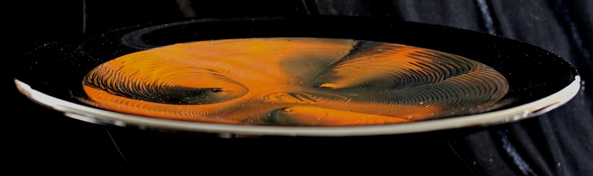 A heavy piece weighing ca. 4-lbs., this food-safe platter features a 1.5" black border that harbors an intense, luminous inner core pattern of copper/orange-&-black abstract swirls. In as new condition, this piece has been used for decorative display only. Measuring 12" in diameter, & ca. 1.5" in depth, this vibrant glass work is also translucent & can be illuminated from behind, making a most eye-catching display.