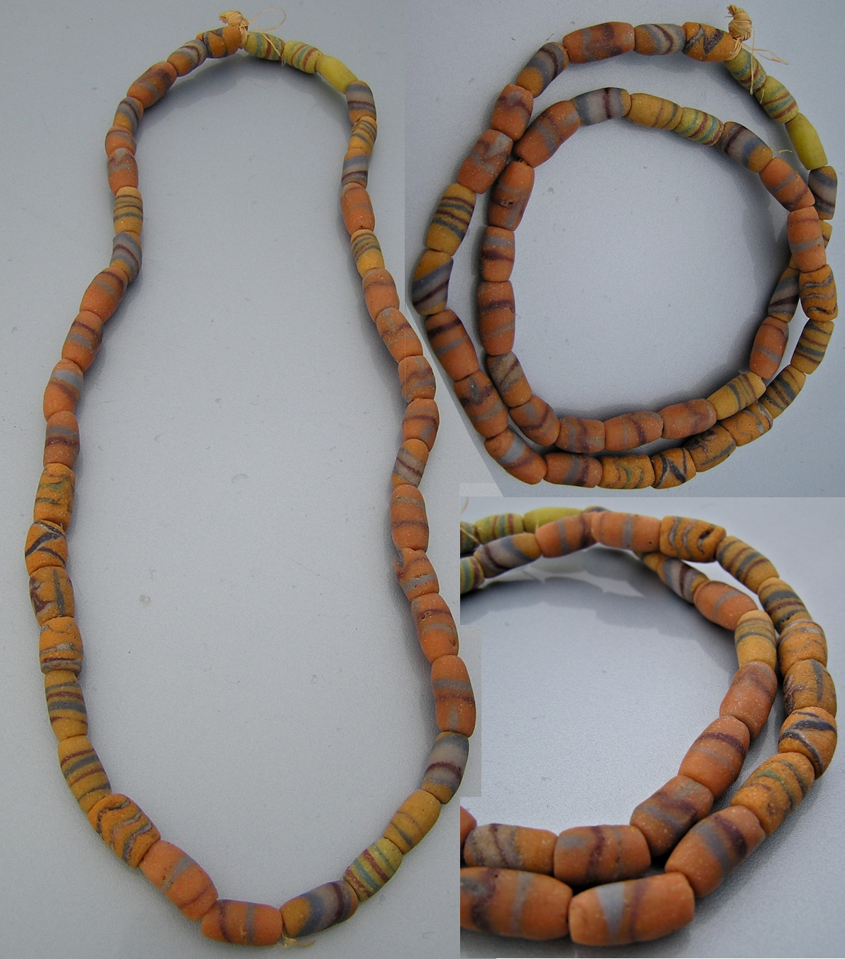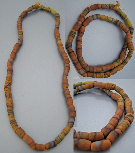 On offer is a single strand of mixed, colorful powdered glass beads from the Krobo people of Ghana. The beads are crafted by pulverizing pieces of glass into a fine powder, which is then poured into molds formed of clay. The filled molds are fired in kilns or hot ovens, whereupon the powdered glass fuses. Typically, the handcrafted beads will exhibit minor imperfections, including signs of age & wear. Overall condition of these vintage beads is good. The strand could be worn as is, or the beads can be used individually for jewelry-making projects, etc.