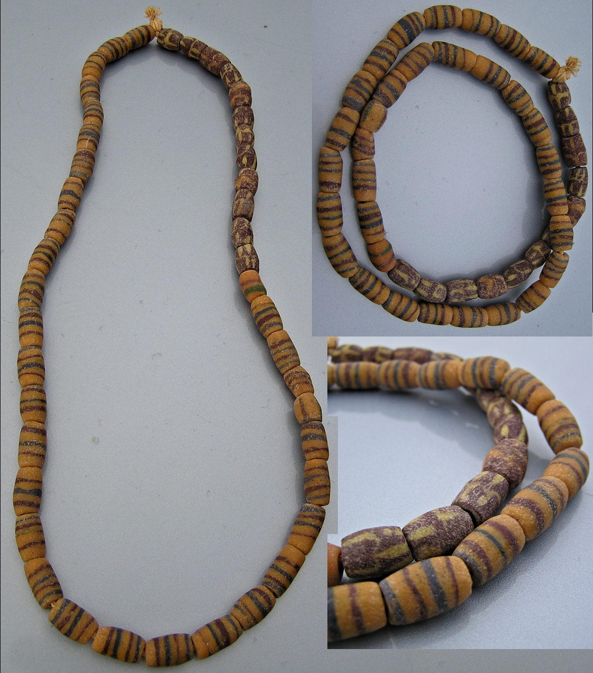 On offer is a single strand of matched, colorful powdered glass beads from the Krobo people of Ghana. The beads are crafted by pulverizing pieces of glass into a fine powder, which is then poured into molds formed of clay. The filled molds are fired in kilns or hot ovens, whereupon the powdered glass fuses. Typically, the handcrafted beads will exhibit minor imperfections, including signs of age & wear. Overall condition of these vintage beads is good. The strand could be worn as is, or the beads can be used individually for jewelry-making projects, etc.