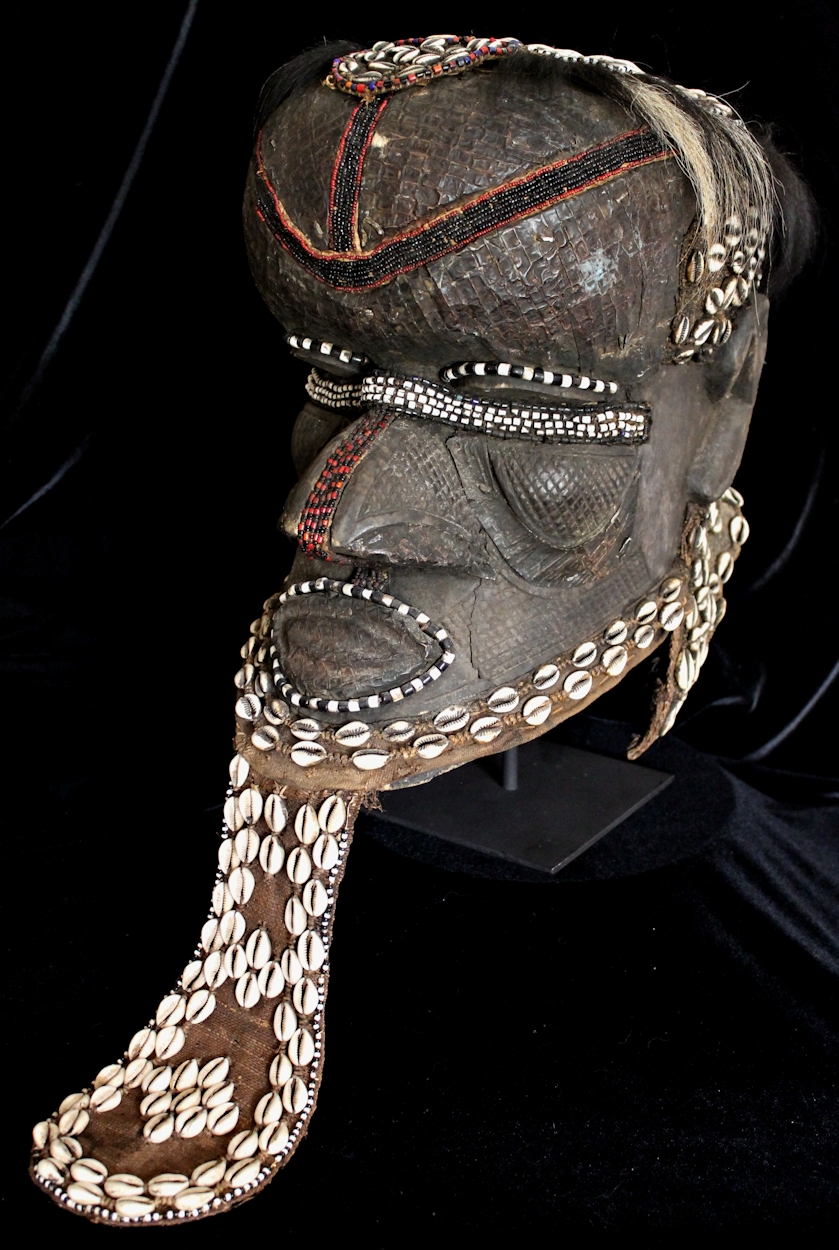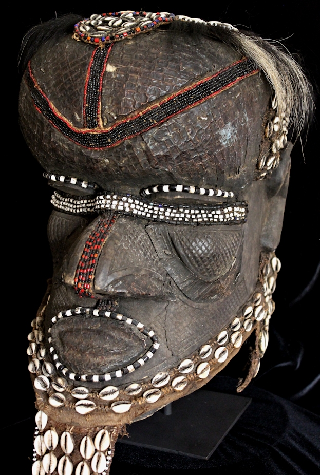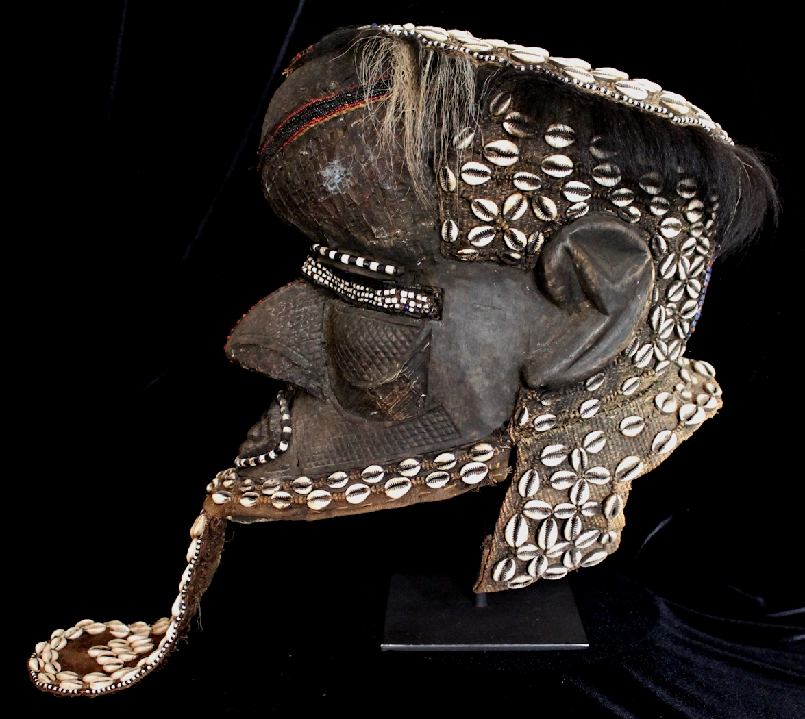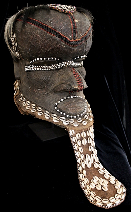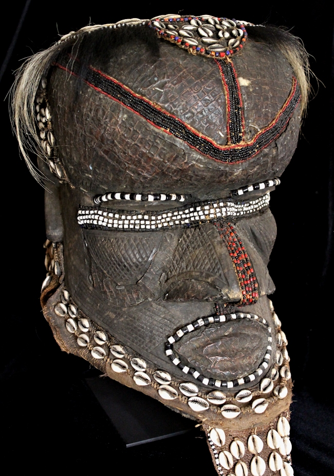 Exaggerated features are a notable trademark of the masks representing Bwoom, such as the bulging brow & broad nose. This massive piece is generously embellished with metal, cowrie shells, beads, & fur. Thin metal sheeting has been applied to the surface of the brow, & also accentuates the nostrils, mouth, & under the eyes. The "tongue" is liberally ornamented with cowrie shells & beads. Multiple beaded patterns criss-cross the eyes & bridge of the broad nose, as well as the forehead. Additional beads highlight the eyelids & mouth & other areas of the mask. An edging of fur decorates the uppermost rim of the mask.
