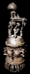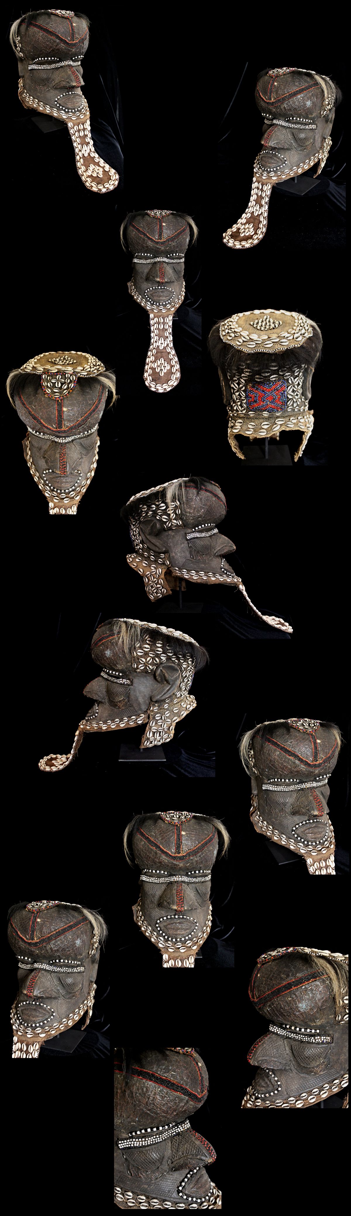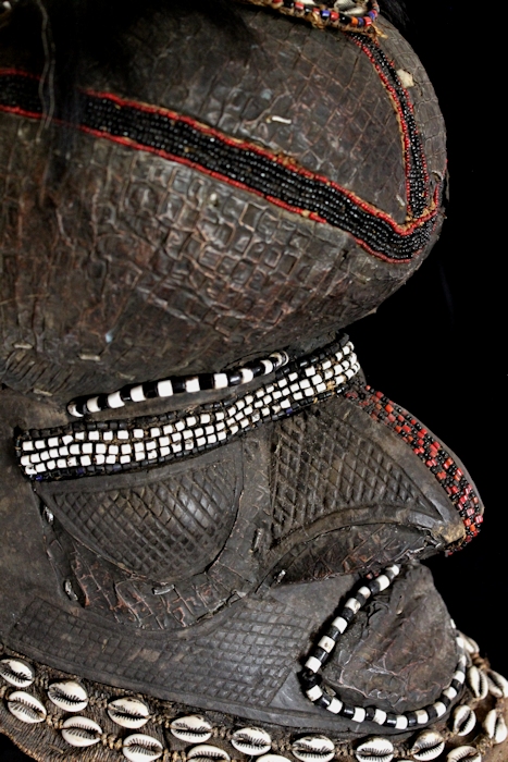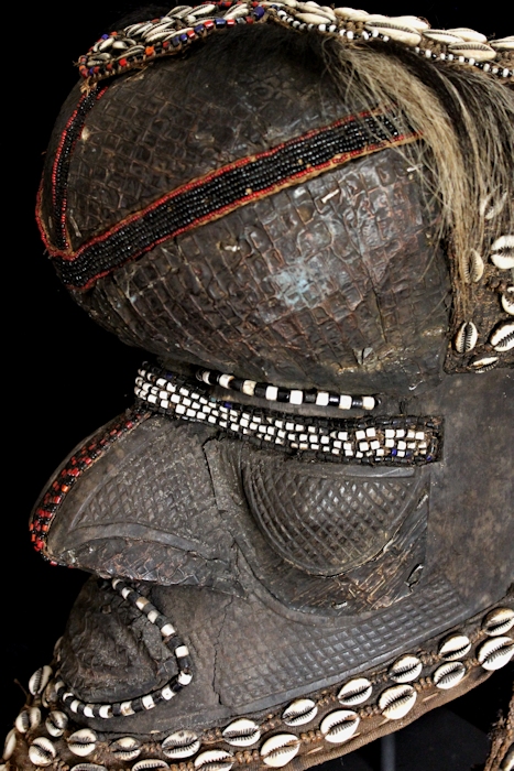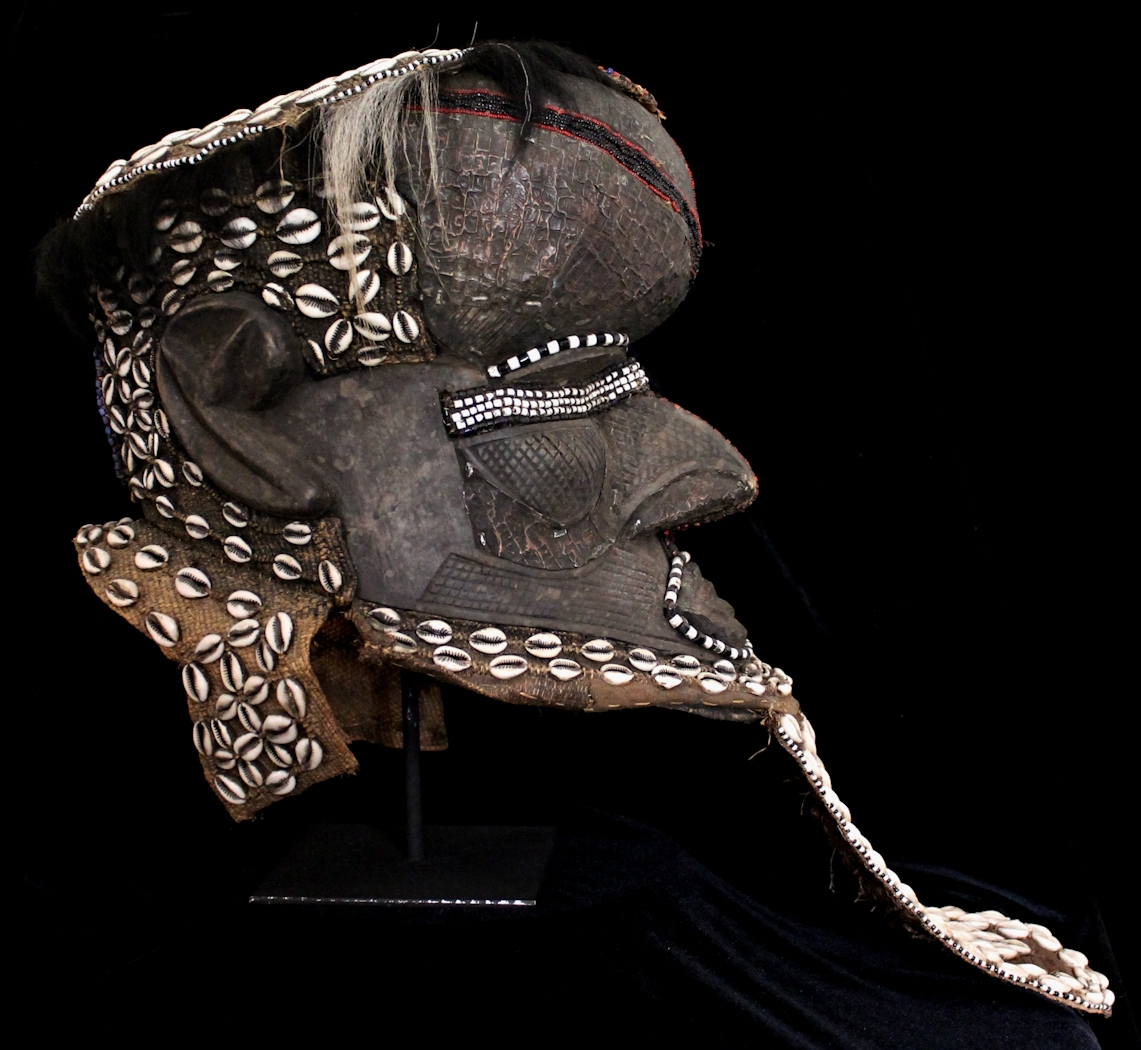 Exaggerated features are a notable trademark of the masks representing Bwoom, such as the bulging brow & broad nose. This massive piece is generously embellished with metal, cowrie shells, beads, & fur. Thin metal sheeting has been applied to the surface of the brow, & also accentuates the nostrils, mouth, & under the eyes. The "tongue" is liberally ornamented with cowrie shells & beads. Multiple beaded patterns criss-cross the eyes & bridge of the broad nose, as well as the forehead. Additional beads highlight the eyelids & mouth & other areas of the mask. An edging of fur decorates the uppermost rim of the mask.