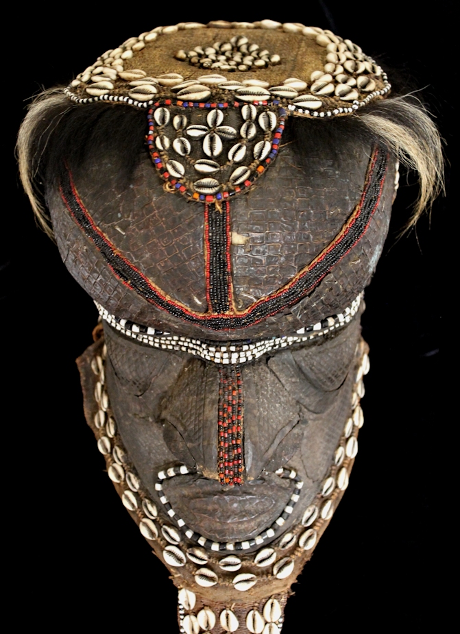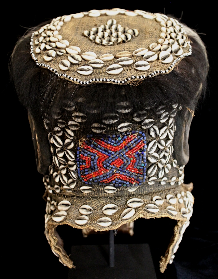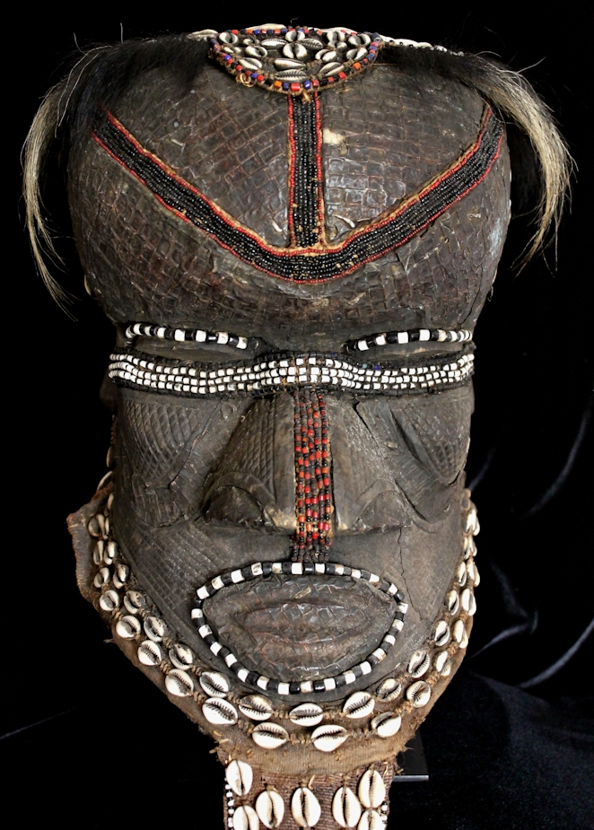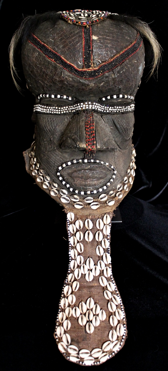 Despite some minor imperfections, including a few scuffs, a small piece of missing metal (from the brow), & an old age crack, the mask is in very good overall condition. All of its cowrie shells are in place, & nearly all of the beads are intact. This grand mask makes an imposing & powerful display.