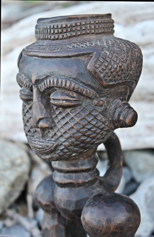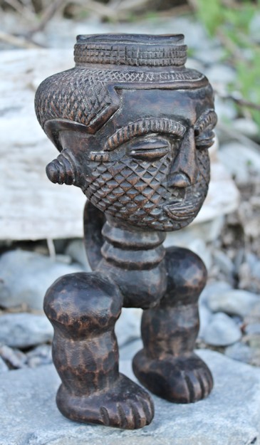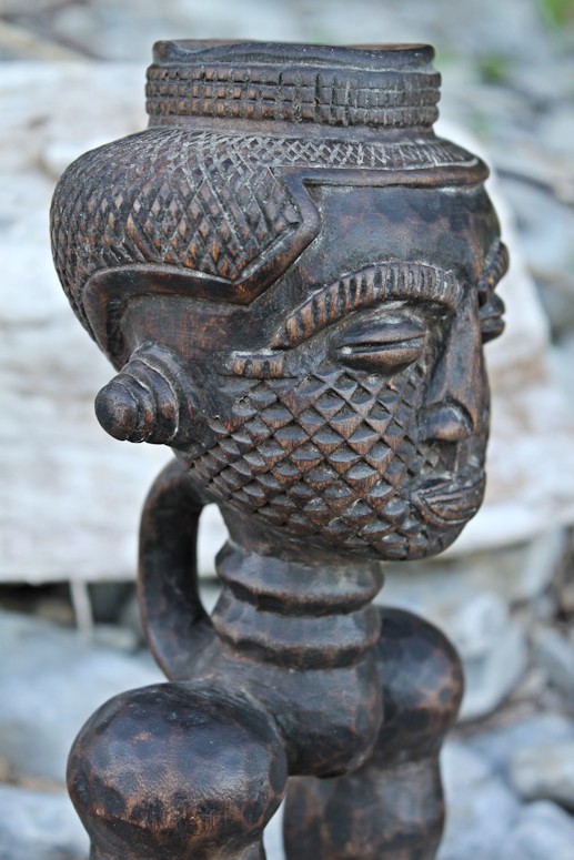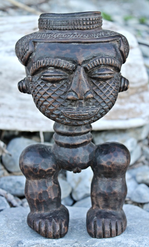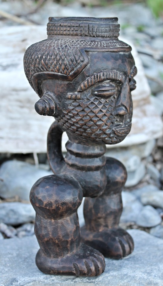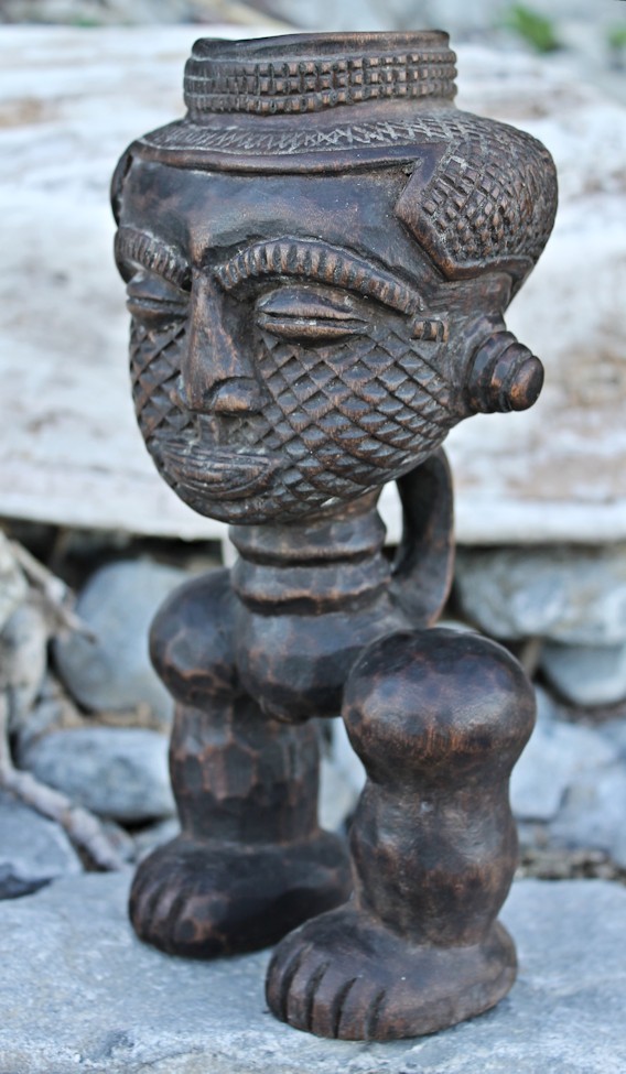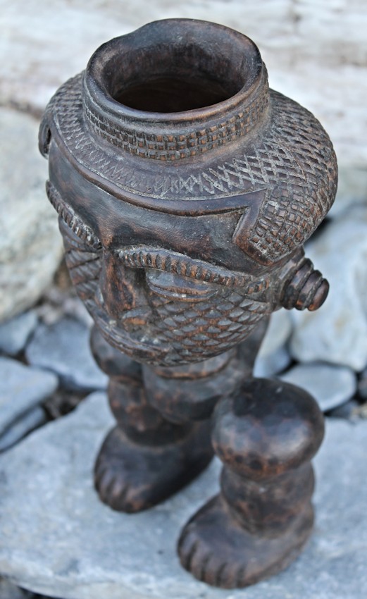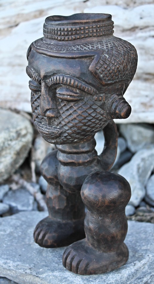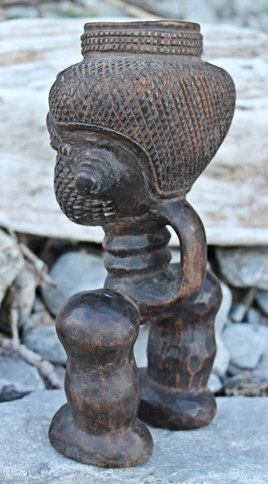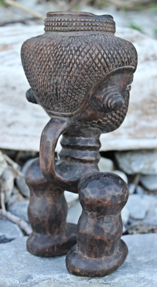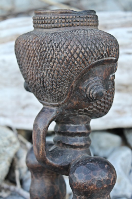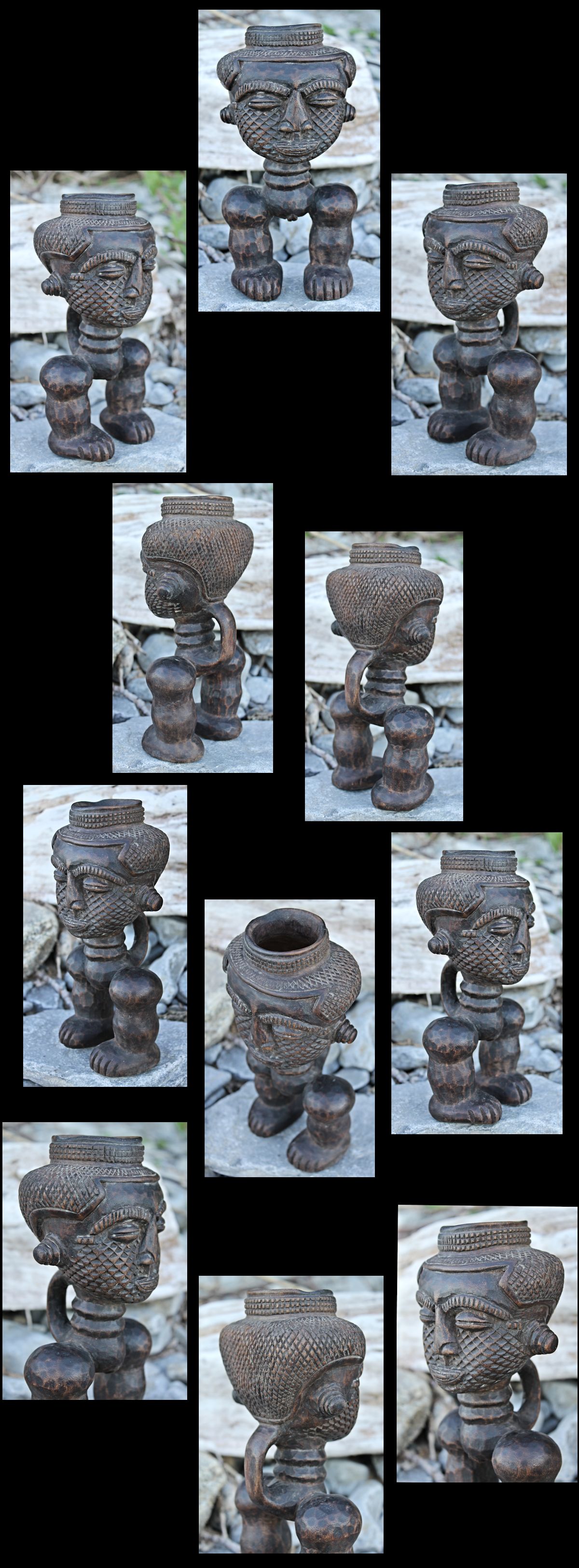 From our personal collection, on offer is this charming palm wine cup from the Kuba peoples of the DR Congo. Symbols of status, such cups often feature the geometric motifs & patterns the Kuba are so well known for, as is the case with this piece. An imaginative, somewhat abstract concept, the head of this vessel is supported by the neck & legs of a stylized female figure. The face, & back & top of the head, are highlighted by beautifully carved & incised geometric motifs. A handle is found at the back of the piece.