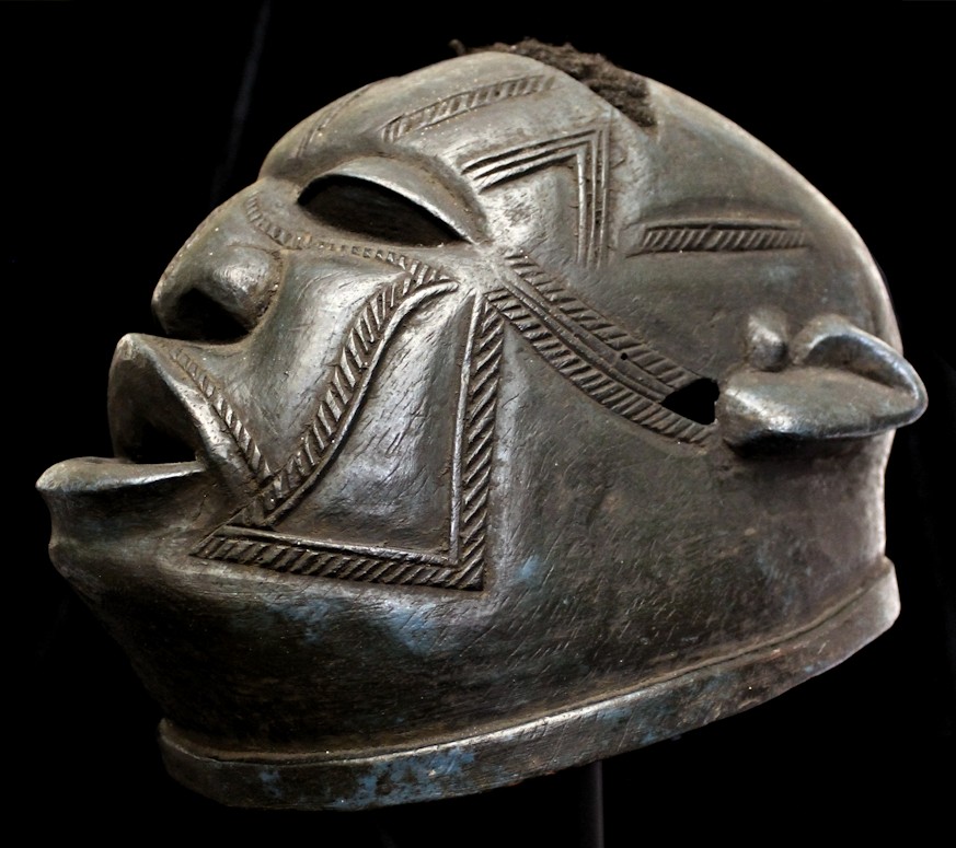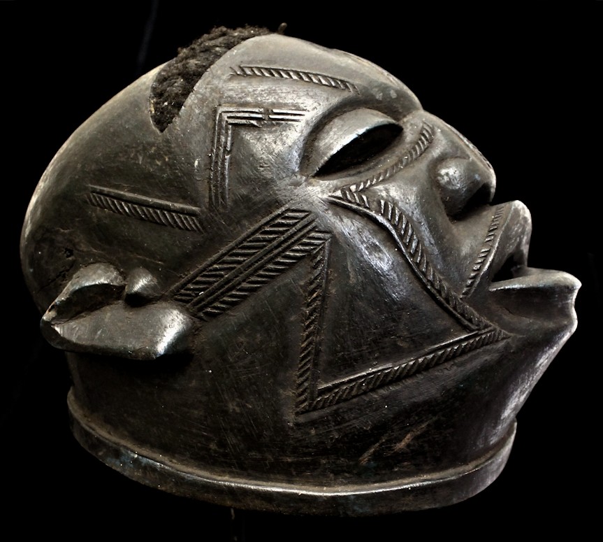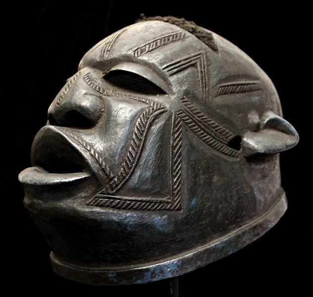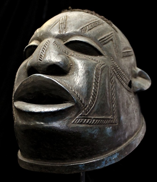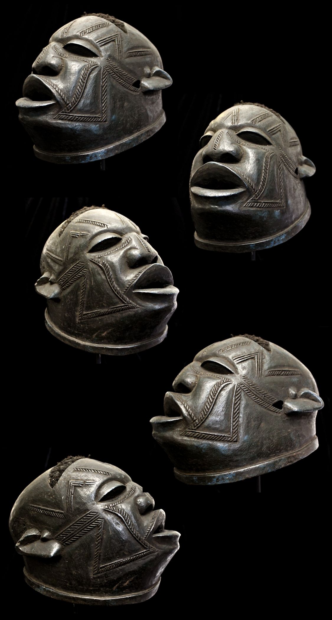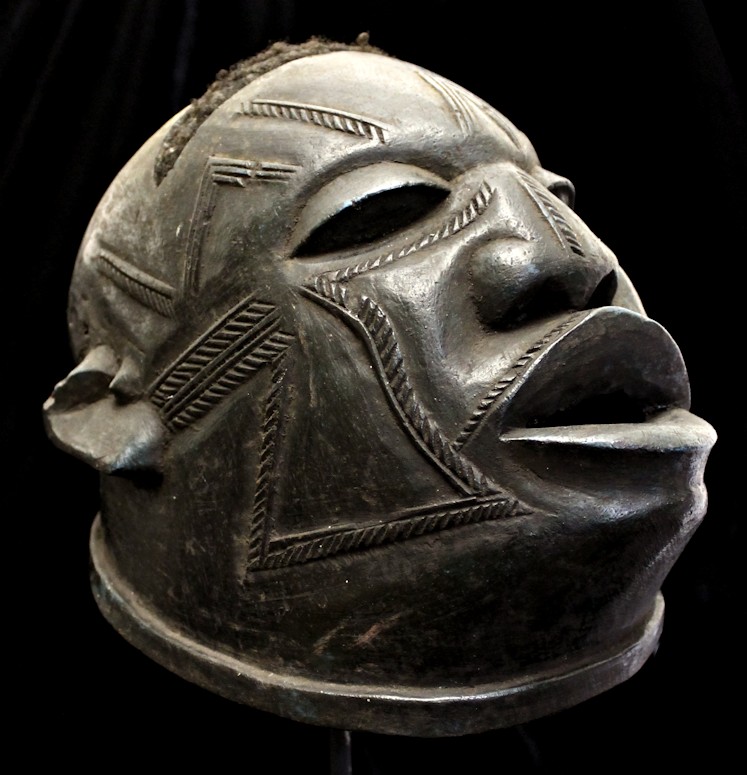 Characterized by strong, human facial features, superb raised & incised scarification patterns accentuate the cheeks, brow, under the eyes, across the upper lip, & along the bridge of the broad nose. Much of the mask's (human) hair is still intact.