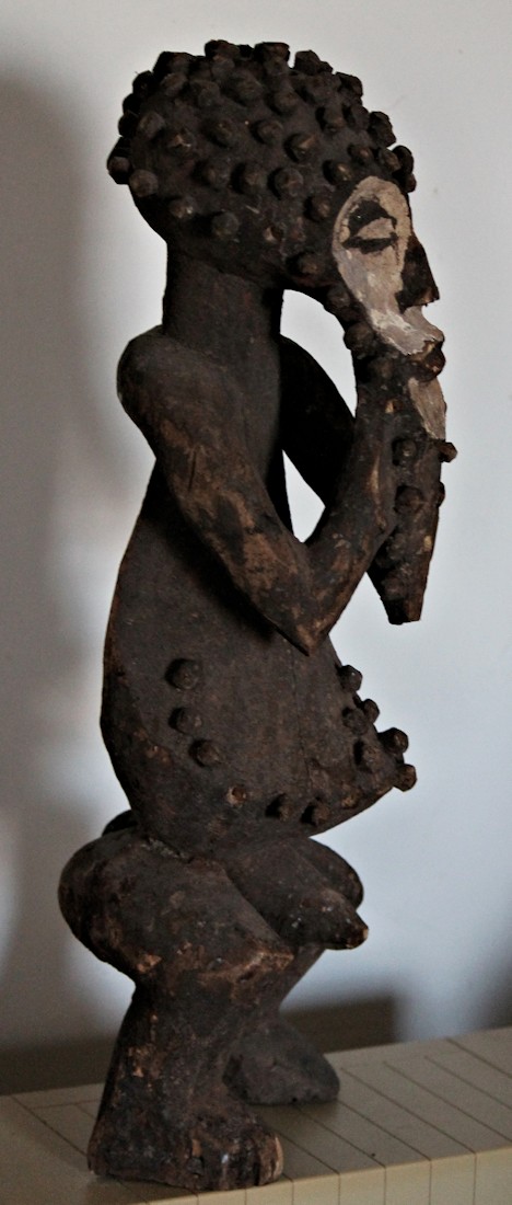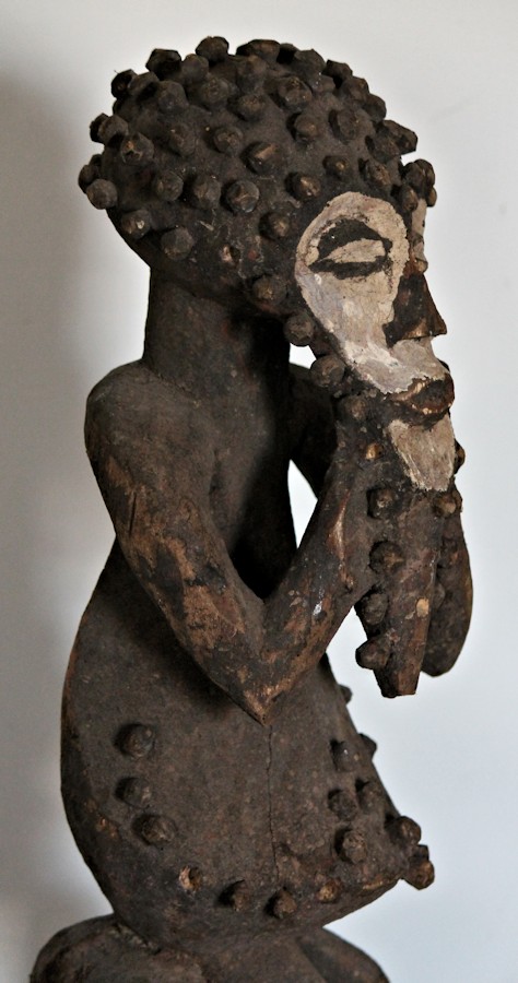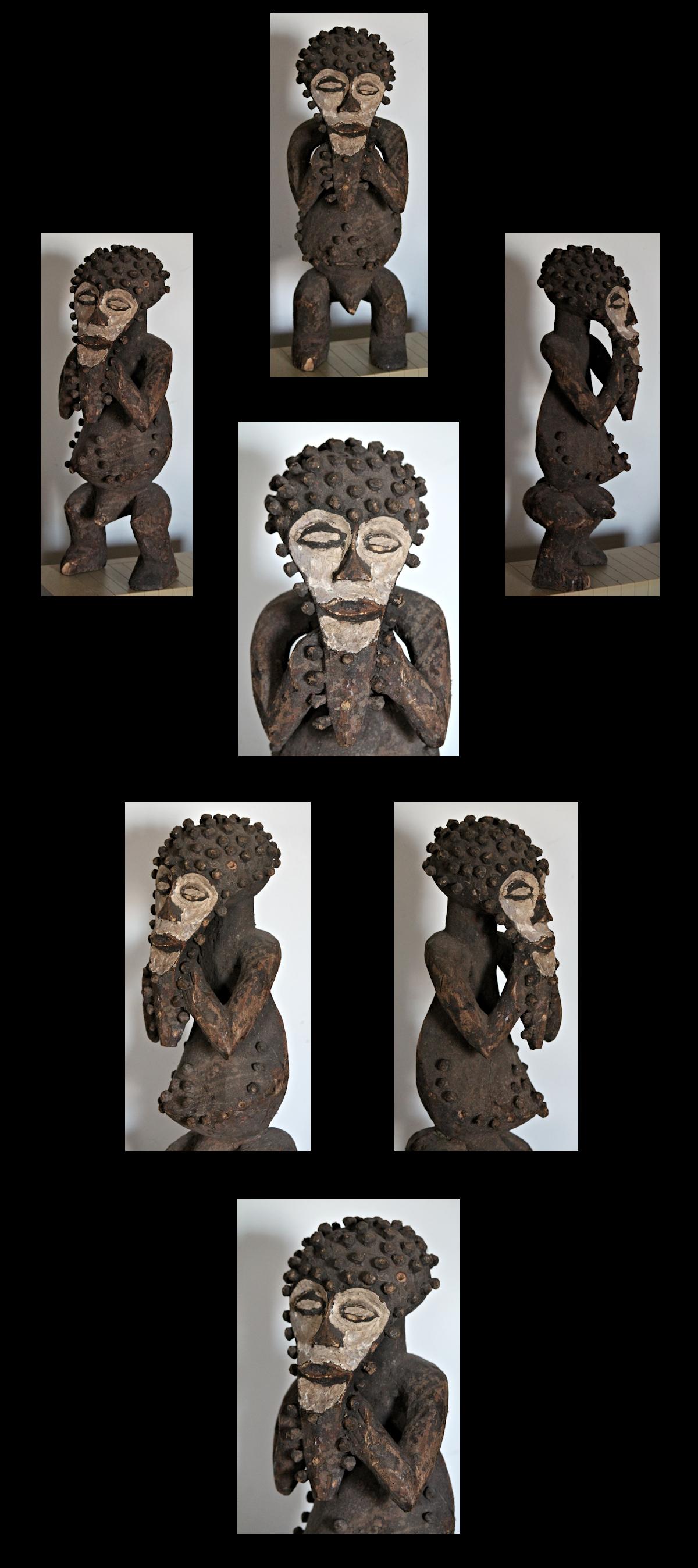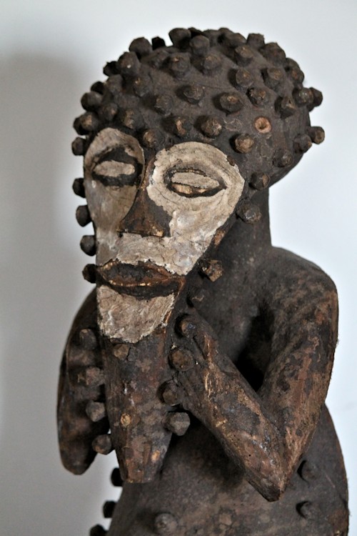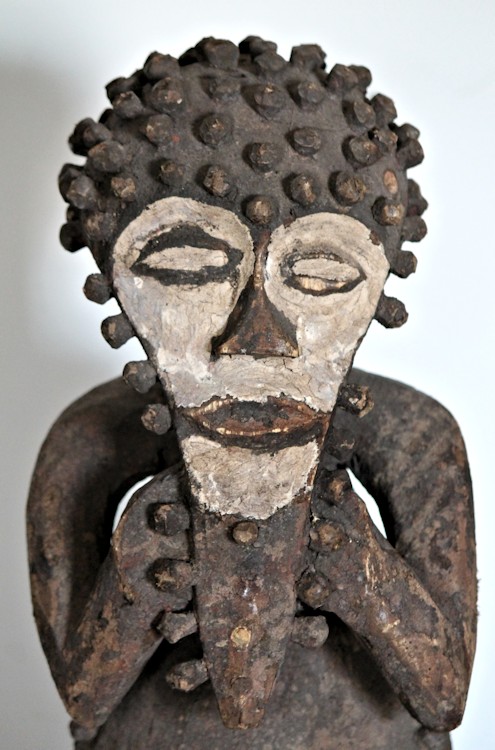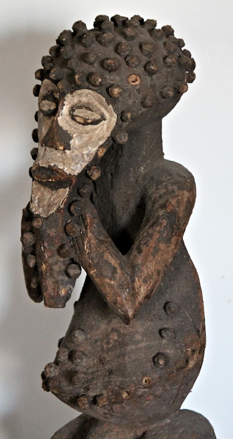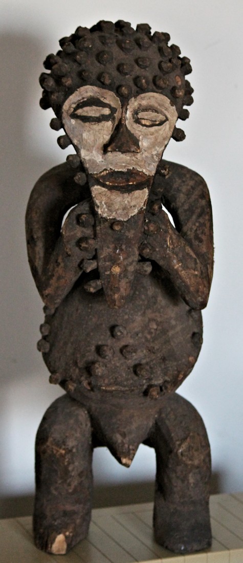 Characterized by exaggerated features, including an elongated, somewhat heart-shaped face, protruding belly, & bent-knee stance, the figure is adorned with wooden pegs across the head & brow, outlining the face & chin, & on the torso. The face & eyes are accentuated by an application of white pigment.