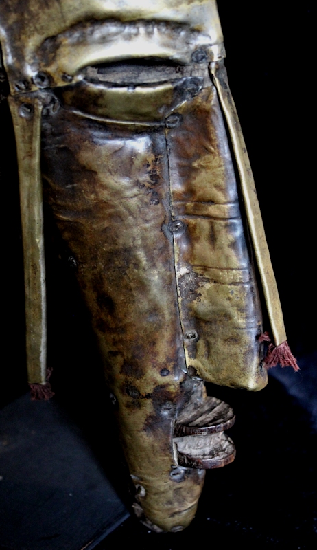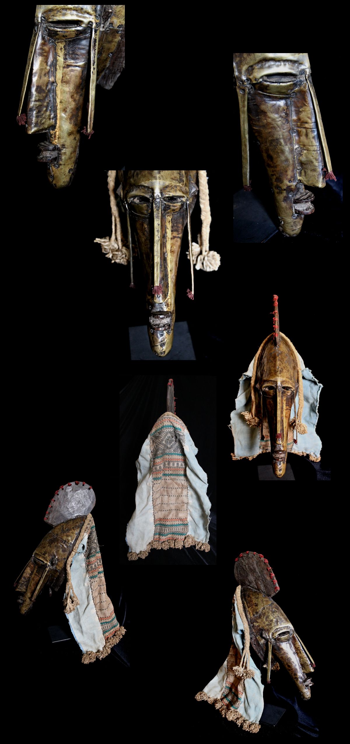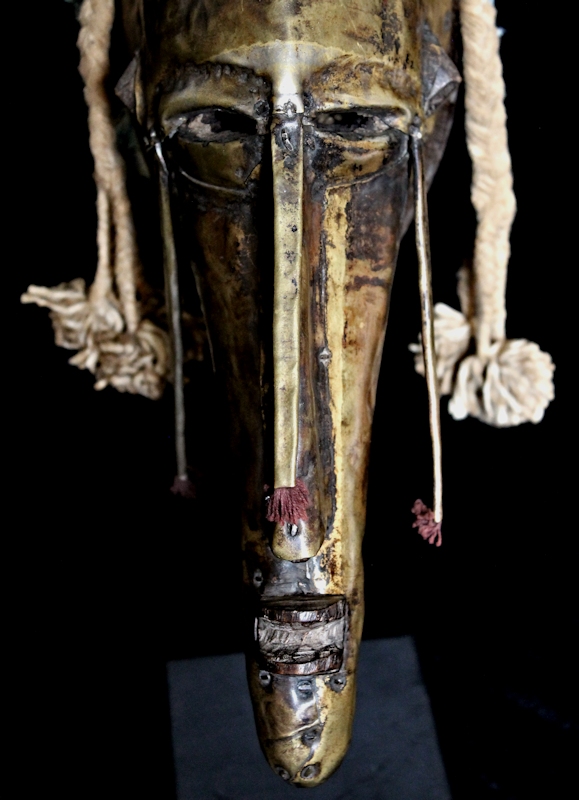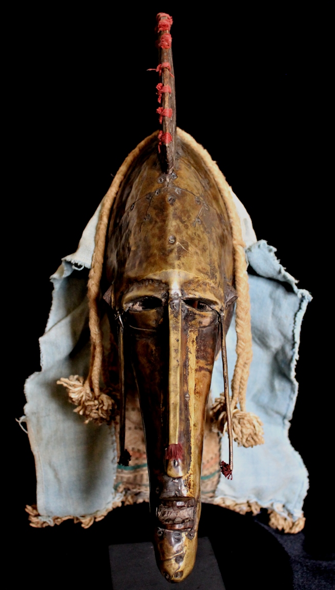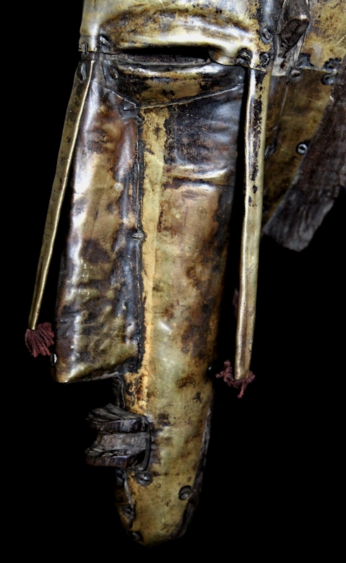 The surface of the characteristically narrow, elongated face has been sheathed with thin sheets of brass. Representing the tears & blood induced during the circumcision ceremony, slender pendulous brass strips tipped with red fringe are attached on either side of the eyes & along the length of the nose. Also accented by red threads, a wooden crest crowns the mask, while braided, multi-tasseled threads frame the face. A colorful fringed & embroidered cloth is attached to the mask & would be used to help hide the wearer. Although such a cloth can be changed during the life of a mask, this may well be the original fabric.