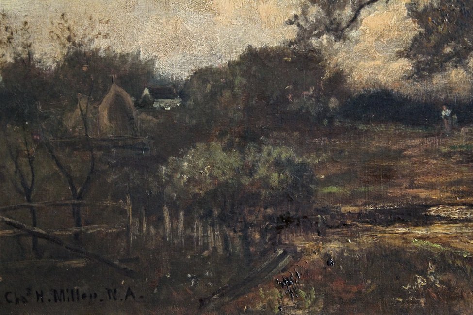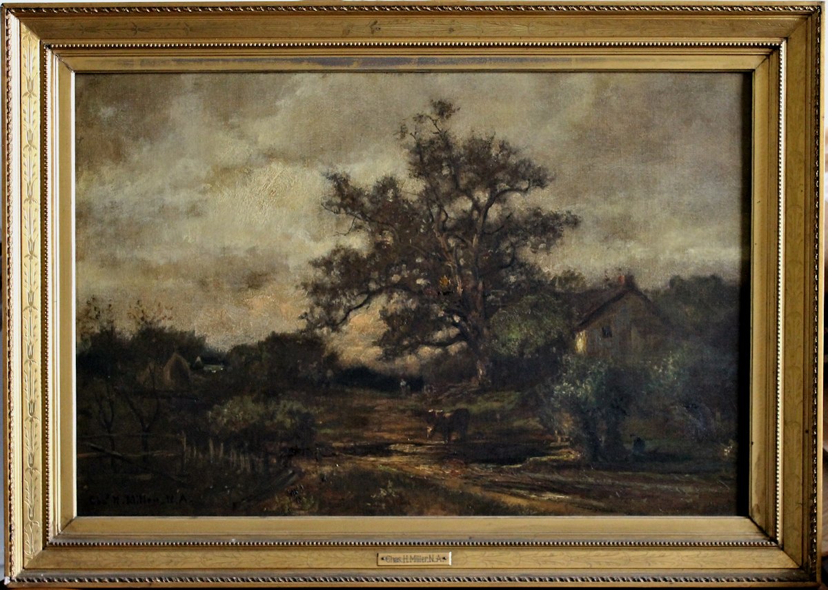 From our private collection, on offer is this expressive oil painting of a rural scene by listed turn-of-the-century American artist, Charles Henry Miller (1842 - 1922). Noted for his superb & masterfully executed landscapes of Long Island, Miller's work is housed in numerous venerated collections including those of such notable museums & institutions as the Metropolitan Museum of Art (NYC) & the Brooklyn Museum of Art (Brooklyn, NY). Important exhibitions of his work included those at the Corcoran Gallery of Art (Washington, DC), the Art Institute of Chicago, & the Paris International Exposition (France).