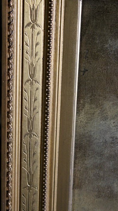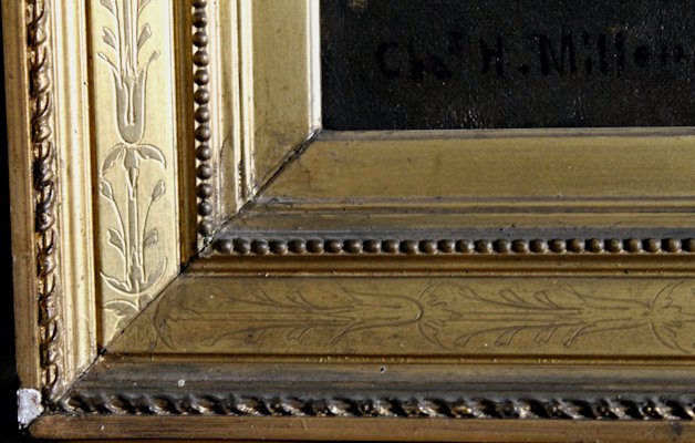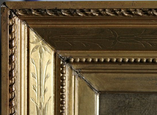 Signed by the artist, this evocative painting is in very good antique condition. The original gilt frame features beautiful detailing, with a nameplate bearing the artist's name appearing along the bottom, centered just below the canvas. Despite a couple of small chips on the left side of the frame at both upper & lower corners (pictured), the frame is also in very good antique condition.