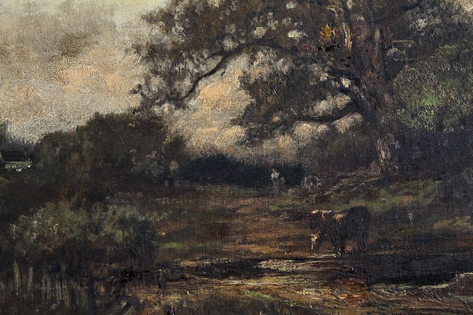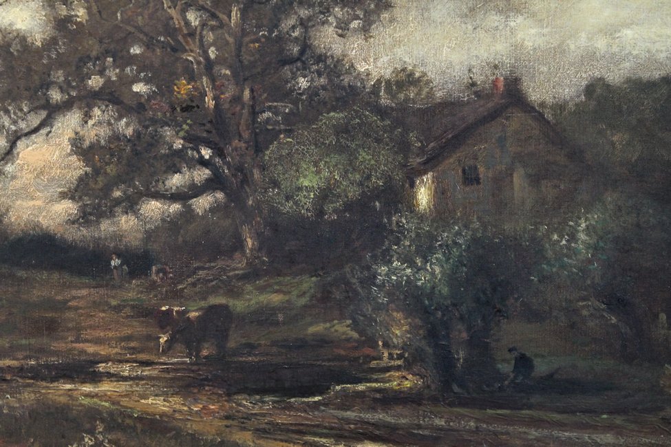 With an eye towards more realism, Miller's work is reminiscent of, but less romantic than, the output of the Hudson River school of artists. The scene he has captured here is that of a country farm. A figure appears along a dirt path, while a pair of cows further down the same path are set closer to the foreground, with one drinking from a small pond. Another figure can be seen towards the right of the canvas, kneeling at the base of a bush, apparently planting or harvesting. A house is set further back from the kneeling figure. What appears to be a barn & another structure can be seen at the left of the canvas. A fence is found in the foreground at the lower left of the painting. A large shade tree, possibly an old oak, stands near the house. Other bushes & trees fill the landscape under a cloud-filled sky.