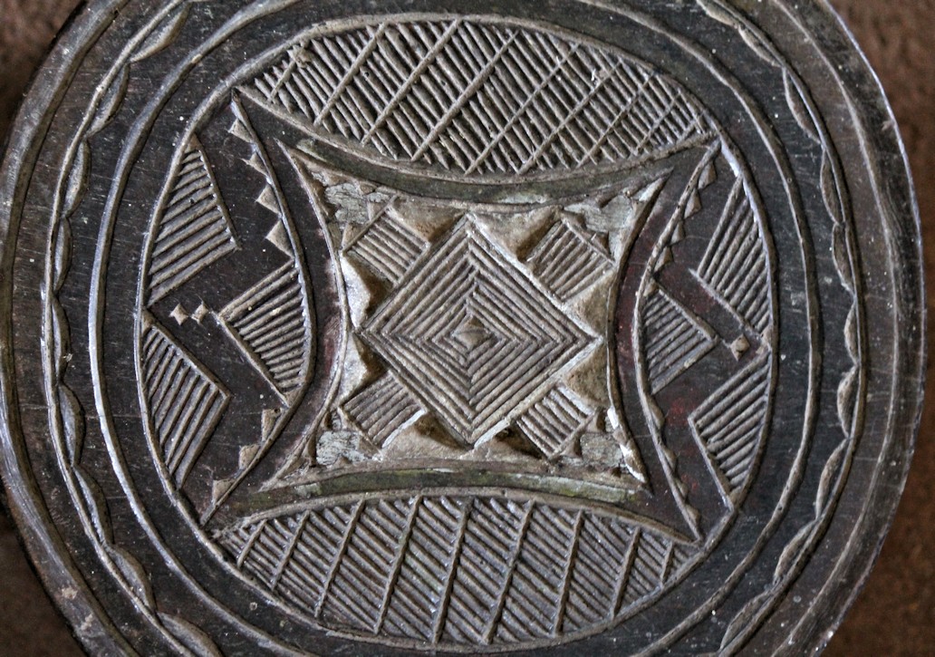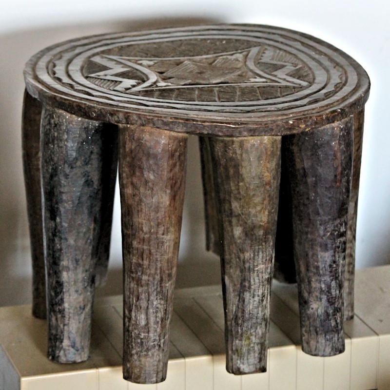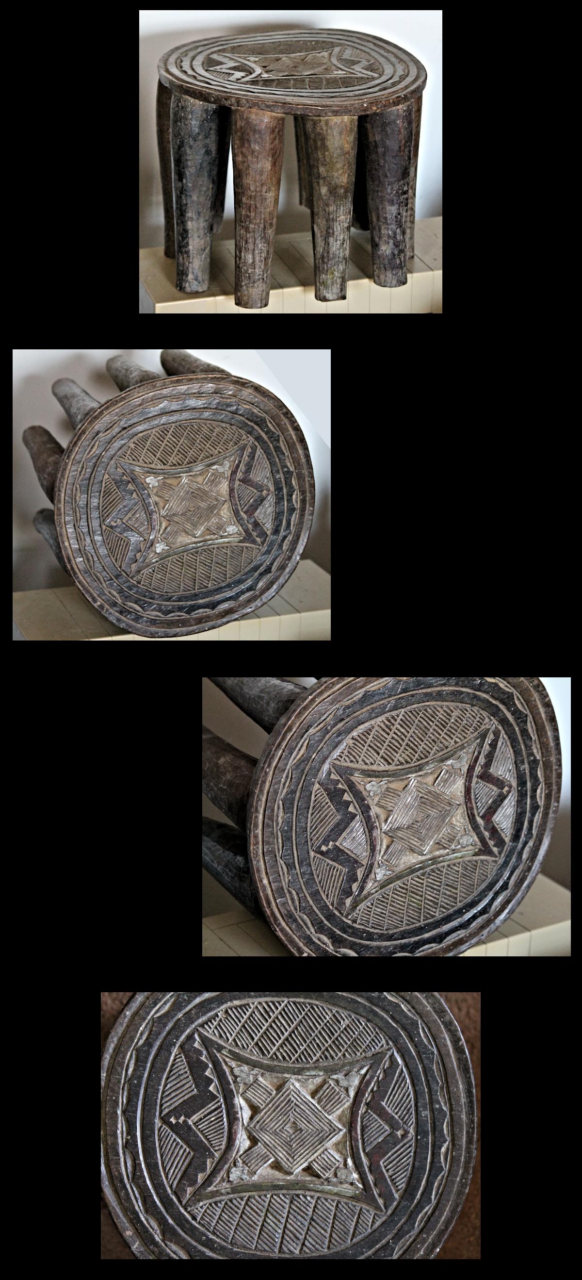 Overall condition: good. General wear & tear, with scrapes, abrasions, & chips. There is old damage to the bottom of one leg, with an uneven 1/2-inch piece missing. Old patina. This handsome stool shows significant age- & use-related wear, & would make an excellent addition to any serious ethnographic collection.