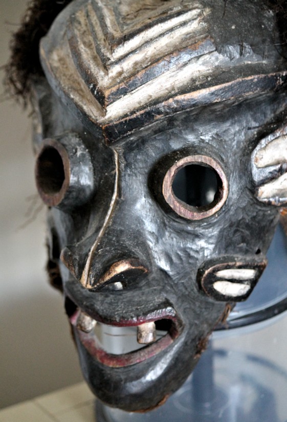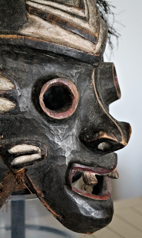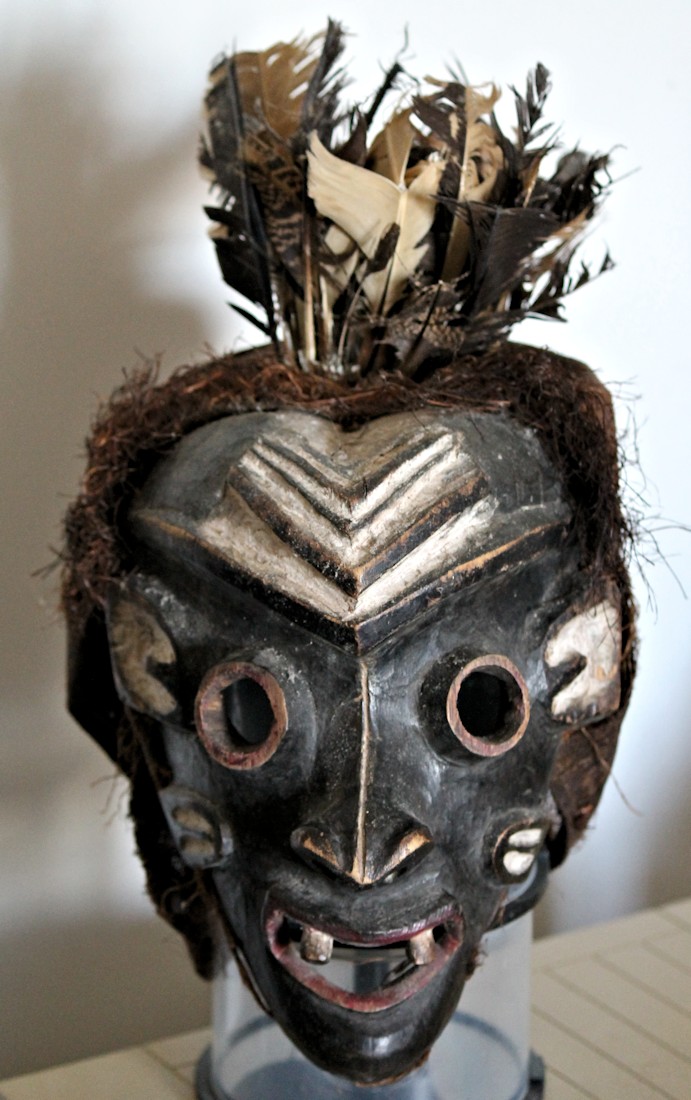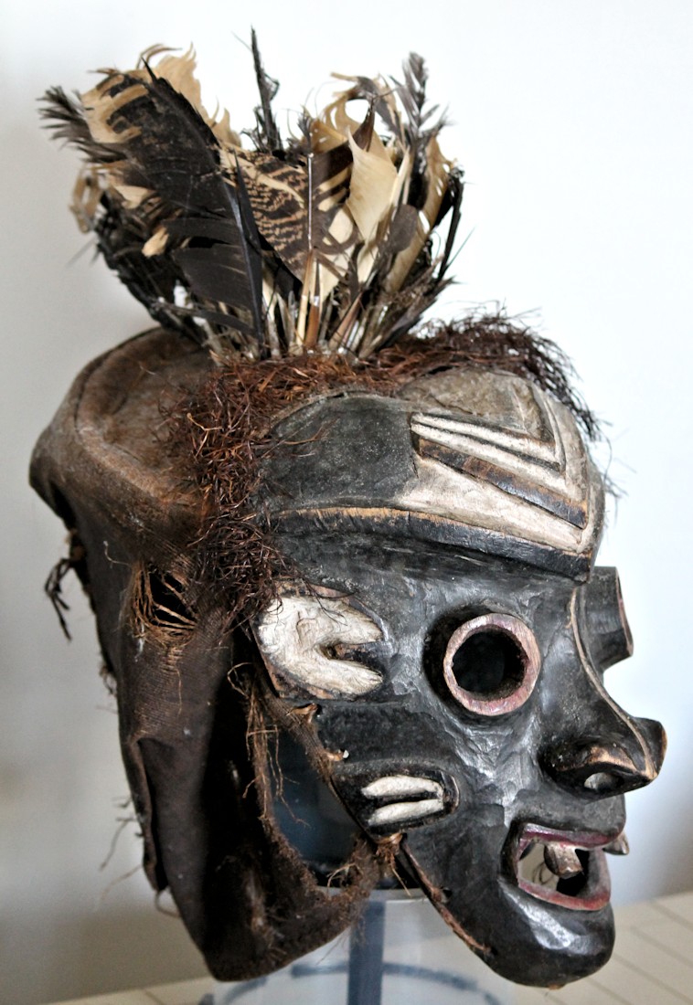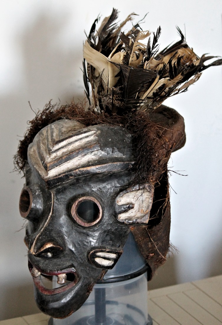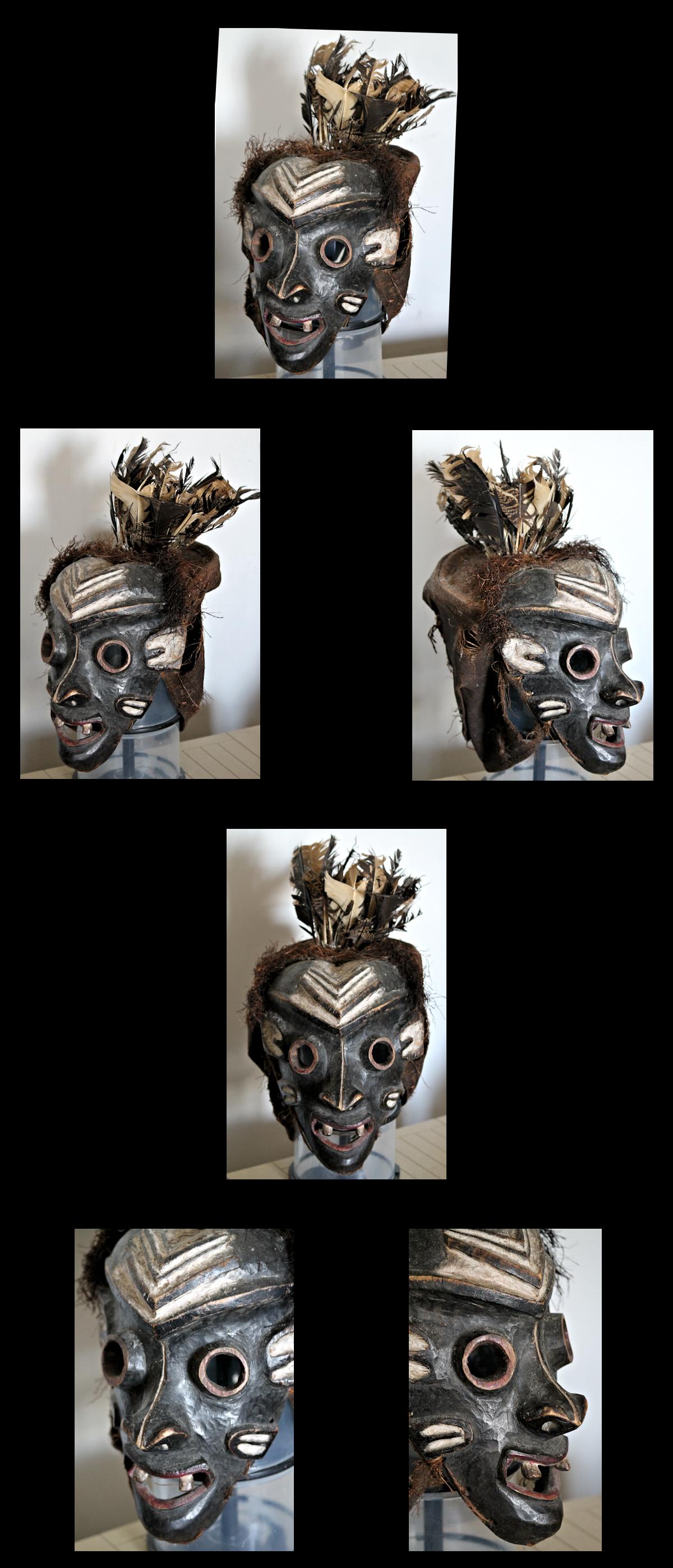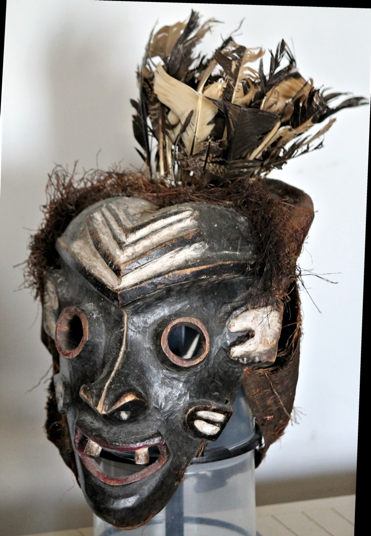 Unusual in form, the facial features of this exceptional mask reveal the carver's remarkable expertise & attention to detail -- the tubular eyes, refined structure of the nose with its flared nostrils, & open mouth with bared teeth are all executed with the utmost of skill. Raised scarifications highlight the brow & cheeks. Applied pigments accentuate all of these outstanding features. Adorning the top of the mask is a crown of brilliantly displayed feathers with raffia, attached to the fabric-covered basketry frame of the headdress.